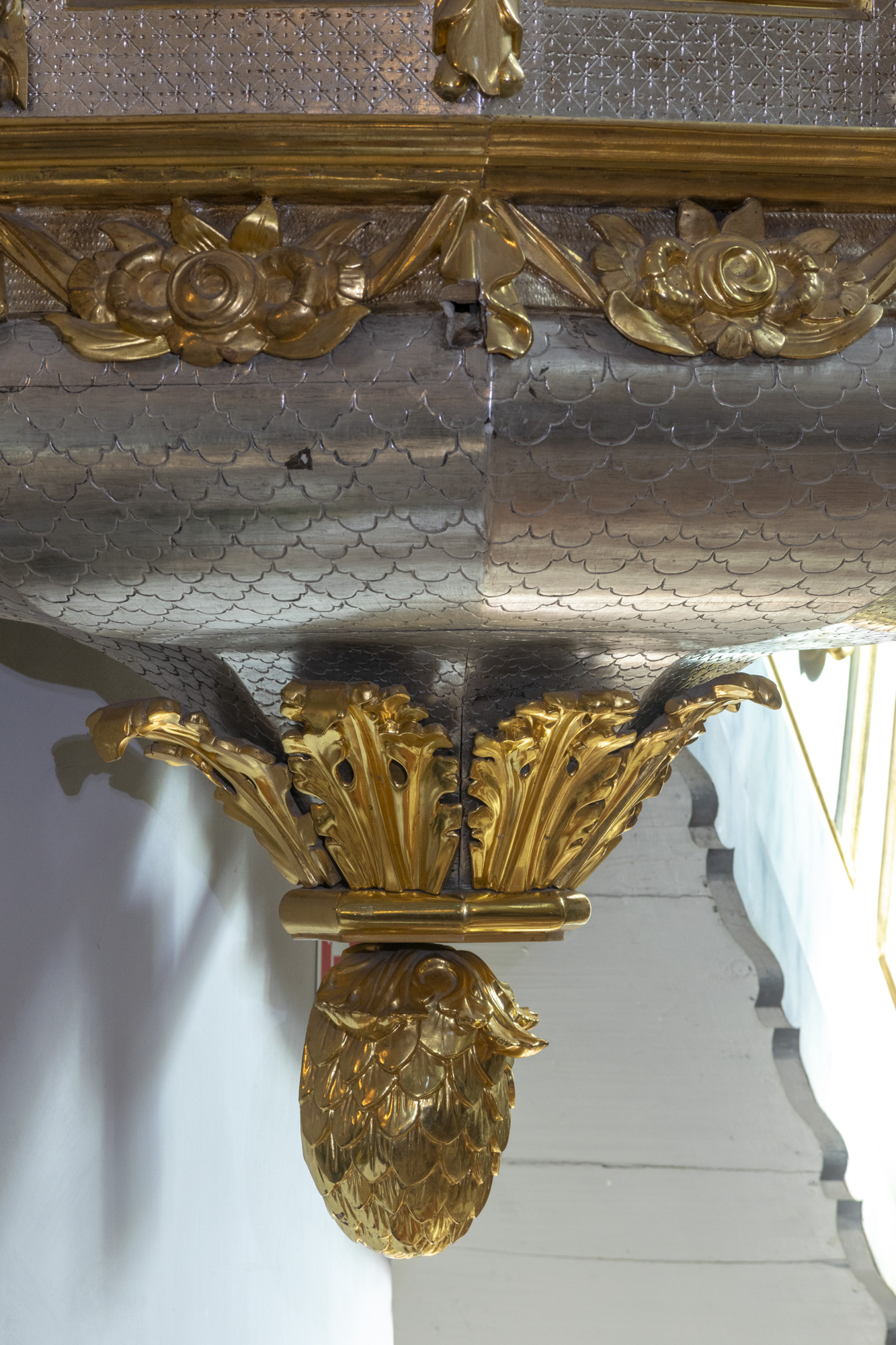 Ambona przyścienna, wisząca, ze schodkami i balustradą przy nich. Kosz kilkuścienny, ze zwisem o wypukło i wklęsło formowanym spłaszczonym zarysie, zakończonym szyszką. Kosz, podobnie balustrada, zdobione płaskorzeźbami o motywach roślinnych. Baldachim wielościenny, ujęty wokół belkowaniem gierowanym, stożkowy, zakończony kulą z krzyżykiem. Ambona malowana na srebrno i cielisto, ze złoceniami elementów rzeźbiarskich. |
