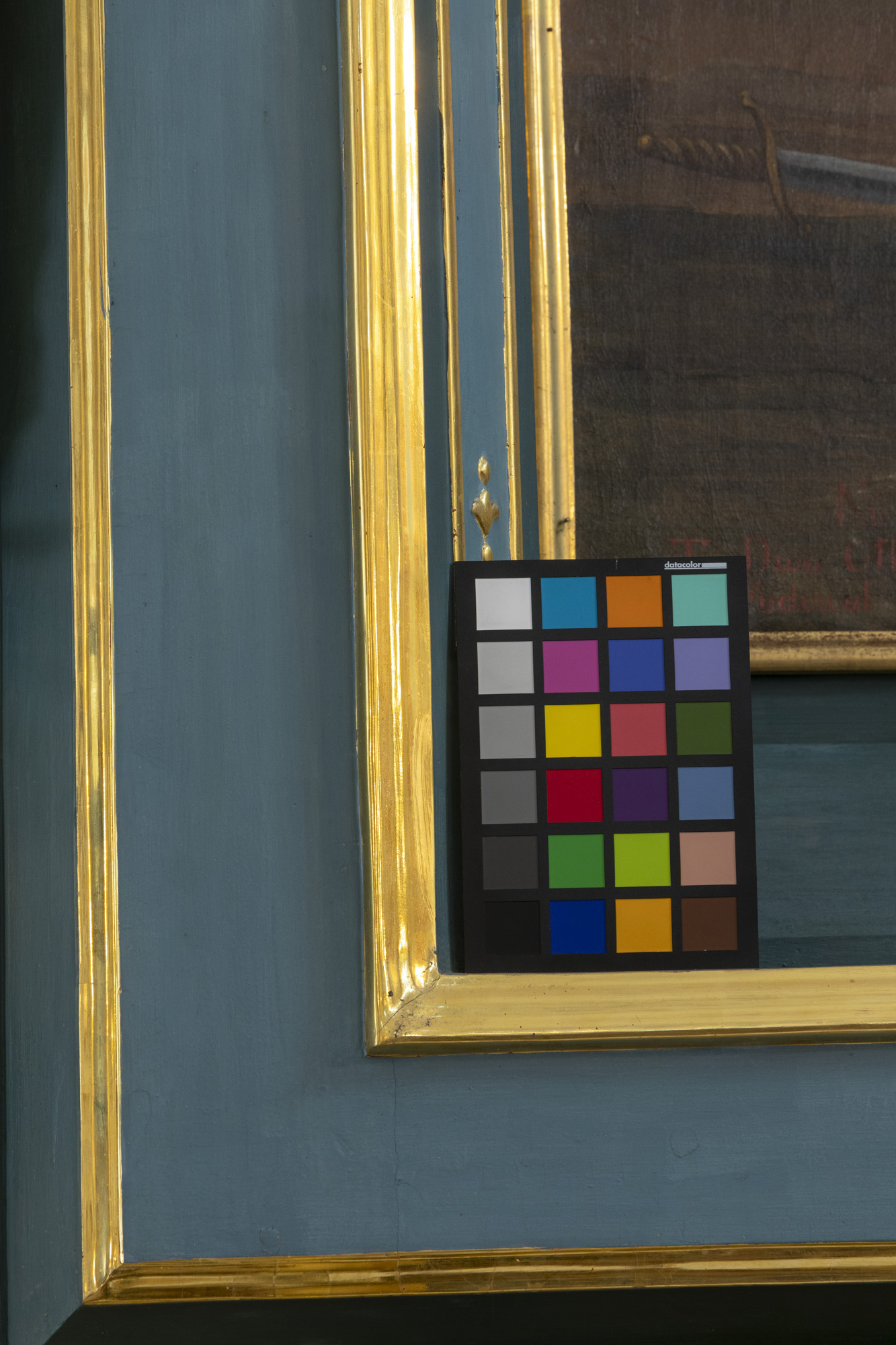 Obraz przedstawia świętą stojącą w kontrapoście, z kielichem i hostią w prawej ręce, w sukni przewiązanej w pasie, w płaszczu przykrywającym plecy, szeroko drapowanym na biodrach, rozłożyście opadającym prawie do stóp. Z prawej strony, na drugim planie okrągła wieża, przed świętą z lewej strony leży miecz. |