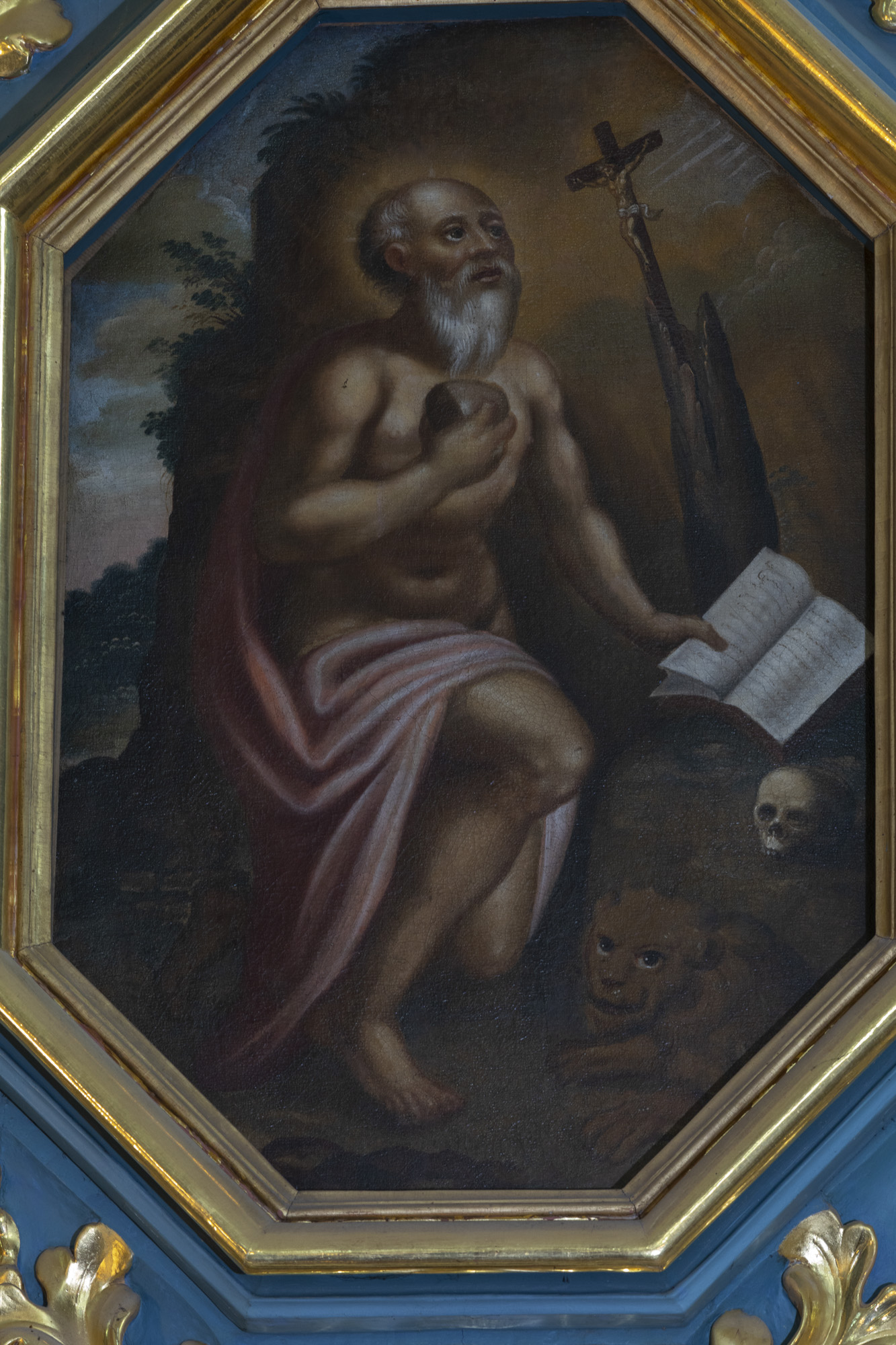Święty klęczący na jednym kolanie, postać przedstawiona w półprofilu prawym, przed nim otwarta księga, którą podtrzymuje lewą dłonią. Szata okrywa plecy i biodra, grubo sfałdowana. Włosy i broda siwa, twarz dość szeroka, budowa ciała silna, umięśniona. Przed świętym krucyfiks, czaszka i głowa lwa. W tle ciemne krzewy, otwierające się z lewej strony na fragment nieba z chmurami. Koloryt brązowo-złoty, tło brązowe, ciało świętego cielisto-brązowe, szata cielisto-szaro-różowa, niebo szare w dole rozjaśnione. Obraz w górnej części ołtarza. |