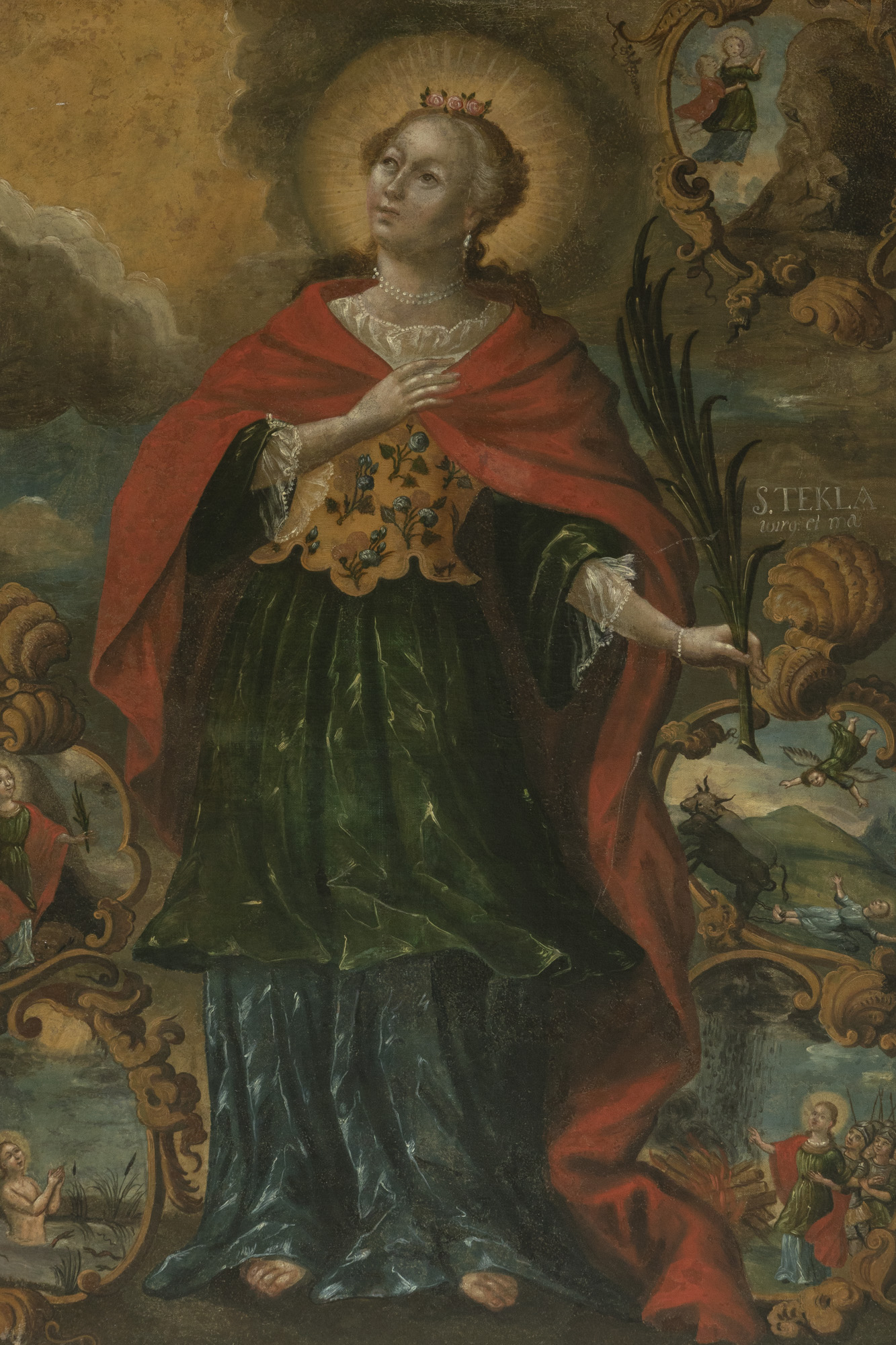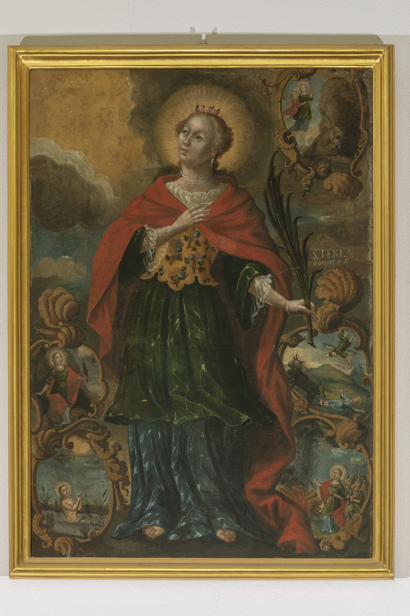 Prostokątny. Kompozycja osiowa, jednoplanowa, narracyjna, na tle skłębionych ugrowo-brązowych obłoków u góry oraz zielono-brunatnego pasa ziemi u dołu, jednopostaciowa. Narracyjne pola-tonda w formie nieregularnych pól kartuszowych obwiedzione akantowo-rolwerkowym ornamentem, dwa z lewej strony obrazu, trzy z prawej. Święta na osi, w całej postaci, ujęta "en face", stoi w lekkim kontrapoście na prawej nodze. Noga lewa lekko ugięta w kolanie. Ręka prawa złożona na piersi, lewa opuszczona i odchylona na zewnątrz, w dłoni gałązka palmowa. Głowa uniesiona i zwrócona w lewą stronę. Twarz okolona zaczesanymi do tyłu włosami. Na głowie malutka różowa korona. Wokół głowy złocista aureola. Ubrana w niebieską, długą suknię, zarzuconą na nią zieloną, rozkloszowaną spódnicę z długimi i szerokimi rękawami, ugrowo-złocisty gorset oraz białą bluzkę z rękawami. Na plecach i ramionach spięty pod szyją czerwony płaszcz. Cztery pola narracyjne u dołu obrazu, piąte u góry w prawym narożniku, w układzie jedno nad drugim. Pod prawym górnym tondem napis: S.TEKLA/ wirg. et ma. W górnym tondzie lewej strony klęcząca postać świętej, w dolnym święta w rzece, ujęta do bioder, naga. W tondzie górnym prawym święta "w locie" przed skała, środkowym wół, leżący oracz i opadający z niebios anioł, w dolnym prawym płonący stos drewna, przed nim święta, za nią żołnierze.