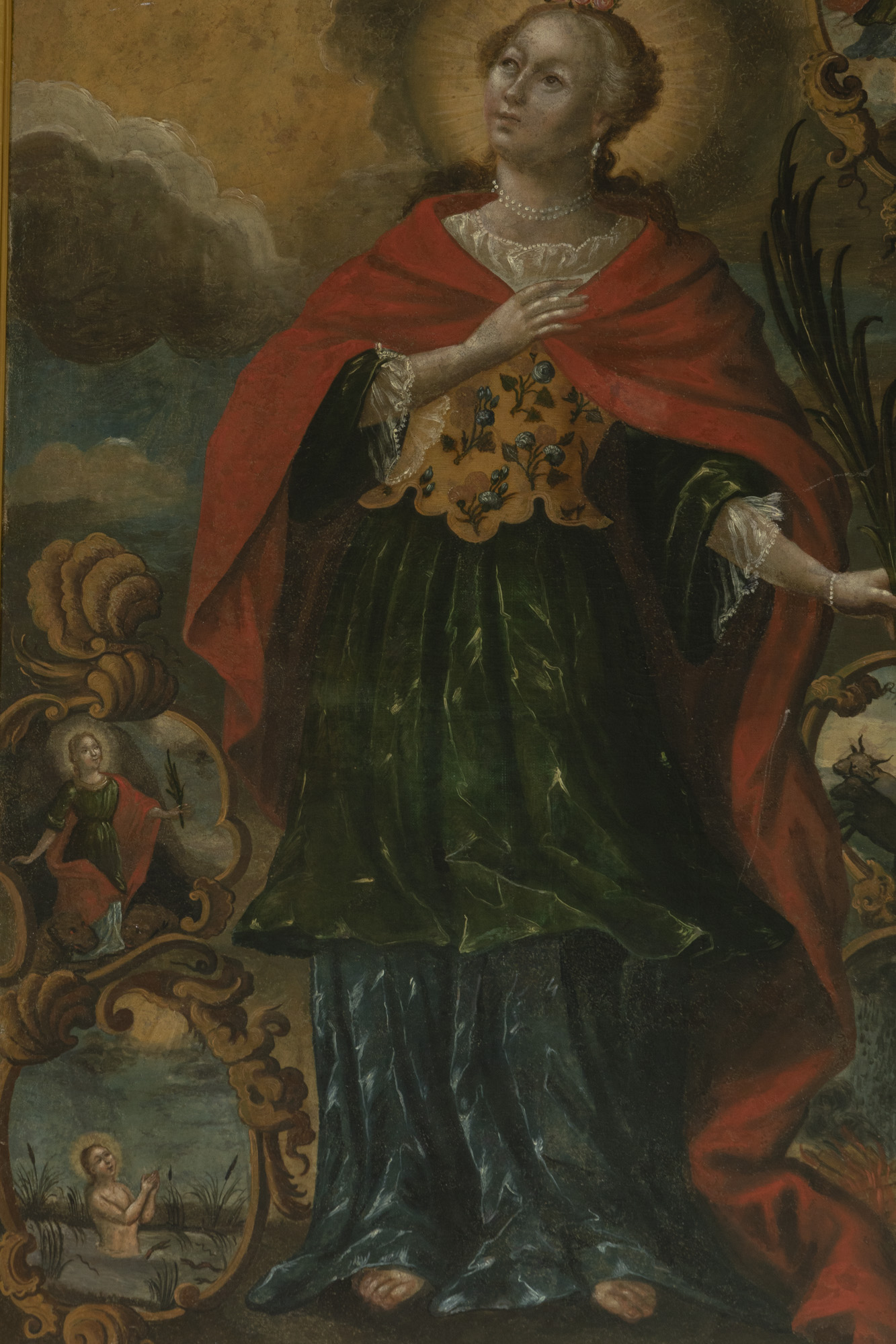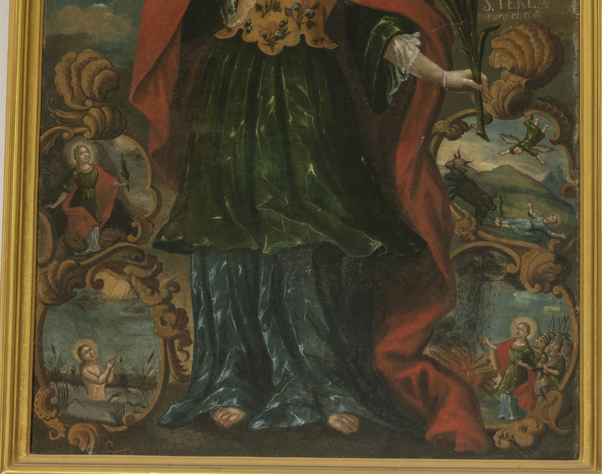Prostokątny. Kompozycja osiowa, jednoplanowa, narracyjna, na tle skłębionych ugrowo-brązowych obłoków u góry oraz zielono-brunatnego pasa ziemi u dołu, jednopostaciowa. Narracyjne pola-tonda w formie nieregularnych pól kartuszowych obwiedzione akantowo-rolwerkowym ornamentem, dwa z lewej strony obrazu, trzy z prawej. Święta na osi, w całej postaci, ujęta "en face", stoi w lekkim kontrapoście na prawej nodze. Noga lewa lekko ugięta w kolanie. Ręka prawa złożona na piersi, lewa opuszczona i odchylona na zewnątrz, w dłoni gałązka palmowa. Głowa uniesiona i zwrócona w lewą stronę. Twarz okolona zaczesanymi do tyłu włosami. Na głowie malutka różowa korona. Wokół głowy złocista aureola. Ubrana w niebieską, długą suknię, zarzuconą na nią zieloną, rozkloszowaną spódnicę z długimi i szerokimi rękawami, ugrowo-złocisty gorset oraz białą bluzkę z rękawami. Na plecach i ramionach spięty pod szyją czerwony płaszcz. Cztery pola narracyjne u dołu obrazu, piąte u góry w prawym narożniku, w układzie jedno nad drugim. Pod prawym górnym tondem napis: S.TEKLA/ wirg. et ma. W górnym tondzie lewej strony klęcząca postać świętej, w dolnym święta w rzece, ujęta do bioder, naga. W tondzie górnym prawym święta "w locie" przed skała, środkowym wół, leżący oracz i opadający z niebios anioł, w dolnym prawym płonący stos drewna, przed nim święta, za nią żołnierze. |