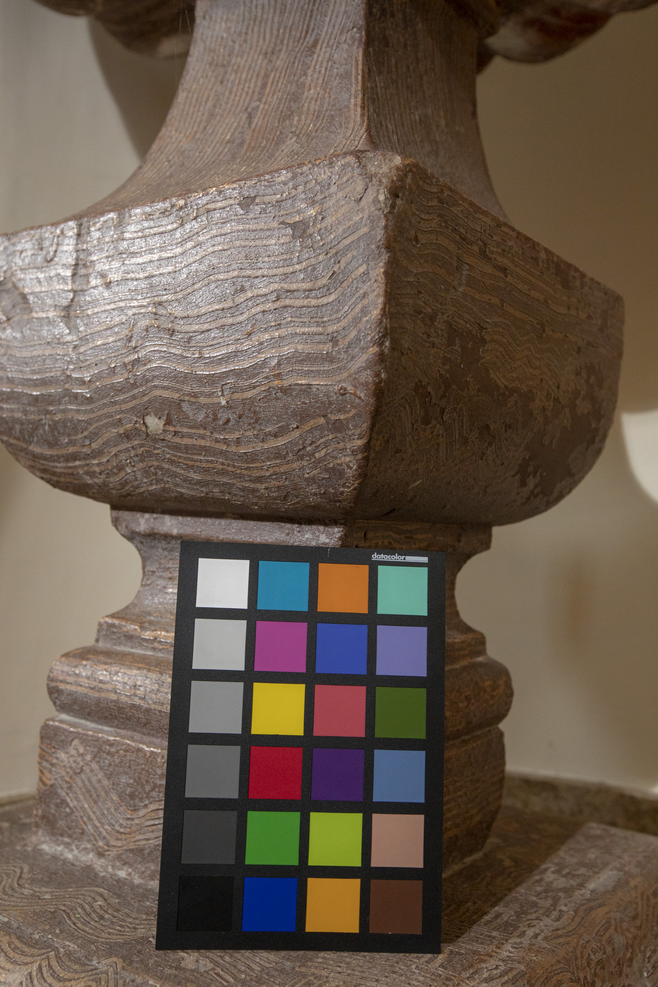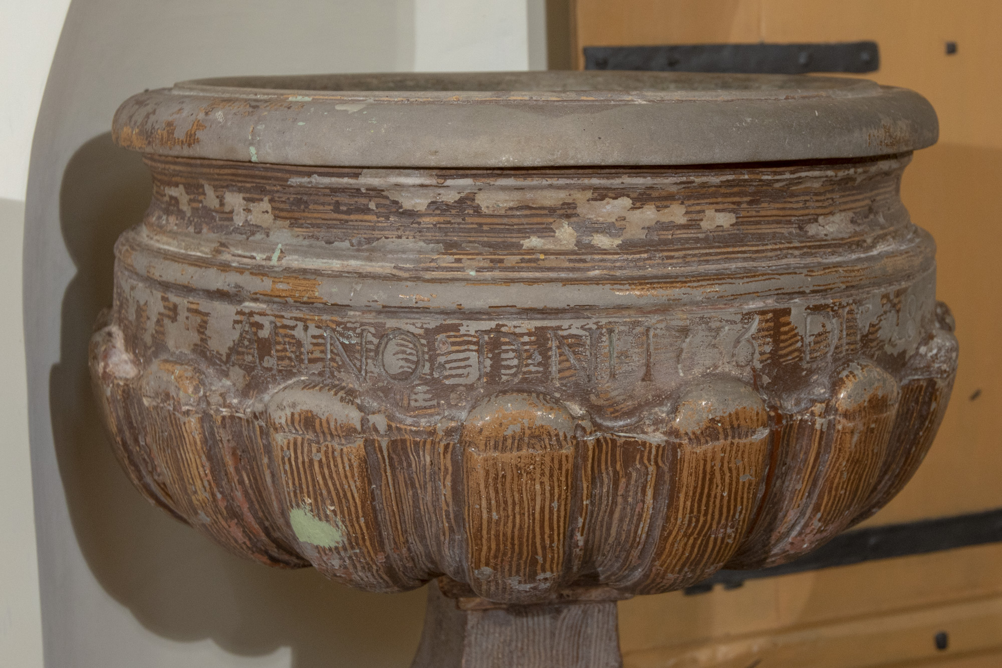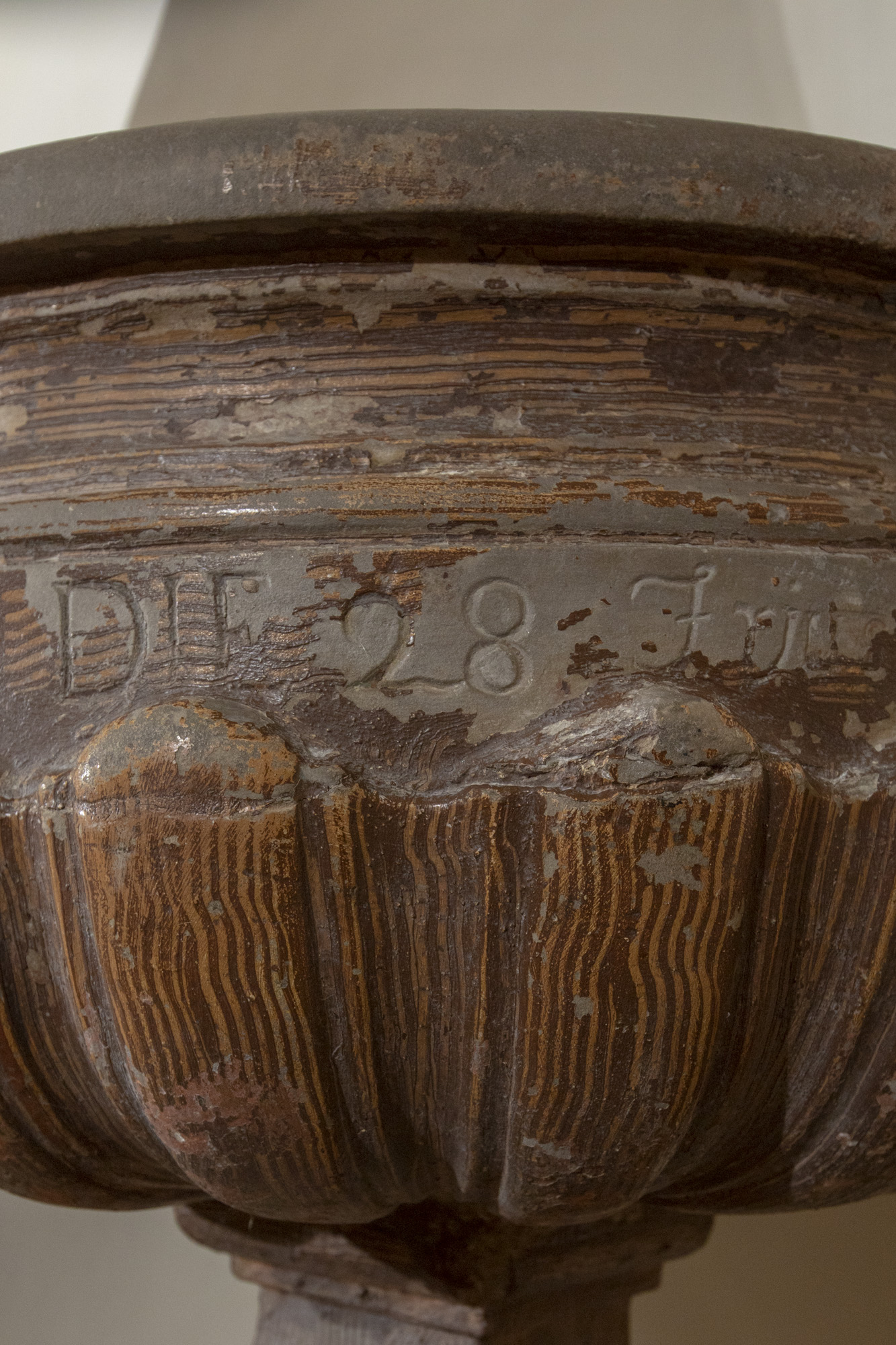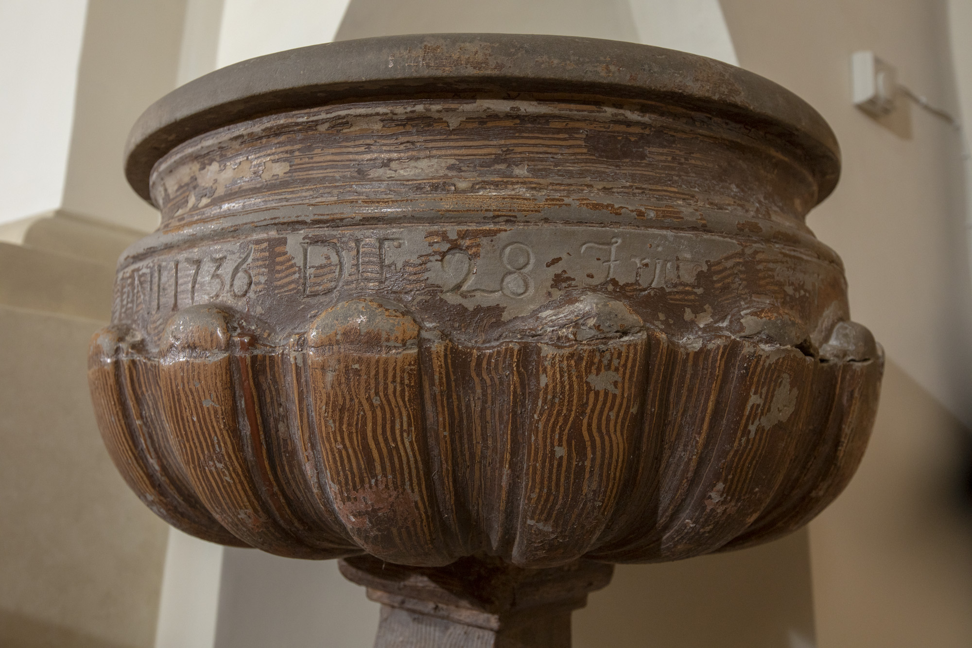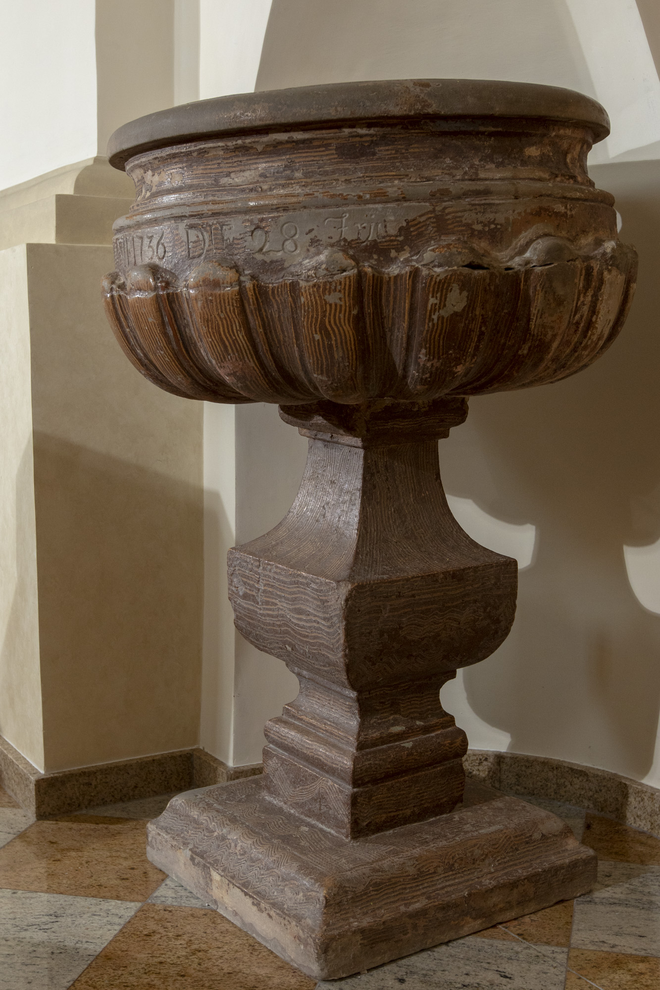 Na kwadratowej, płaskiej, sfazowanej w obrzeżu stopie - trzon czterogranny, tralkowy. Czasza półkulista, spłaszczona, ujęta od spodu puklowanym muszlowo koszem. Część górna profilowana wklęśle z wywiniętym półwałkowo wylewem. Nad koszem napis kuty: "ANNO: DNI, 1736 DIE 28 7 bris". W spodzie czaszy wydrążone gniazdo do osadzenia na trzonie |
