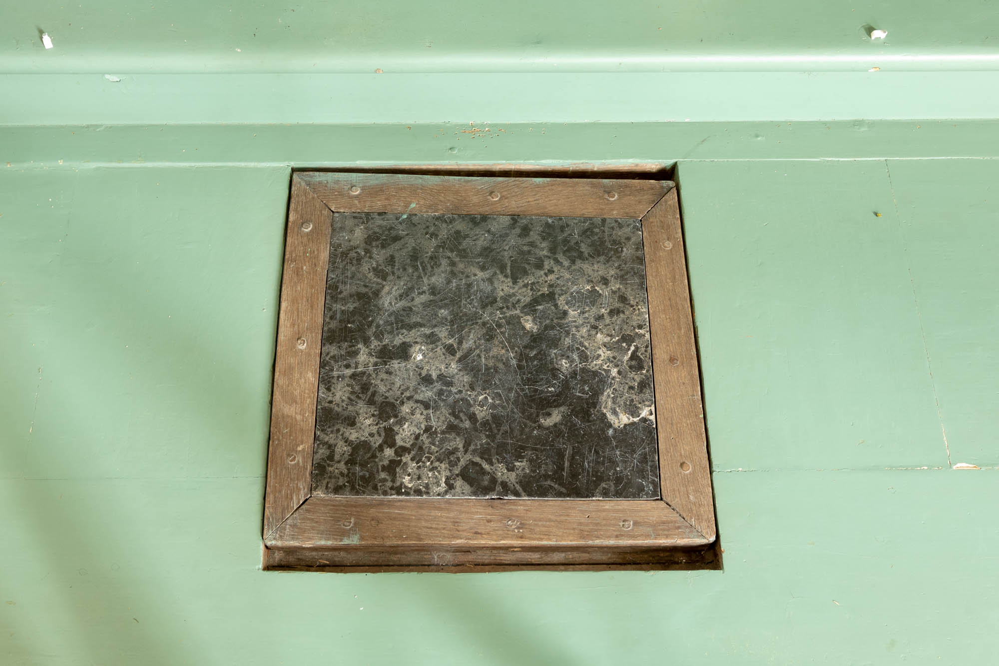 Kwadratowa tablica z popielatego marmuru oprawiona w drewnianą ramkę. Na odwrocie inskrypcja tuszem w jęz. łacińskim oraz czerwona lakowa pieczęć na wnęce na relikwie. |