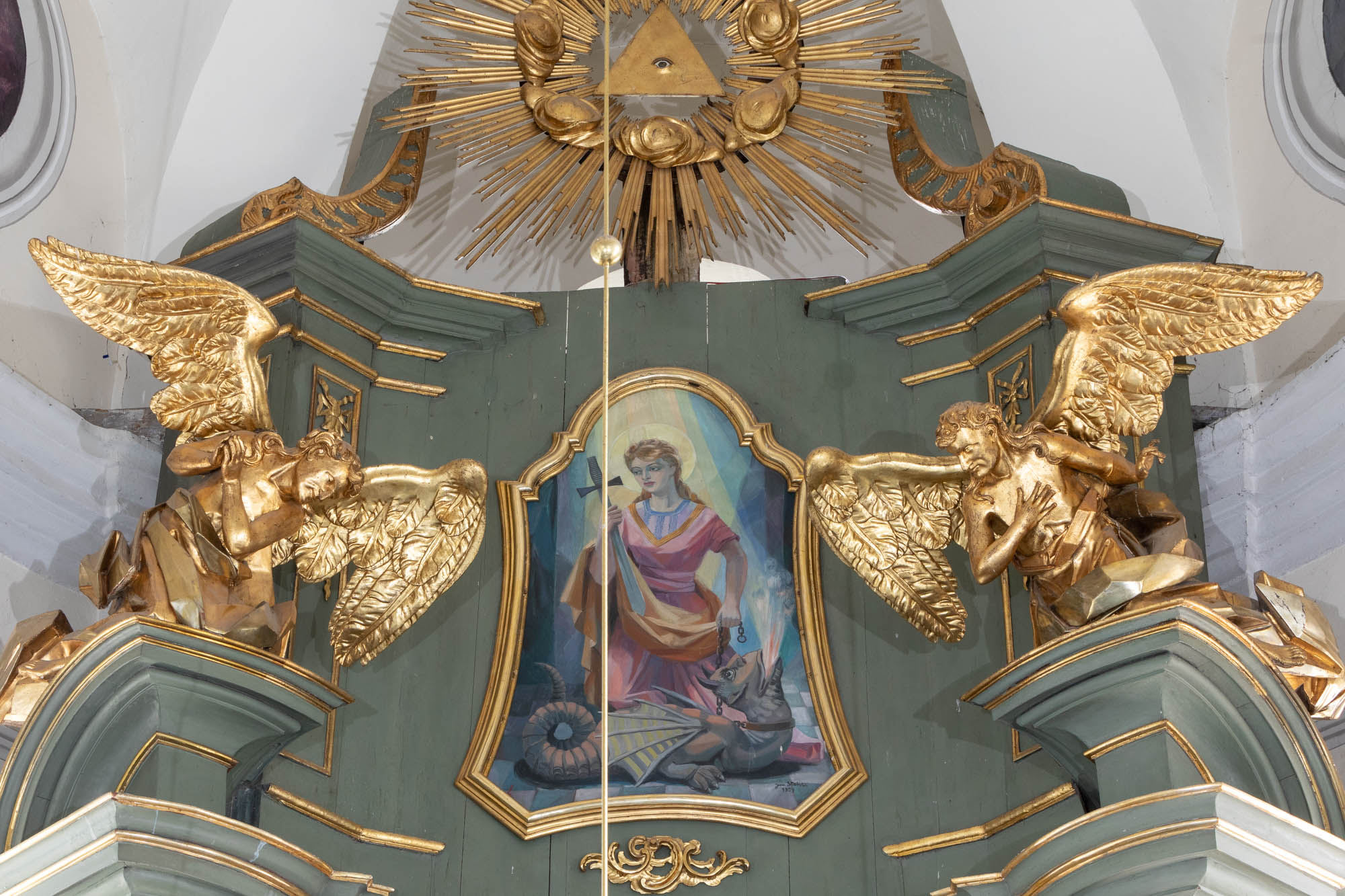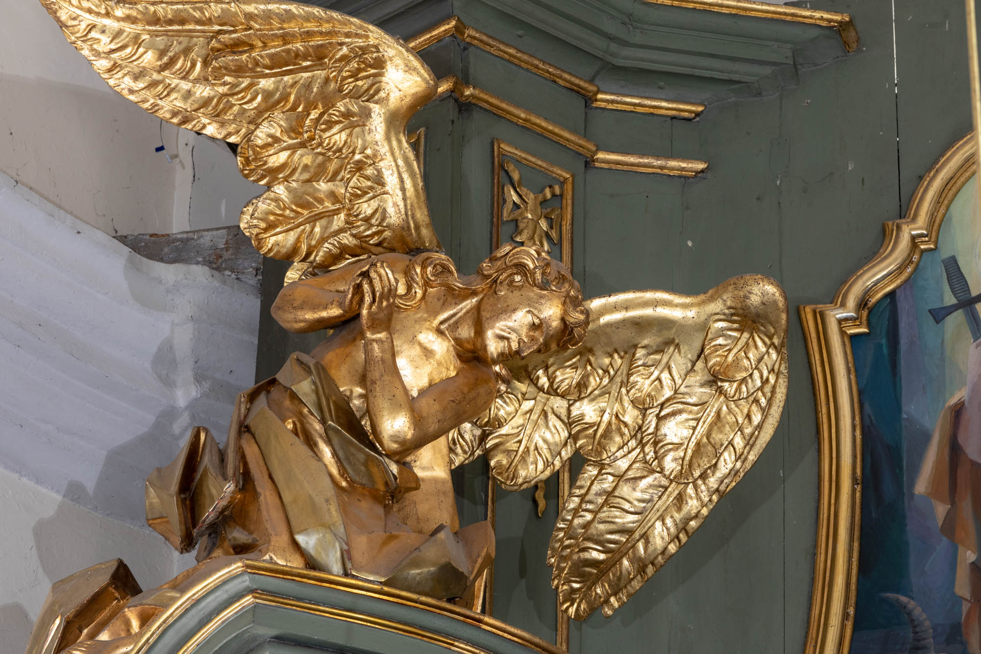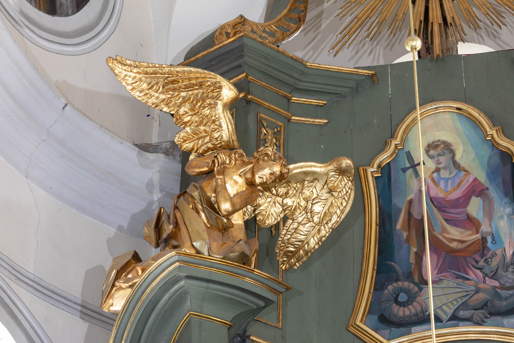 Postać w przyklęku, umieszczona na przerwanym przyczółku belkowania. Tułów wychylony do przodu, głowa i wzrok zwrócone w dół w stronę obrazu retabulum. Ręce złożone modlitewnie przed sobą. Pierś odsłonięta ze spływającymi lokami włosów. Suknia dołem silnie sfałdowana, na plecach rozwiana. Skrzydła szeroko rozpostarte. Rzeźba w całości złocona. |