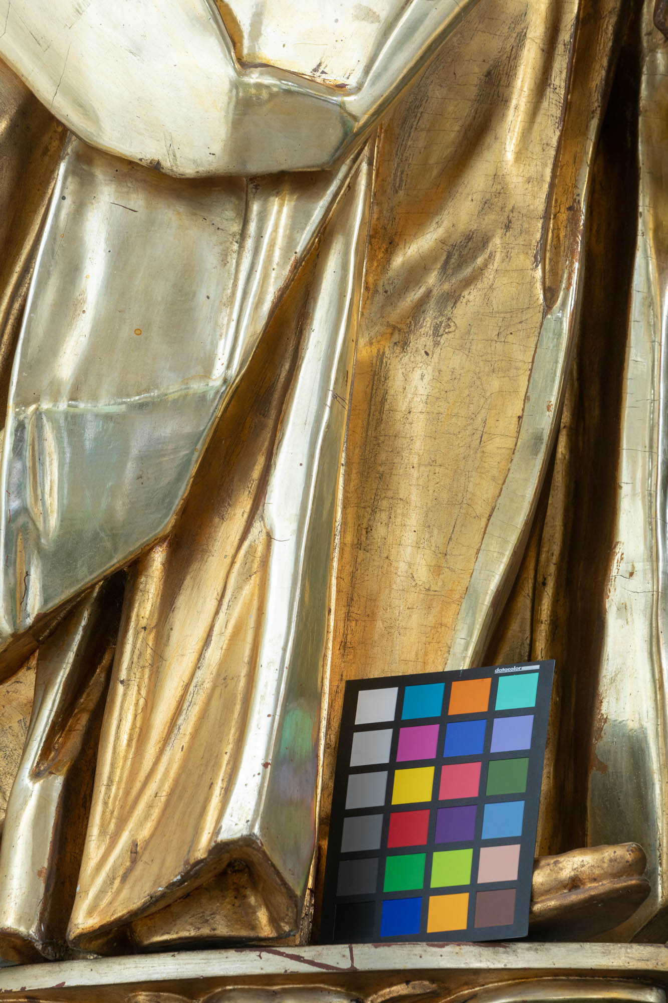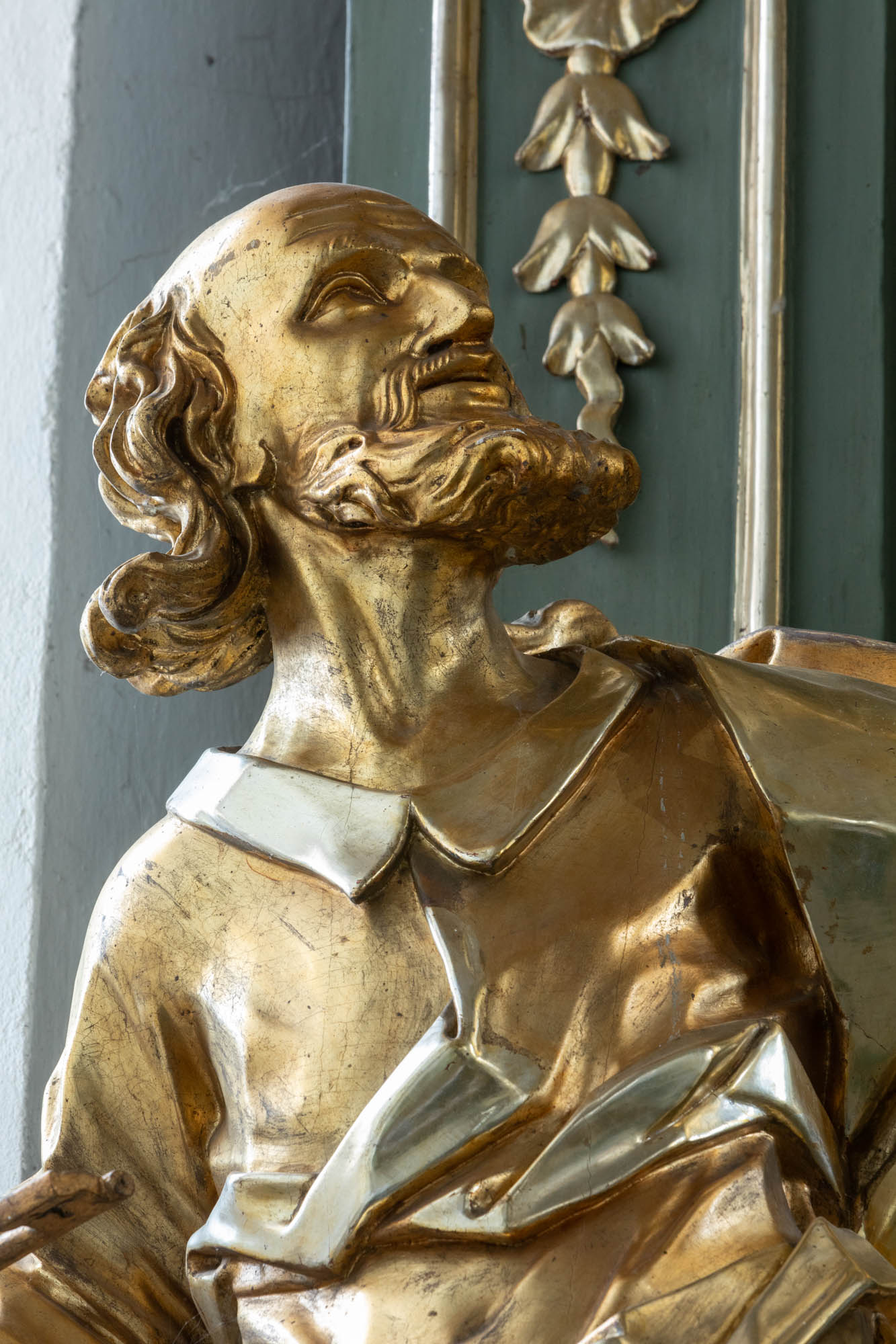 Postać stojąca frontalnie, tułów lekko wygięty w lewo, głowa odchylona do tyłu, wzrok skierowany ku górze; Lewa ręka zgięta w łokciu i uniesiona w górę, w prawej lekko zgiętej klucze - atrybut postaci. Święty ubrany w długą suknię odsłaniającą stopy opięte rzemykami sandałów oraz w narzucony na suknię płaszcz spływający przez lewe ramię na prawe biodro. Twarz okolona zarostem, czoło wysokie, włosy długie opadające lokiem na lewe ramię. Rzeźba drążona, w całości złocona. |
