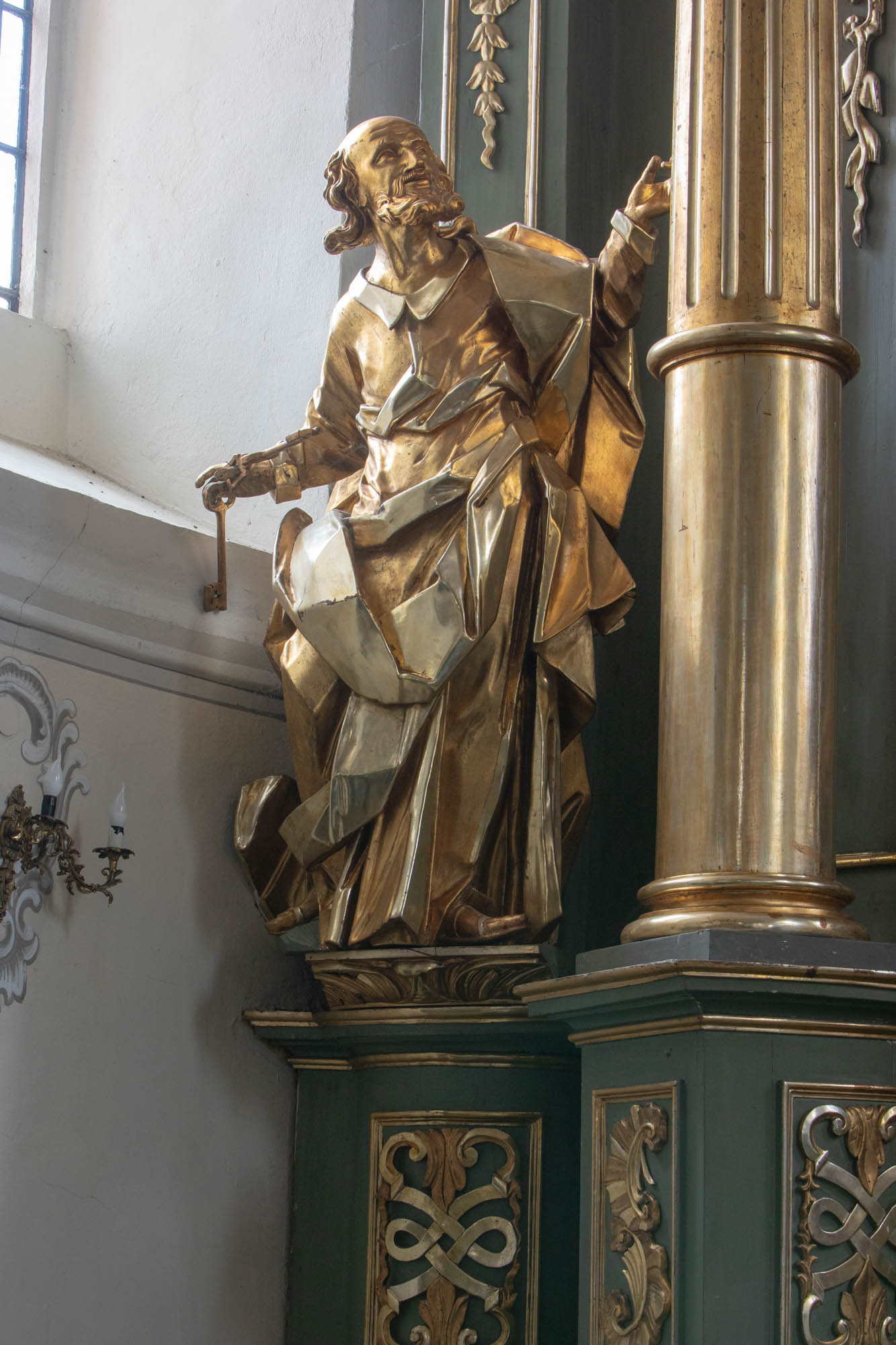 Postać stojąca frontalnie, tułów lekko wygięty w lewo, głowa odchylona do tyłu, wzrok skierowany ku górze; Lewa ręka zgięta w łokciu i uniesiona w górę, w prawej lekko zgiętej klucze - atrybut postaci. Święty ubrany w długą suknię odsłaniającą stopy opięte rzemykami sandałów oraz w narzucony na suknię płaszcz spływający przez lewe ramię na prawe biodro. Twarz okolona zarostem, czoło wysokie, włosy długie opadające lokiem na lewe ramię. Rzeźba drążona, w całości złocona.
