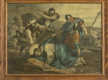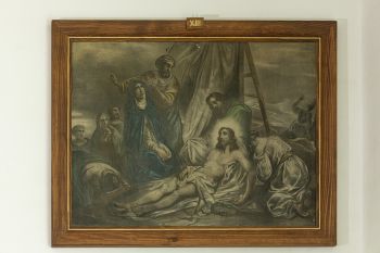 Zawieszone na ścianie nawy głównej. W technice oleodruku, ramy drewniane złocone, w górnej części z de koracją o wykroju "laubzegowym". Droga krzyżowa Chrystusa przedstawiona poprzez czternaście stacji z obrazami na których ukazano najważniejsze momenty w czasie marszu na Golgotę. W orszaku Chrystusowi towarzyszyło dwóch łotrów, żołnierze a wokół tłum z którego w końcowych scenach wyłaniają się na pierwszy plan postacie Marii Matki Bożej, św. Weroniki, św. Józefa, św. Jana. Żołnierze ubrani w zbroje, pozostali w długich obszernych szatach o barwach pastelowych, stonowanych z dominacją koloru żółtego, czerwonego, zielonego, szarości i brązów. Chrystus w białej sukni i niebieskim płaszczu, później z szat obnażony. Postacie przedstawione realistyczne, proporcje i modelunek prawidłowe. Sceny pełne ekspresji wyrażone w pozach postaci, gestach i wizerunkach twarzy.