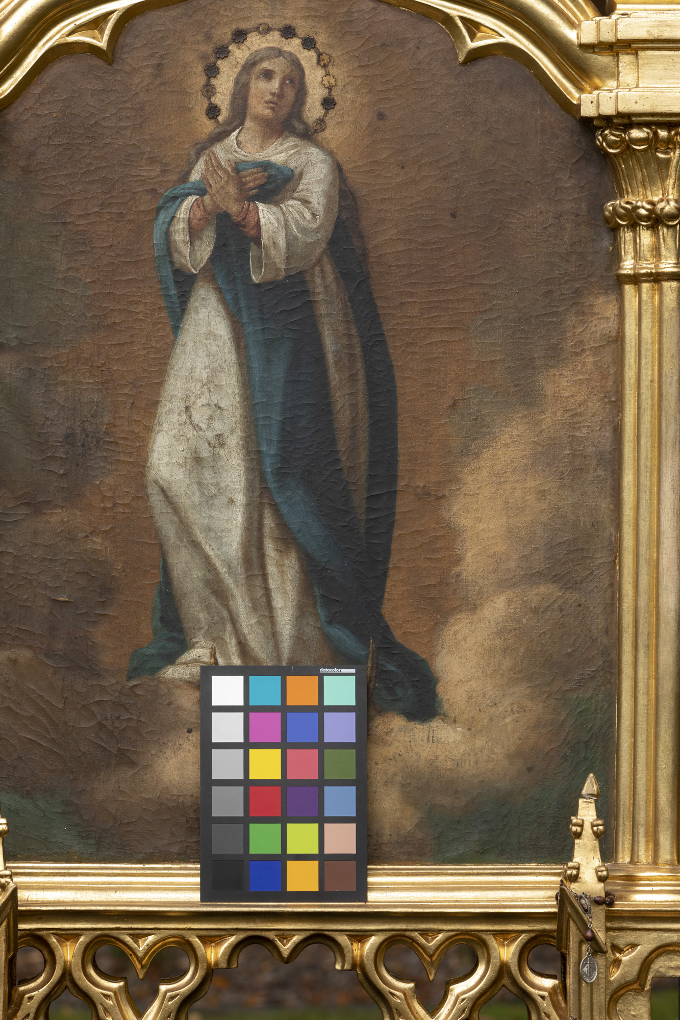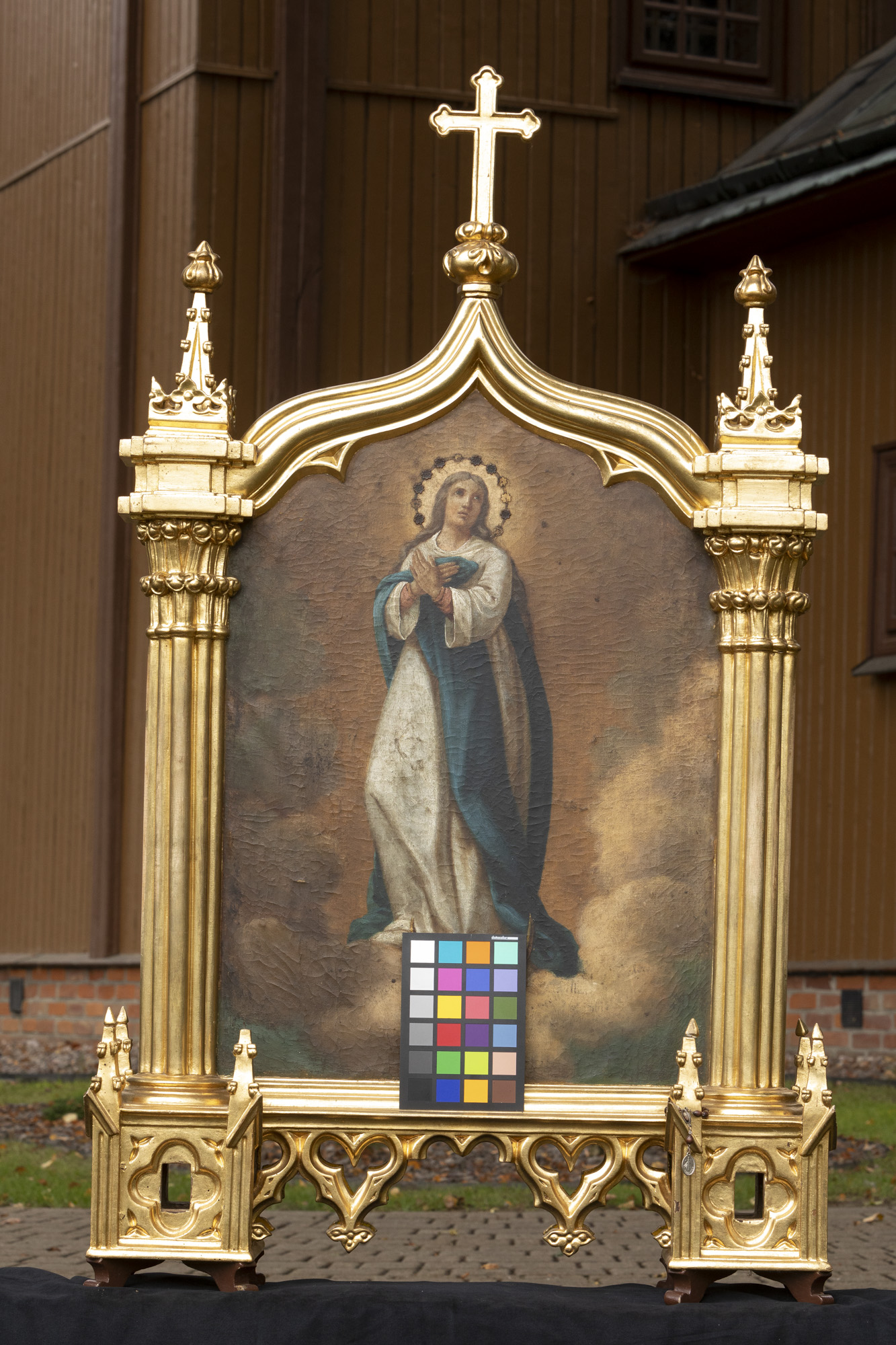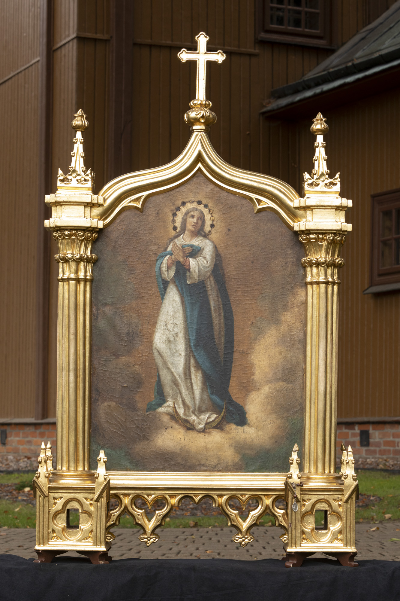 Feretron w formie obrazów olejnych na płótnie rozpiętych na umieszczonej w środku desce. Obrazy umieszczone w przestrzeni prostokątnej zamkniętej od góry łukiem oślim. W podstawie skrajne sześcienne postumenty z otworami na drążki, w górnych narożach zwieńczone pinaklami w płaszczyźnie czołowej z czteroliściem. Pomiędzy nimi ażur o wykroju sercowatym. Po bokach nastawy wiązki kolumn z głowicami palmowymi nad którymi odcinki gzymsu zwieńczone pinaklami z żabkami i kwiatonami. Krzyż w zwieńczeniu trójlistny, na podstawie z dwóch spłaszczonych kul z ornamentem roślinnym. Z jednej strony pełna postać M. Bożej ujętej frontalnie stojącej na półksiężycach wśród obłoków, spoglądającej do góry, z rękami skrzyżowanymi na piersiach. Szaty obszerne: biała suknia, niebieski płaszcz. Wokół głowy gwiaździsty nimb. |