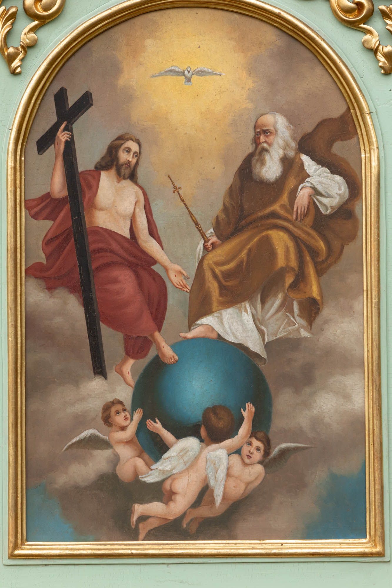 Feretron w formie obustronnego obrazu olejnego na podkładzie z blachy. Ujęty w prostokącie z półkolistym zwieńczeniem, o profilowanym obramieniu. Oprawa w formie ołtarza typu architektonicznego w po- rządku kompozytowym. Szczyt o wykroju odcinka łuku, profilowany z promienistą gloria w tympanonie. W narożach ujęty wazonami na cokołach, zwieńczony symetrycznie rozmieszczonymi zwojami z liści akantu z kartuszową plakietą na osi nad którą palmeta i krzyż trójlistny. Część dolna w formie gzymsowania na postumentach w których otwory na drążki. Z jednej strony przedstawienie Trójcy Świętej. Z prawej strony Bóg Ojciec jako siwy starzec, w postaci siedzącej, z nogami wspartymi na kuli świata, w białej koszuli i obszernym brązowym płaszczu. Po stronie przeciwnej siedząca w obłokach postać Jezusa Chrystusa, w czerwonych szatach z krzyżem w prawej ręce. U góry pośrodku gołębica w glorii rozproszonej. U dołu trzy uskrzydlone postacie aniołków otaczają kulę świata. W tle całej sceny obłoki niebieskie. Z drugiej strony Święta Rodzina Maria Matka Boża, św. Józef i stojący pomiędzy nimi, trzymany za ręce Jezus pod postacią młodego chłopca. Postacie stojące, ukazane frontalnie na neutralnym tle. Matka Boska w czerwonej sukni i niebieskim mocno pofałdowanym płaszczu oraz welonem na głowie. Św. Józef w niebiesko- brązowych szatach, w pozie kontrapostu. Jezus Chrystus w białej sukience z "sercem gorejącym" na piersi. Modelunek ciał postaci prawidłowy, bardzo precyzyjny. |