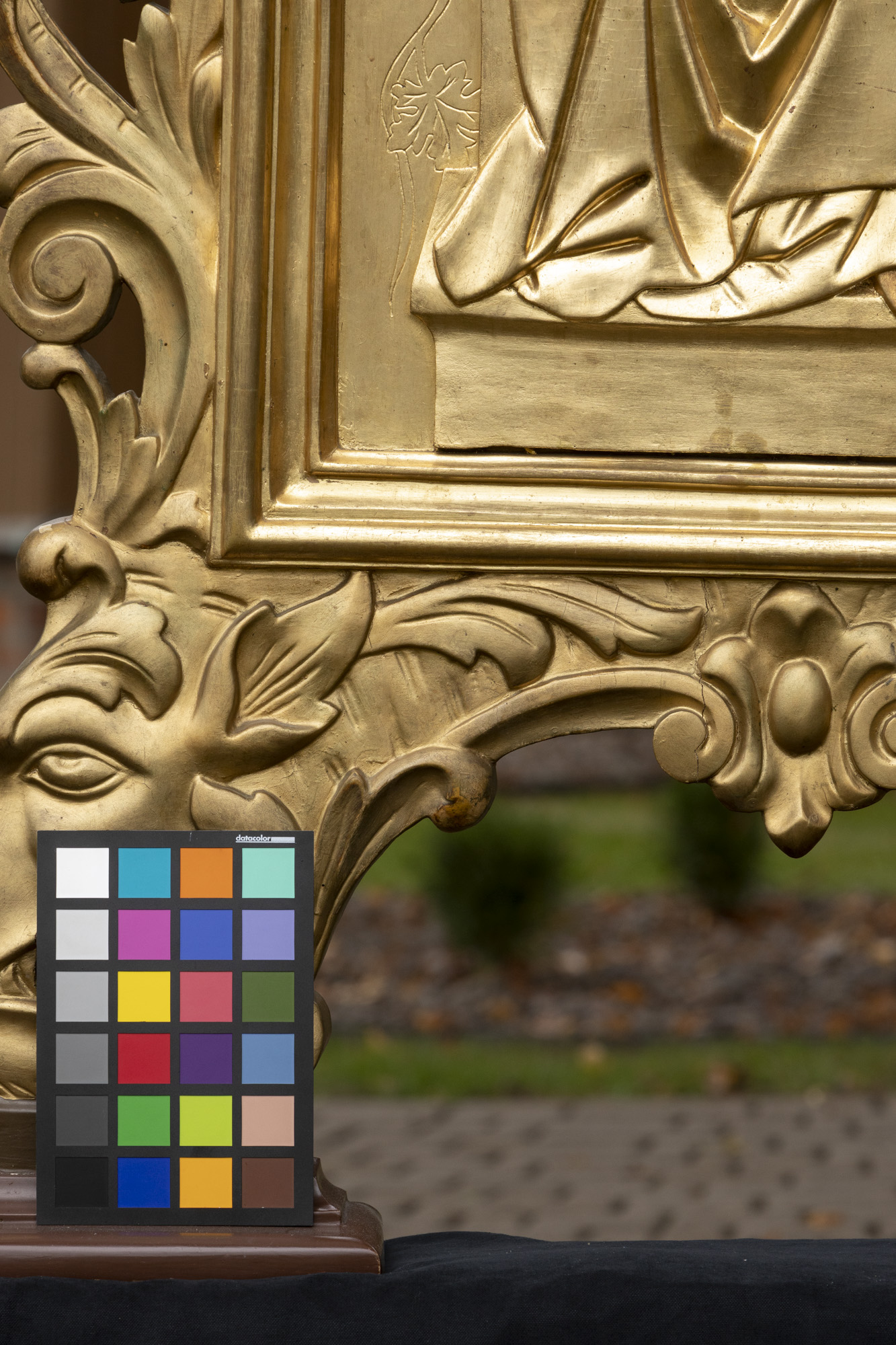 Nóżki o formie postumentów, na nich wsparta bogato płaskorzeźbiona oprawa snycerska z głowami lwów w dolnych narożach i mięsistych splotach wici akantowej układającej się symetrycznie wokół obrazu w formie wolut i esownic. Zwieńczenie krzyżem trójlistnym. Z jednej strony przedstawienie siedzącej ujętej frontalnie postać Maryi NMP i klęczącego obok Jezusa Chrystusa w wieku młodzieńczym . Twarze i ręce postaci malowane na desce, obszerne, powłóczyste szaty o ostro załamujących się fałdach płaskorzeźbione, złocone. Wokół głów postaci koliste nimby. Na kolanach Marii otwarta księga .Prawa ręka uniesiona do góry w geście błogosławieństwa Tło gładkie, sztancowane motywem winnej winorośli. Z drugiej strony postać Chrystusa stojącego w ujęciu frontalnym na obłokach niebieskich. Szaty obszerne płaskorzeźbione, ręce i głowa malowane olejno, o ciemnej karnacji. Wokół głowy kolisty nimb. Prawa ręka uniesiona do góry w geście błogosławieństwa , lewa odsłania część szaty ukazując "gorejące serce”. Tło jak z drugiej strony. |
