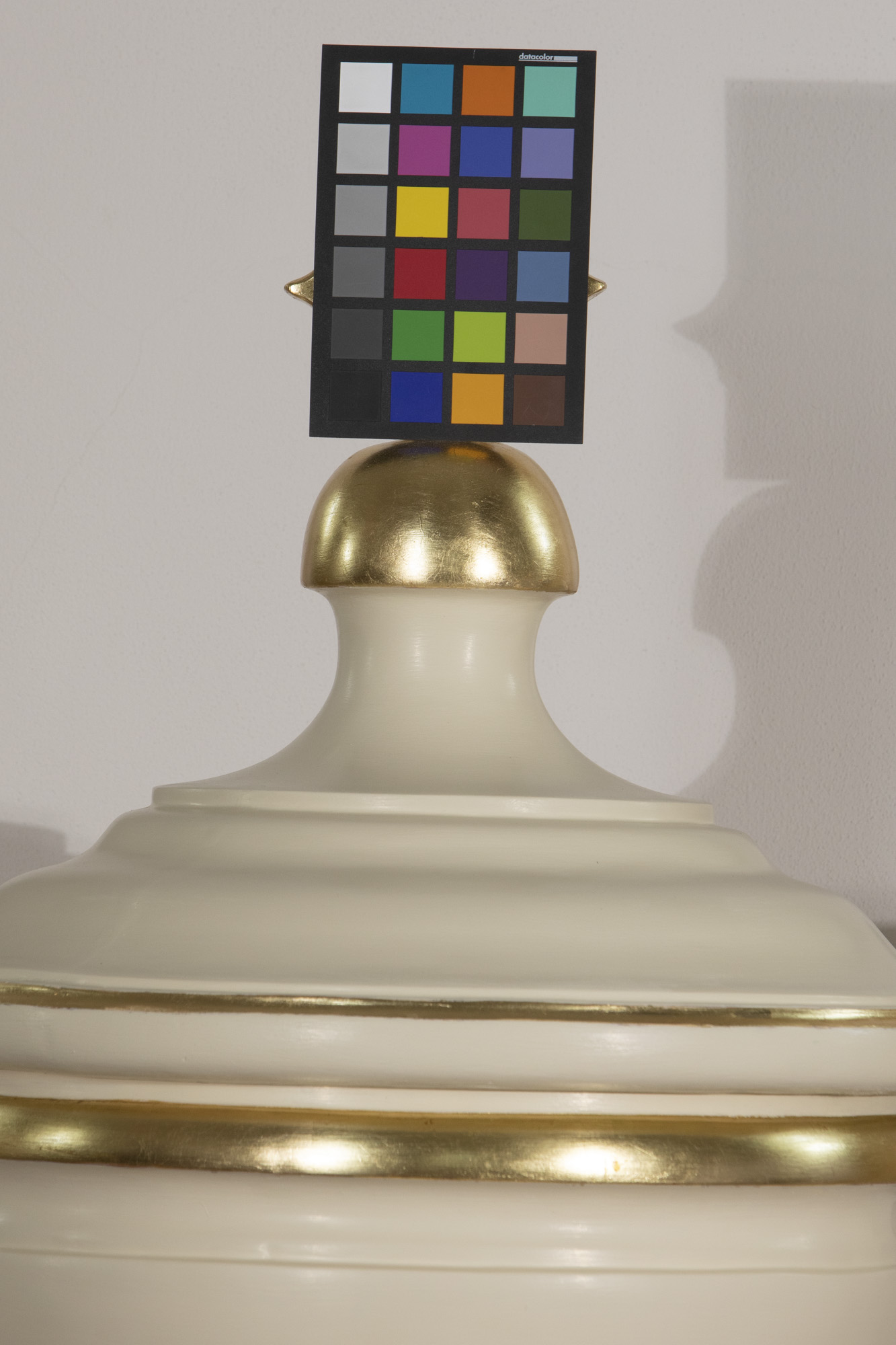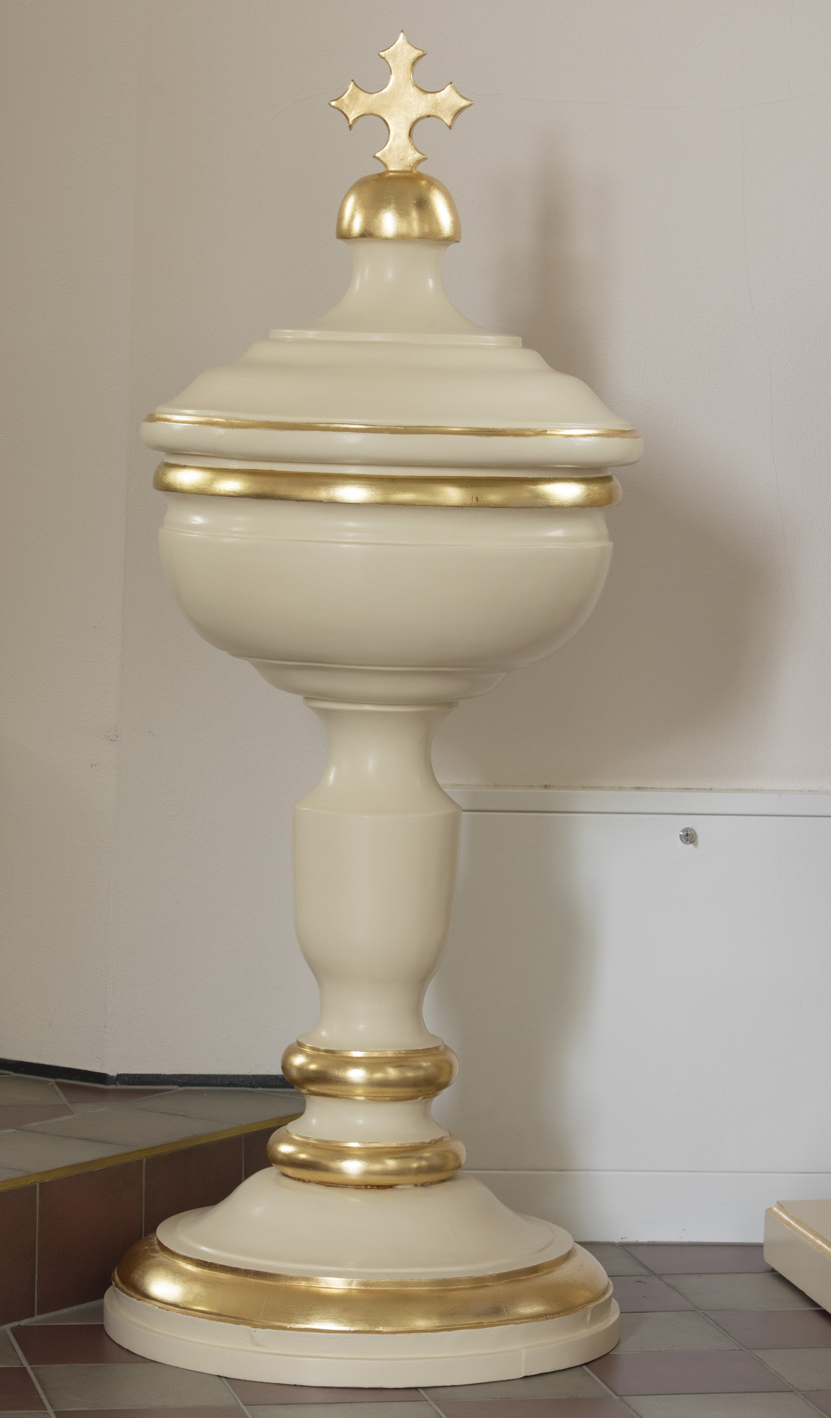 Kielichowa, toczona. Na kolistej, sprofilowanej stopie i tralkowym trzonie półkolista czasza pod kopulastą pokrywą. Wierzch pokrywy toczony szpulowo, w szczycie krzyż grecki. We wnętrzu misa miedziana, bielona. Drewno malowane olejno, białe, otoki malowane brązem w proszku. |