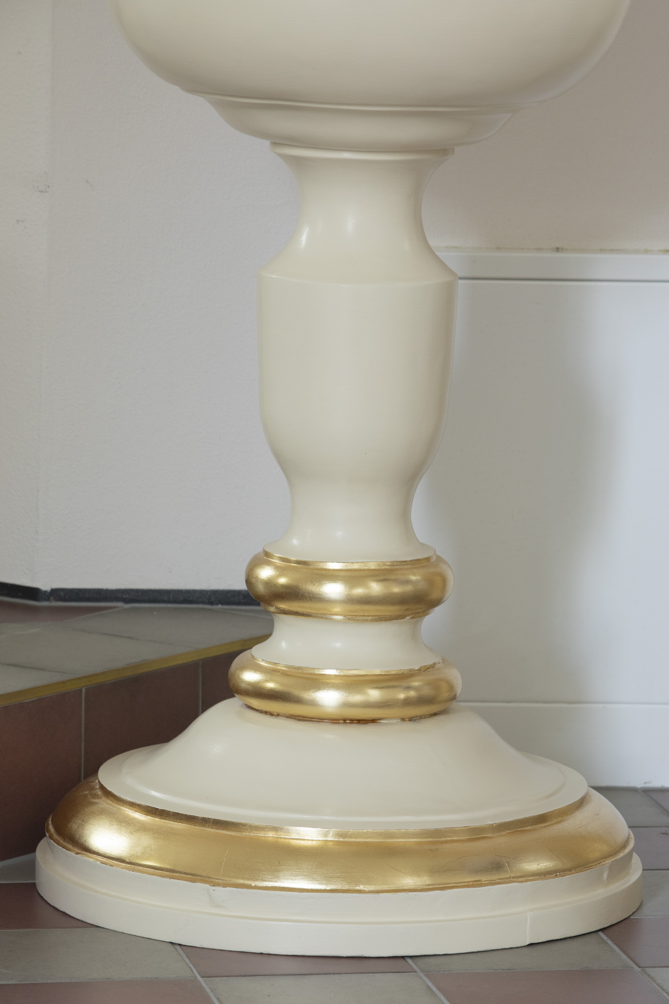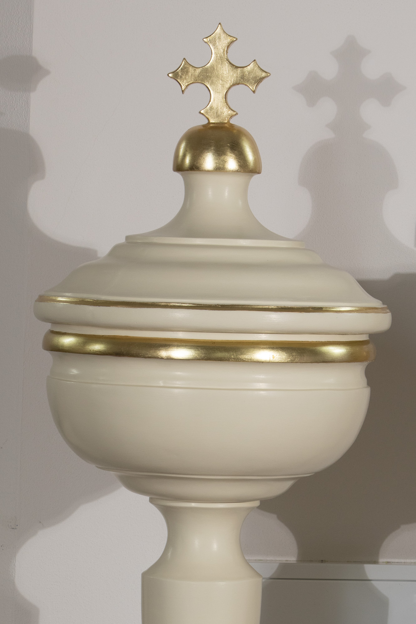 Kielichowa, toczona. Na kolistej, sprofilowanej stopie i tralkowym trzonie półkolista czasza pod kopulastą pokrywą. Wierzch pokrywy toczony szpulowo, w szczycie krzyż grecki. We wnętrzu misa miedziana, bielona. Drewno malowane olejno, białe, otoki malowane brązem w proszku.