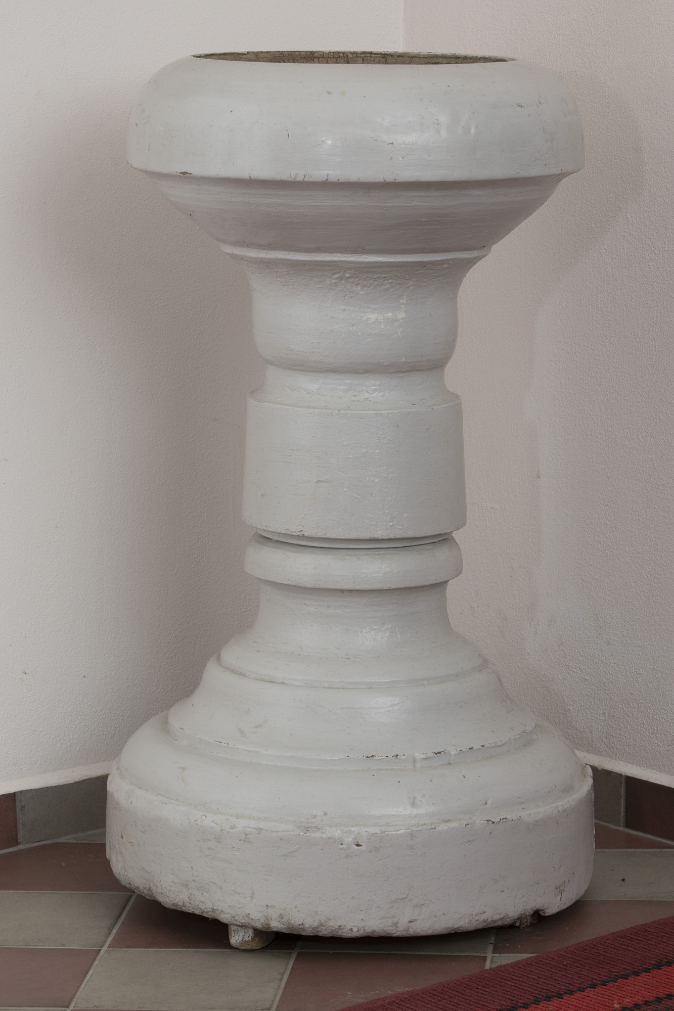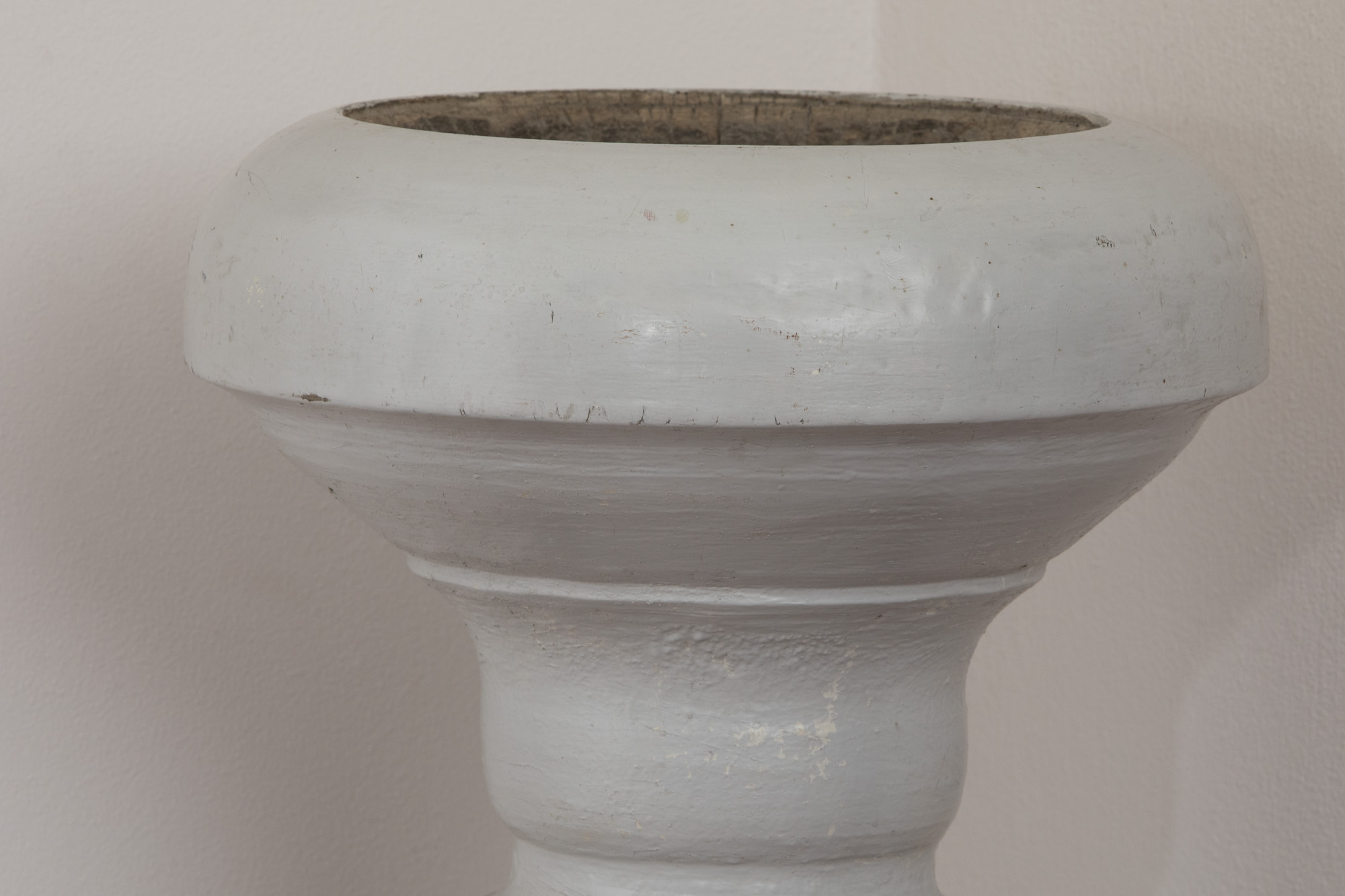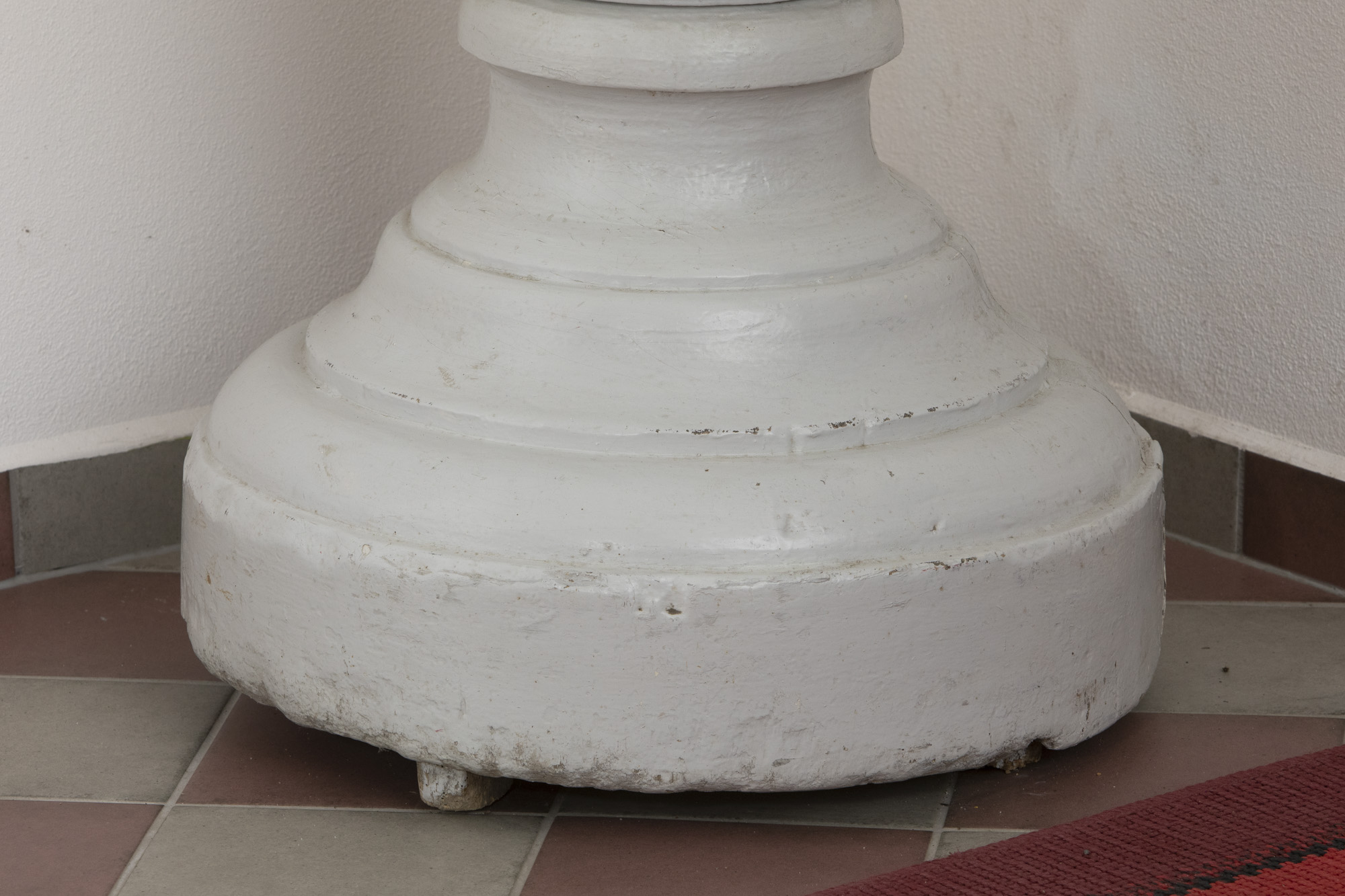 Kielichowa, toczona. Na kolistej, sprofilowanej stopie trzon tralkowy o cylindrycznym nodusie. Czasza kuliście spłaszczona, sprofilowana. Malowanie olejne, białe. Wewnątrz wkład metalowy, zastępczy. |