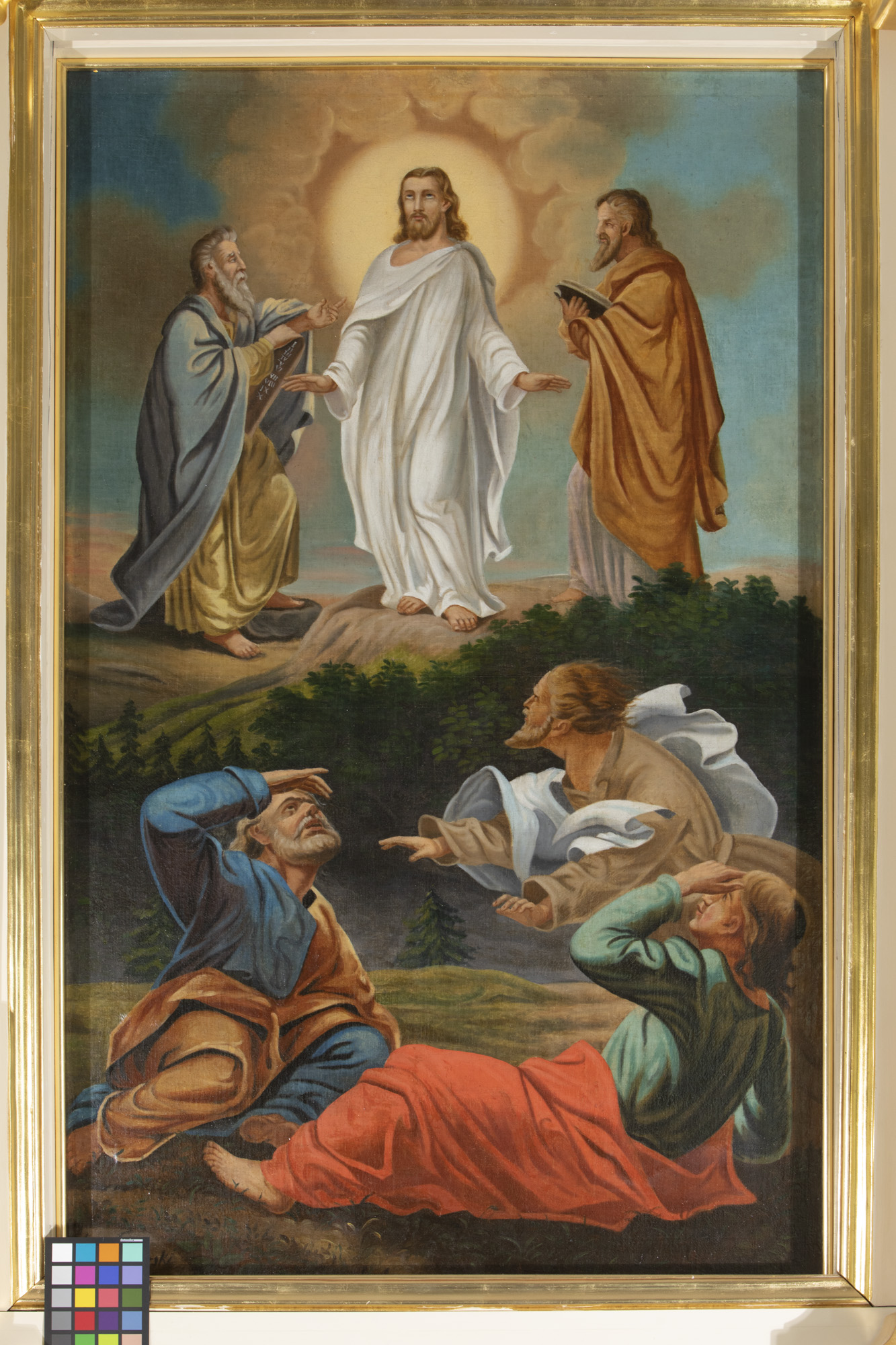 Kompozycja dwustrefowa; w górnej postacie en pied Jezusa, Mojżesza i Eliasza. W strefie dolnej półleżą ce postacie apostołów. Niebieskie tło części górnej rozświetlone beżem i żółtym wokół głowy Jezusa. Jezus w szacie biało-szarej, Mojżesz w szacie oliwkowej pod niebieskim płaszczem. Eliasz w płaszczu rudo-brązowym na fioletowej szacie Na tle zieleni przyziemia i ciemno stalowych tonacji planu odległego postać pierwsze go planu z prawej w zielono-niebieskiej sukni pod ciemno czerwonym płaszczem, z lewej - na ciemno niebieskiej sukni brązowo-rudy płaszcz. Postać w głębi z prawej w białym, rozwianym płaszczu na jasno-brązowe sukni. W lewym dolnym narożu sygnatura: "Malował/Kuligowski". |