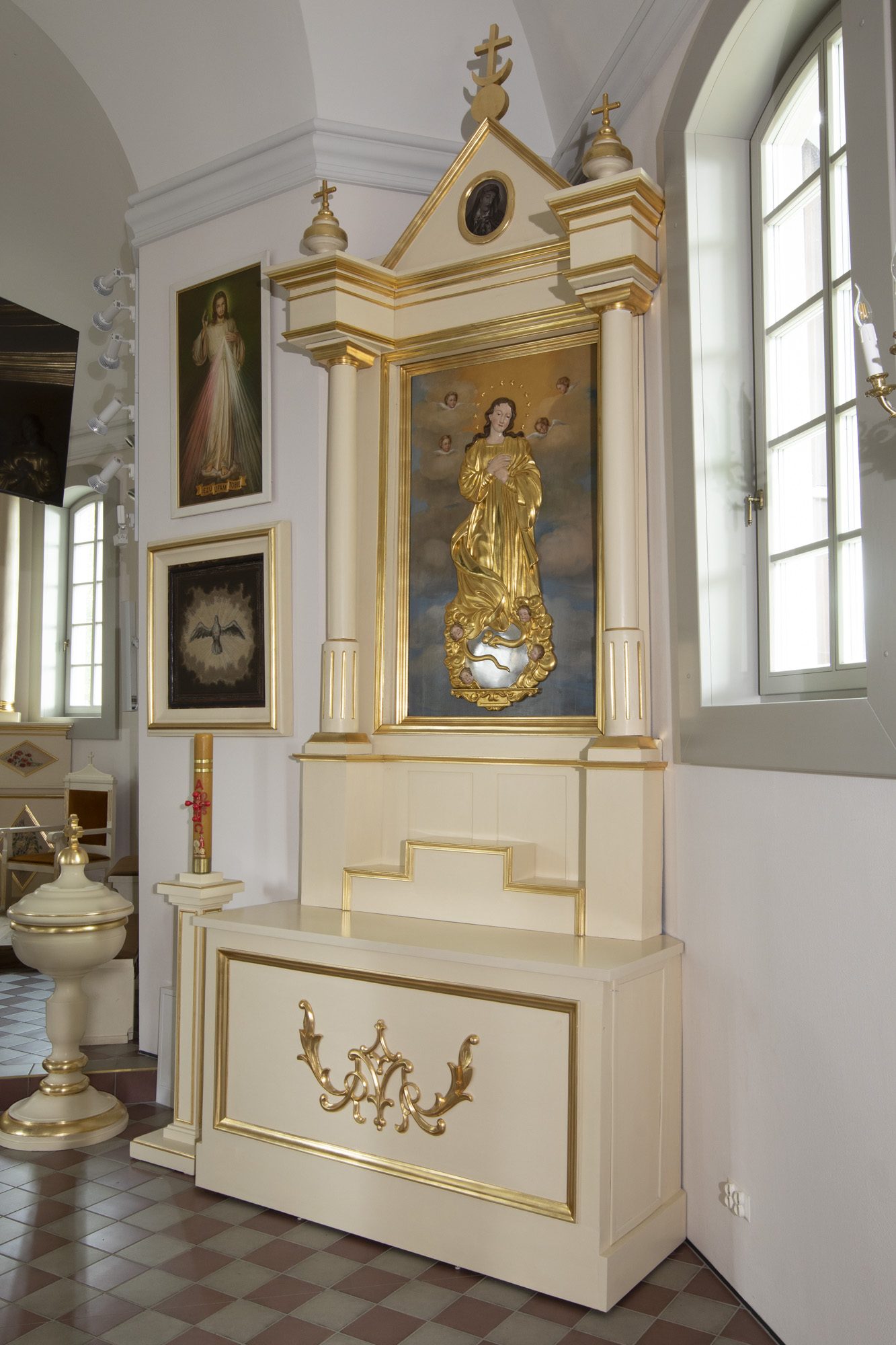 Przyścienny, w narożu ścian nawy i tęczy, architektoniczny, jednopolowy, pole ujęte parą wolnostojących ukośnie stawianych do lica kolumienek. W zwieńczeniu belkowanie trójkątny tympanon Mensa skrzyniowa, drewniana. W polu obraz M.B. Niepokalanego Poczęcia (156x95 cm, XX w.) oraz na zasuwie obraz Przemienienia Pańskiego (XX w.). W polu tympanonu tondo obrazu M.B. Bolesnej, olej karton (25x21 malowany en grisaille (XX w.)oraz para rzeźbionych głów aniołów (barok XVIII w.). W tle antepedium wycięty hierogram Marii. Malowanie olejne białe, partie snycerskie i olistwienie malowane brązem w proszku. Portatyl z białego marmuru 34x34 cm, napis tuszem mało czytelny: "Lublin die 30 Decembris 1924/ Conseeravit/ Adolphus J.Jeżowiecki Episcopus Loryniensis/ Auxillaris Lublinensis/ L. Kwiek Cancelarius”.