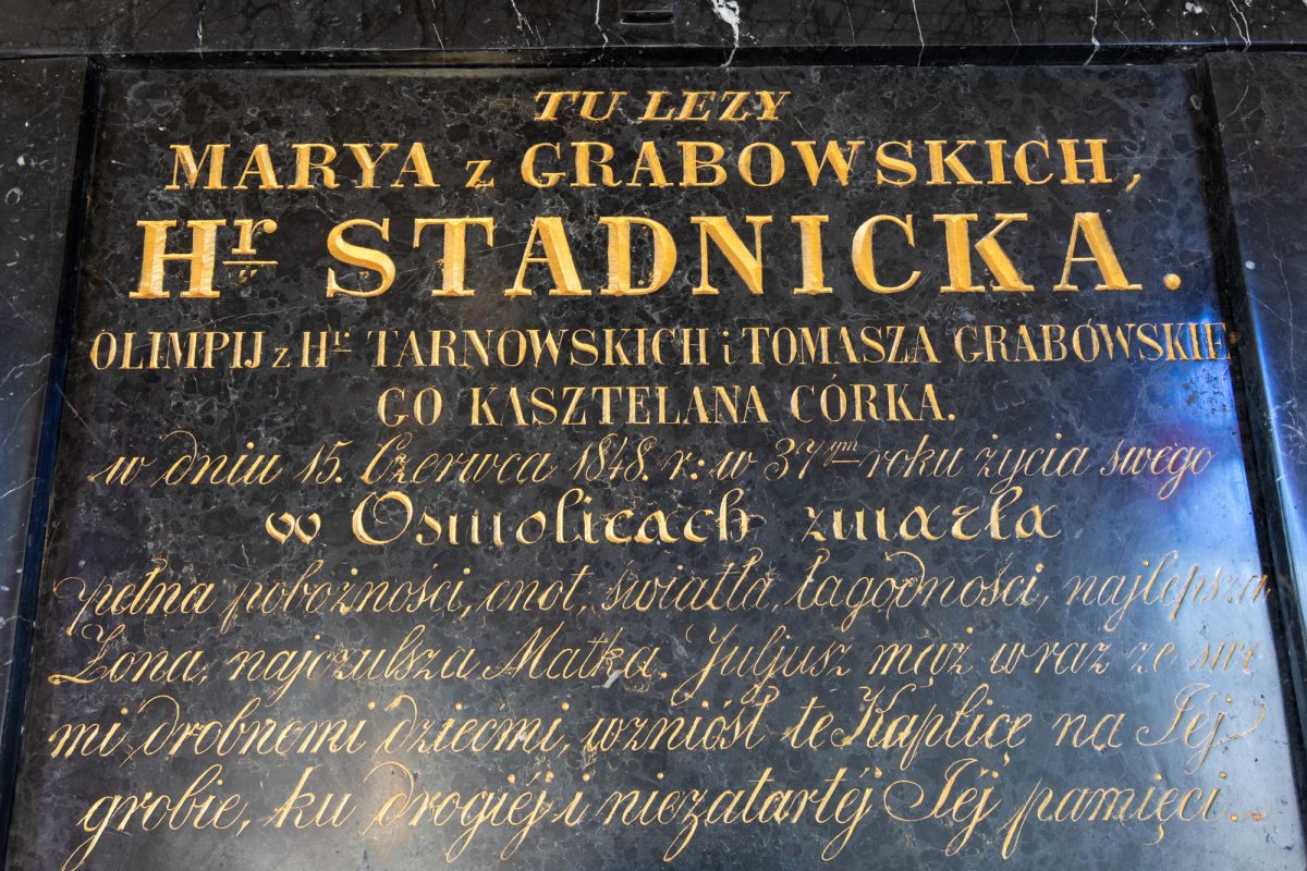 | Opis | W licu ściany południowej prostokątna płyta inskrypcyjna z czarnego marmuru, ujęta ramą na parze kroksztynów, zakończona tympanonem o podniesionych ćwierćkoliście narożach. Na dolnej listwie ramy kartusz herbu Szreniawa i Pobóg, płaskorzeźbione w białym marmurze. Napis kuty, złocony „Tu leży Maria z Grabowskich / hr Stadnicka / Olimpii z hr Tarnowskich i Tomasza Grabowskiego Kasztelana córka / w dniu 15 czerwca 1814 r. w trzydziestym siódmym roku życia swego / w Osmolicach zmarła/ pełna pobożności, cnót, światła, łagodności, najlepsza żona, najczulsza Matka. Juliusz mąż ze swemi drobnymi dziećmi wzniósł kaplicę na Jej grobie ku drogiej i niezatartej jej pamięci”. W położeniu piętrowym analogiczne epitafium Zofii z Piwnickich Juliuszowej hr Stadnickiej, urodzonej 8 października 1863 r. w Brzeźnie, zm. 26.11.1939 w Osmolicach. |