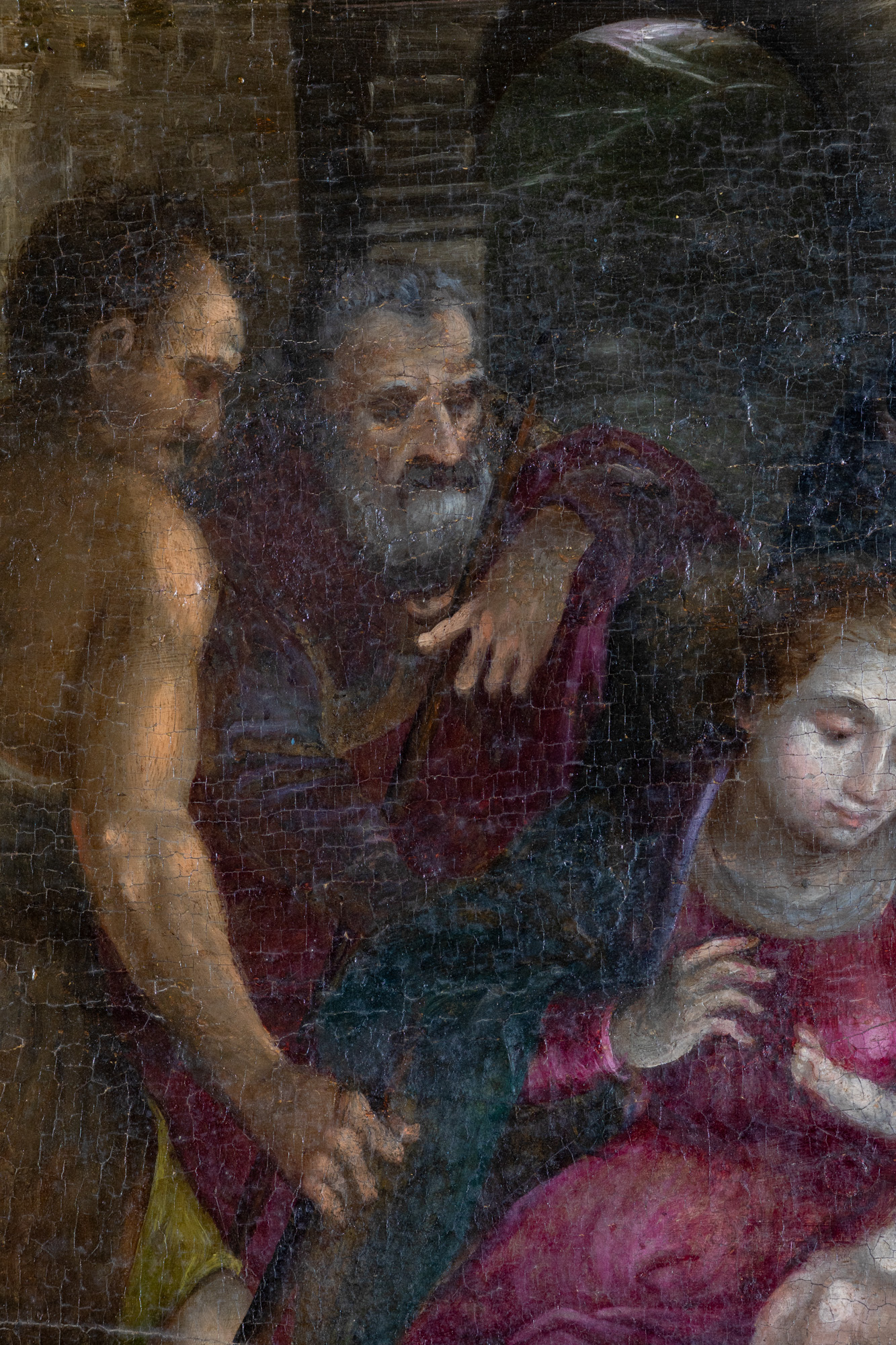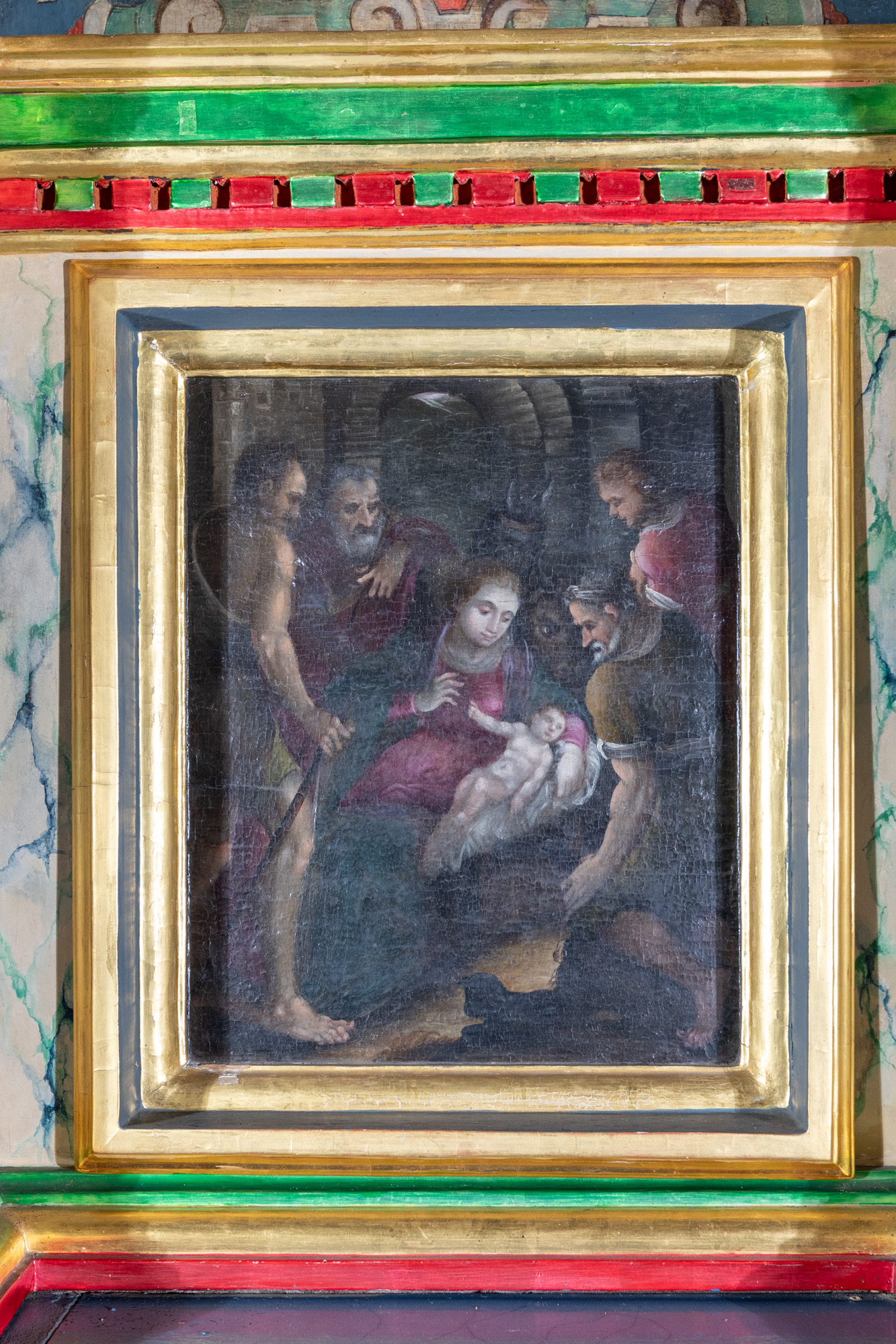 | Opis | W tle stajenki, obok dzieciątka Maria siedząca na skrzyni podróżnej. Po prawej i lewej stronie Marii pasterze i święty Józef. Maria w buraczkowej sukni pod ciemno-niebieskim płaszczem, zarzuconym od przodu na kolana. Święty Józef w szacie brunatnej, postać młodzieńca ze świętym w sukni czerwonej. Postacie pasterzy z lewej W tunice brunatnej i w głębi – ciemnoczerwonej. Tło części górnej ciemno-stalowe. Brunatne przyziemie rozjaśnione żółcieniem. Karnacja Dzieciątka i twarz Marii cieniowane szarością. Deska podobrazia integralna z ramką. Obraz przedstawiający pokłon pasterzy nazwany został w Katalogu Zabytków Sztuki Bożym Narodzeniem. |
