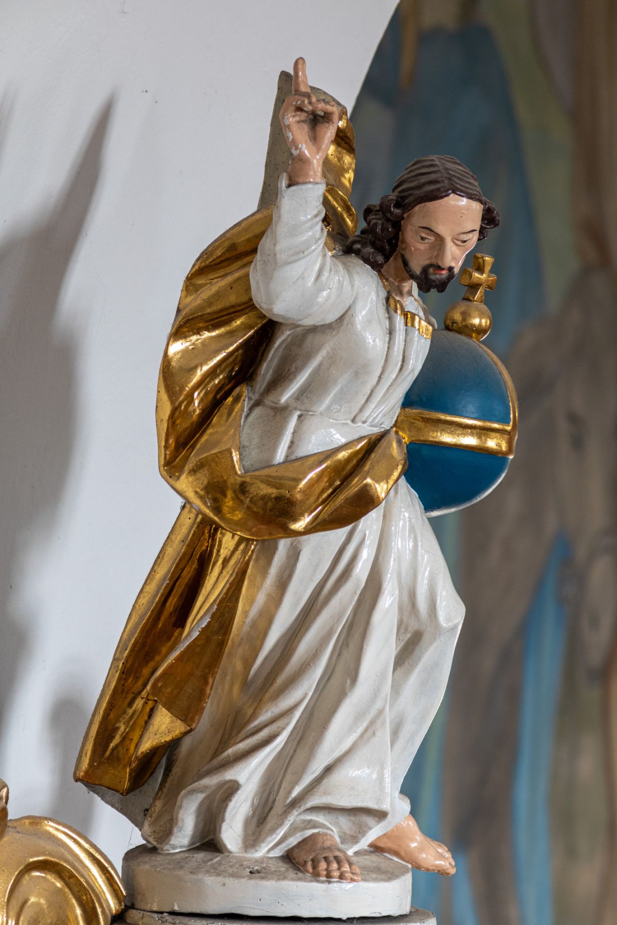 | Opis | Rzeźba z przedstawieniem Chrystusa w pełnej postaci, w ujęciu frontalnym. Ciało przegięte w pół, głowa opuszczona, prawa ręka uniesiona w geście błogosławieństwa, lewa ręka przytrzymuje do boku kulę ziemską i krzyżem na jabłku – symbolami Królewskowości Syna Bożego. Szaty białe, długie obcisłe. Włosy i zarost ciemne, krótkie. Modelunek twarzy realistyczny, precyzyjny, karnacja ciała jasna, naturalna. |