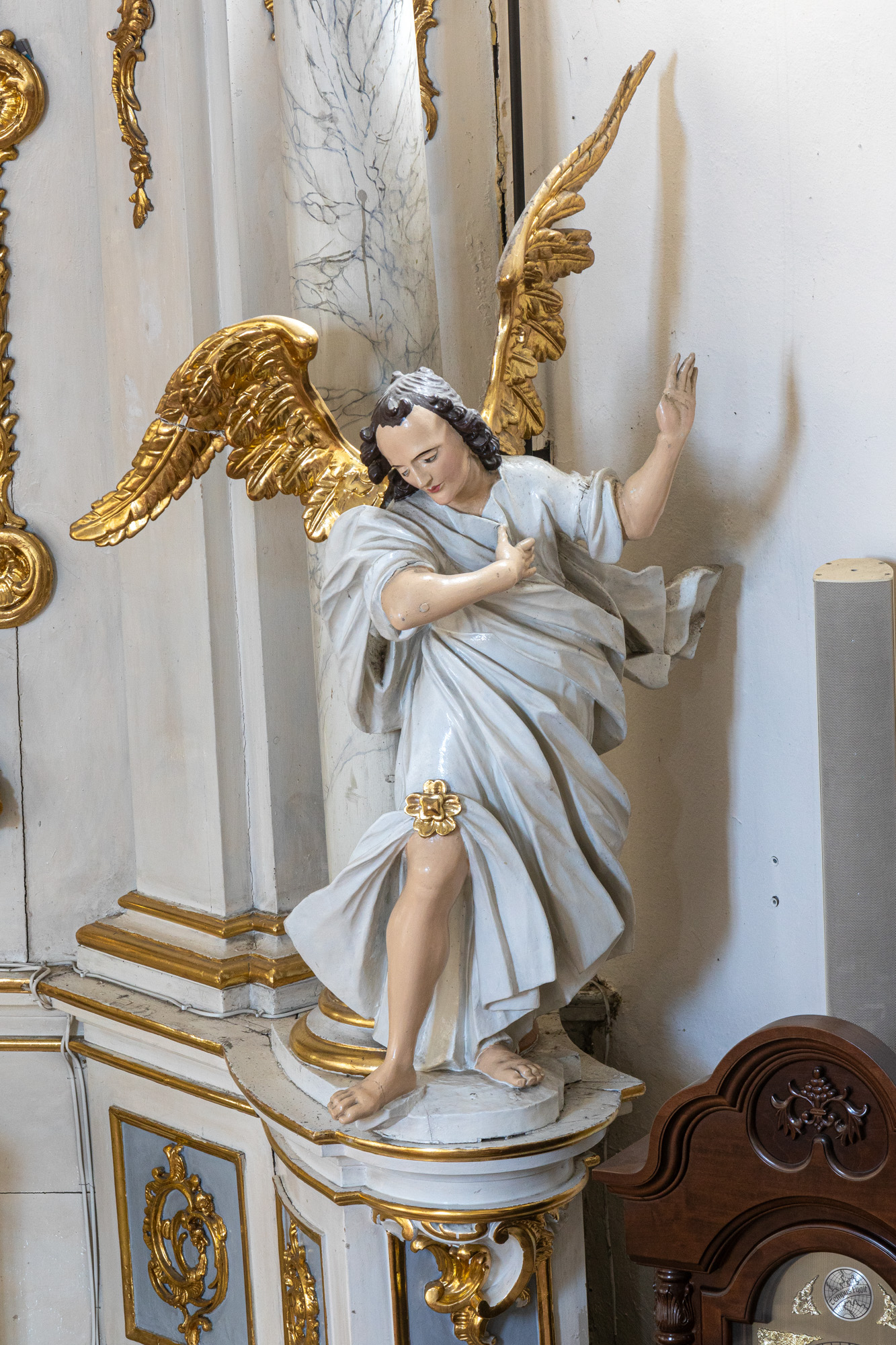 | Opis | Rzeźby pełne, drewniane, ustawione po obu stronach ołtarza na poziomie predelli. Postacie młodzieńcze przedstawione w pozie kontrapostu, zwrócone frontalnie w obszernych, mocno drapowanych, rozwianych szatach. Ręce swobodnie rozrzucone na boki i do góry. Prawe nogi wysunięte do przodu, stopy bose. Włosy ciemne, pofalowane, skrzydła obszerne, rozłożyste. Proporcje i modelunek anatomiczny poprawne, precyzyjny z uwidocznieniem rysunku mięśni. |