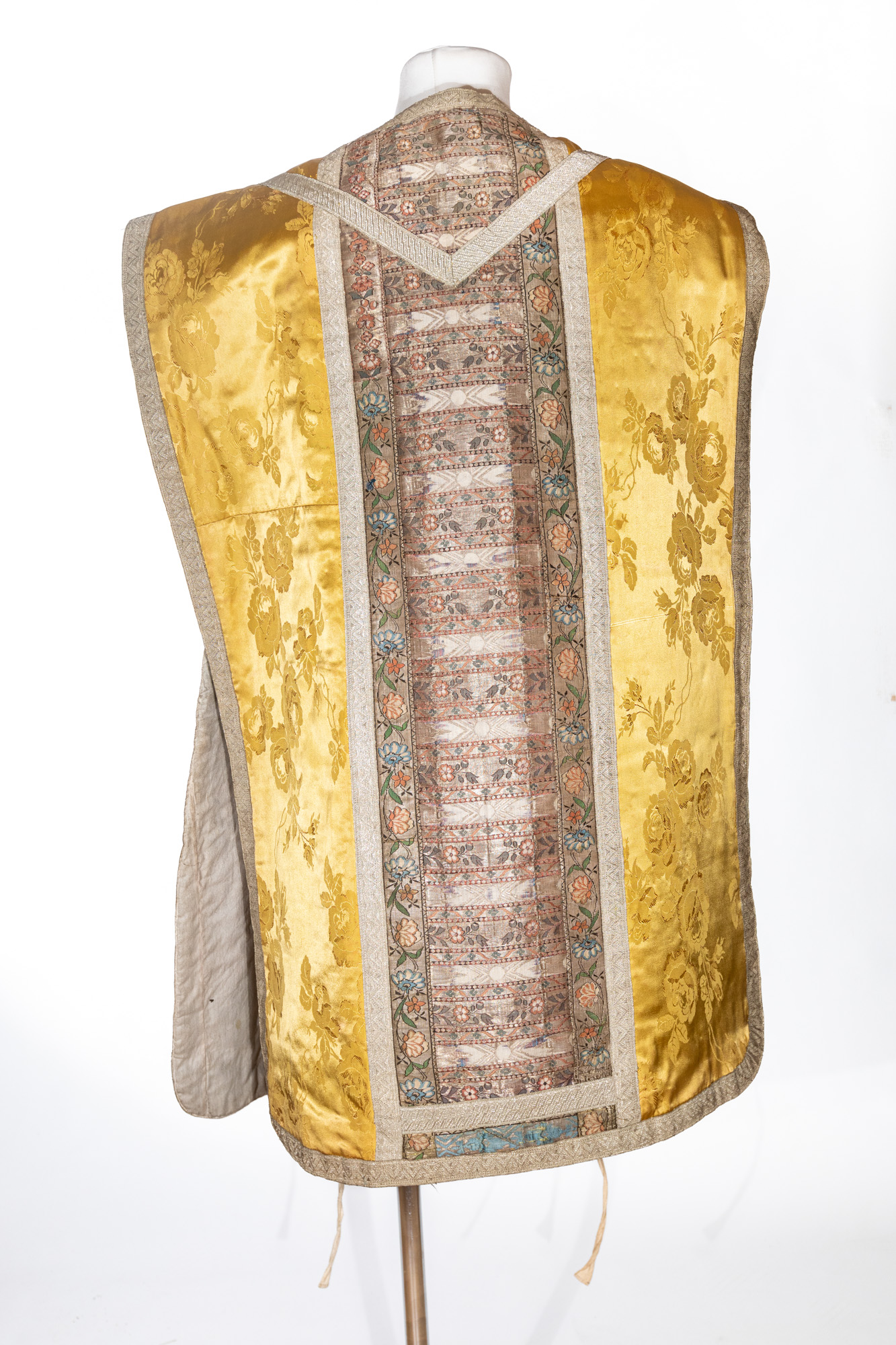 Tkanina złotolita, pokryta stylizowanymi bukietami róż z wielobarwnym wątkiem. Bukiety rozmieszczone alternacyjnie w rzędach. Kolumnę tylną stanowi wciąż pasa kontuszowego dzielonego na pola, zdobione kwiatami róż, goździków i listków, ujęty bordiurą zdobioną kwiatami w typie dużych rumianków. Na kolumnie z przodu do 4/5 fragment innego pasa kontuszowego, sztukowany u góry jedwabną tkaniną we wzór kwiatowy. Kolumna i ornat obszywane pasmanterią. Sygnatura na kolumnie z tyłu przez Daniela Chmielewskiego.