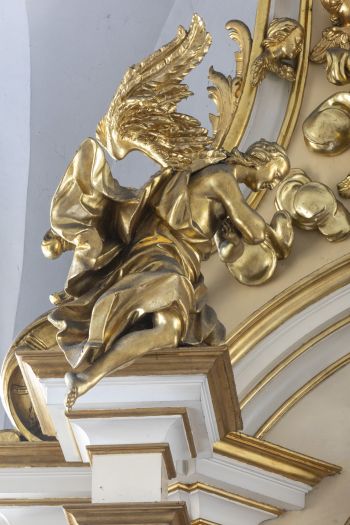 Postacie en pied w esowo wygiętej postawie rokokowego kontrapostu. Gesty rąk i układ głowy wyrażają stan ekstazy; dłonie przed sobą, złożone lub uniesione. Na szatach nie kryjących wysuniętych nóg draperie płaszczy. Skrzydła, paski, rozety - złocone, figury malowane bielą. Odwrocie dłubane głęboko. Konsole pół jajowate, rzeźbione z parą motywów ceowych z grzywaczem, akantem i drobnym festonem rozwieszonym na parze wolut. Konsole złocone i malowane bielą.