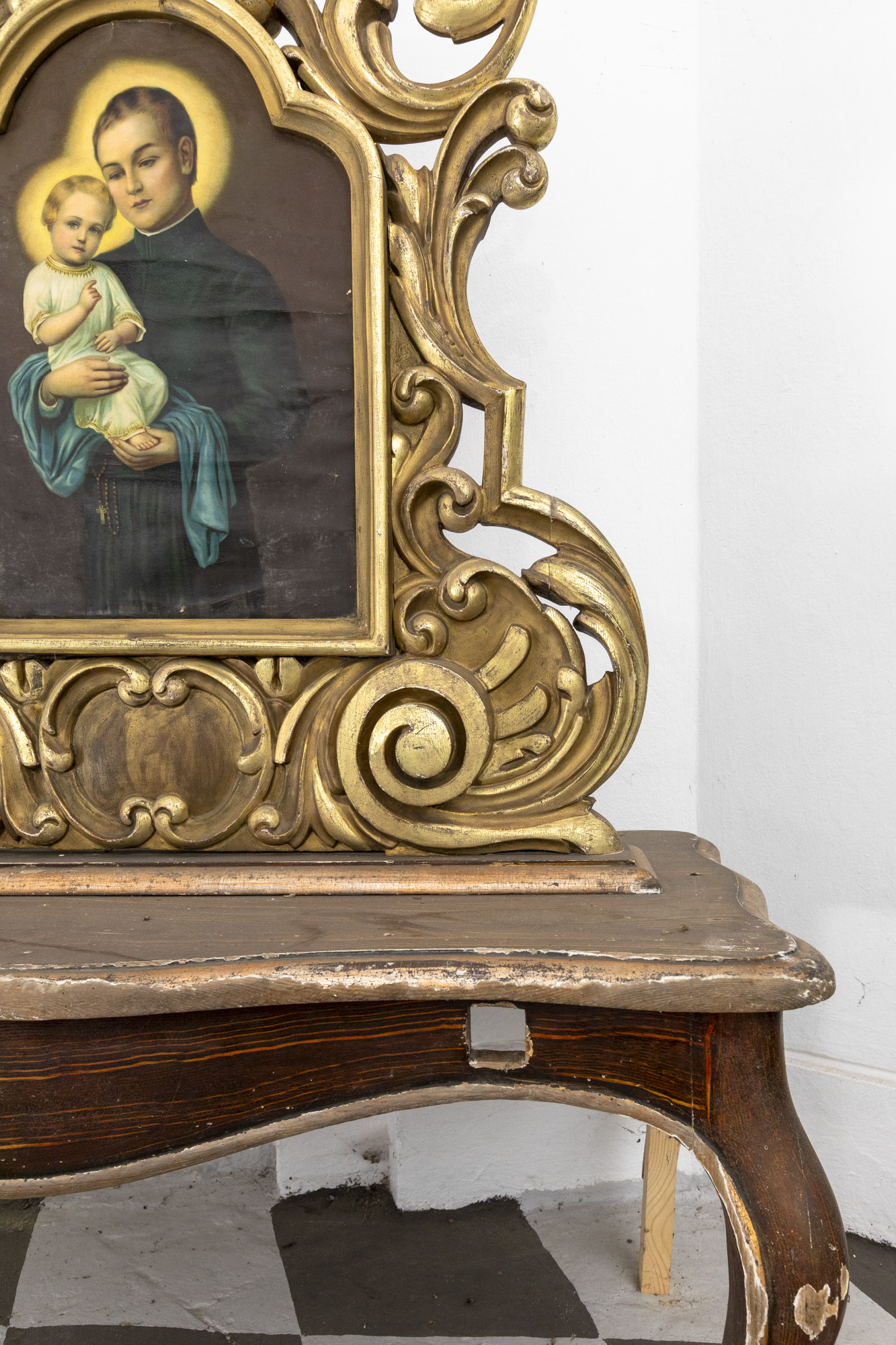 Stolik w typie jamnik, prostokątny podłużny. Wierzch carga i nogi wygięte faliście. Stopki zakończone wolutą. Na odwrocie napis ołówkiem: "1937 Wilno pracownia pozłotnicza B. Rozmyślewicza". Na wierzchu dobierany, późniejszy feretron z reprodukcjami obrazów Świętej Teresy i Jana Kantego. W kartuszach feretronu monogramy tych świętych. Stolik mazerowany brązem. Sprofilowane obrzeże złocone. Złoto położone na palmencie. |