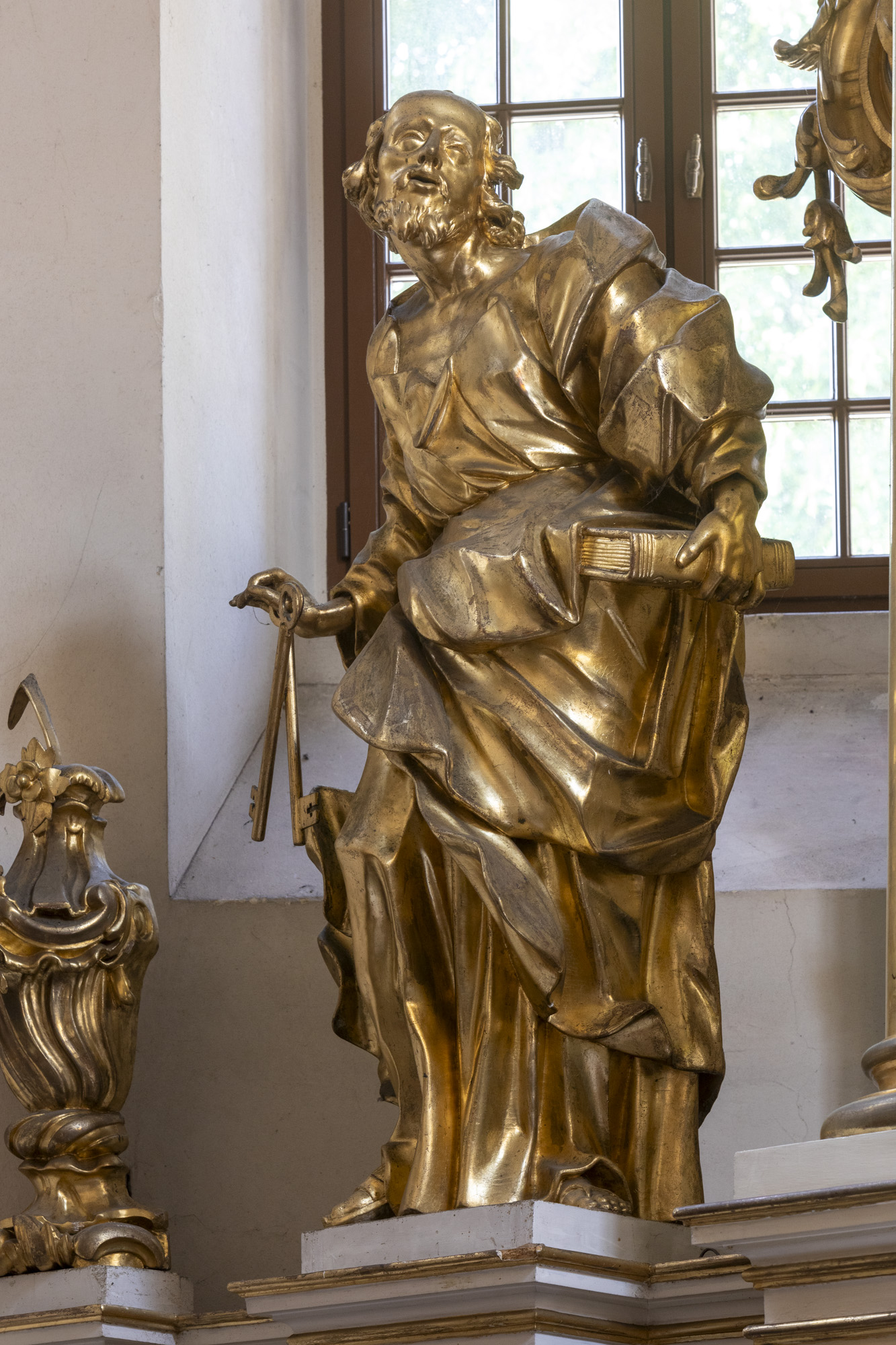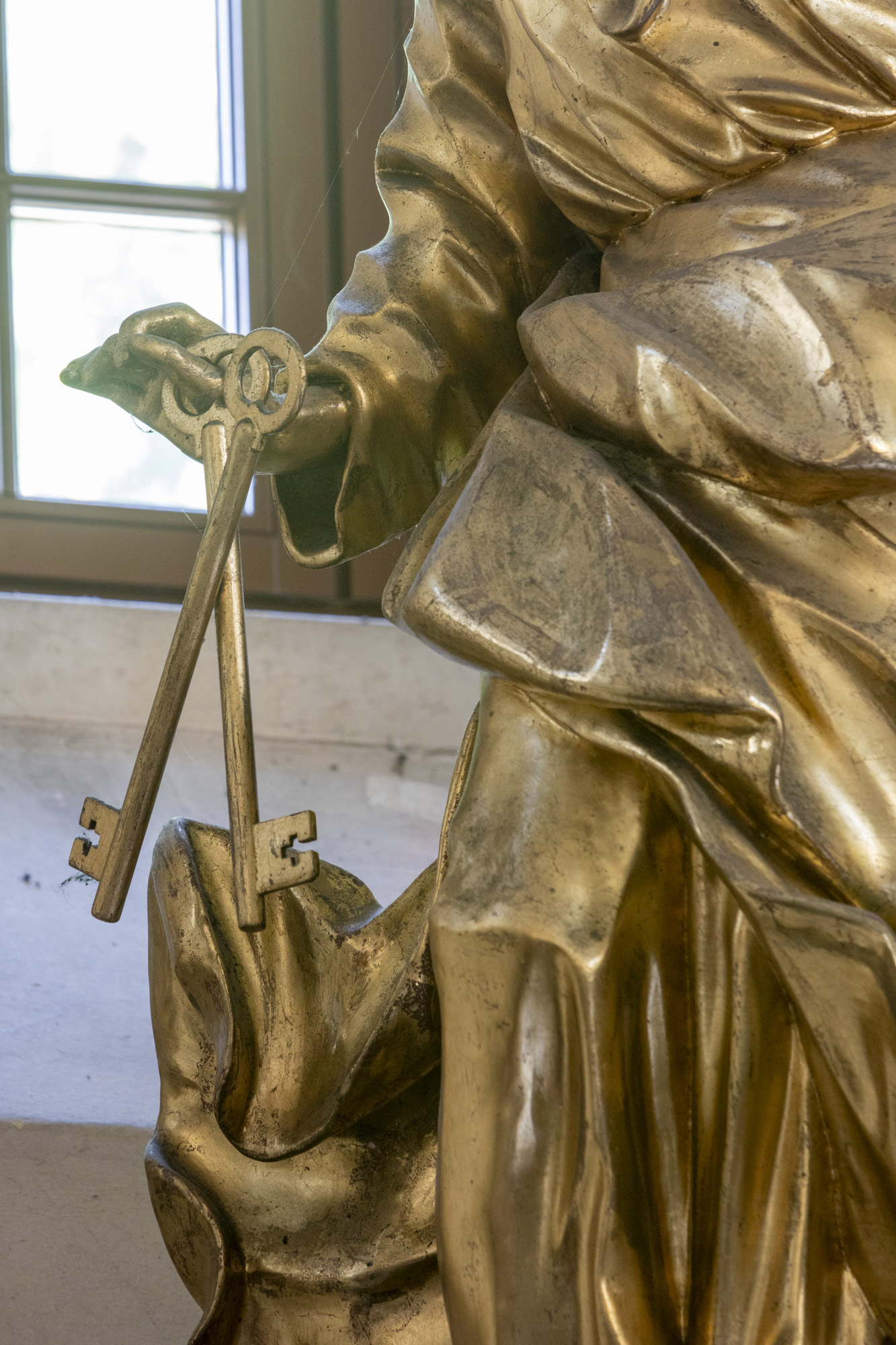 Postać en pied, wygiętej esowo postawie rokokowego kontrapostu. W prawej Lekko odchylonej dłoni klucze Królestwa Niebieskiego. W lewej - księga. Na długiej sukni płaszcz rozchylony. Prawa poła płaszcza nawiana na suknię w części przodu. Całość złocona, odwrocie dłubane, maskowane deską. Pod posągiem konsola bogato rzeźbiona w parę wolut i rokokowy kartusz z kaboszonem.