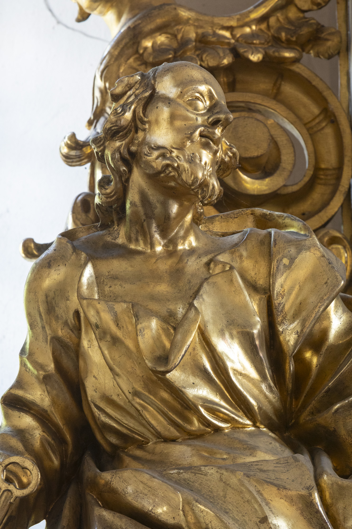 Postać en pied, wygiętej esowo postawie rokokowego kontrapostu. W prawej Lekko odchylonej dłoni klucze Królestwa Niebieskiego. W lewej - księga. Na długiej sukni płaszcz rozchylony. Prawa poła płaszcza nawiana na suknię w części przodu. Całość złocona, odwrocie dłubane, maskowane deską. Pod posągiem konsola bogato rzeźbiona w parę wolut i rokokowy kartusz z kaboszonem. |