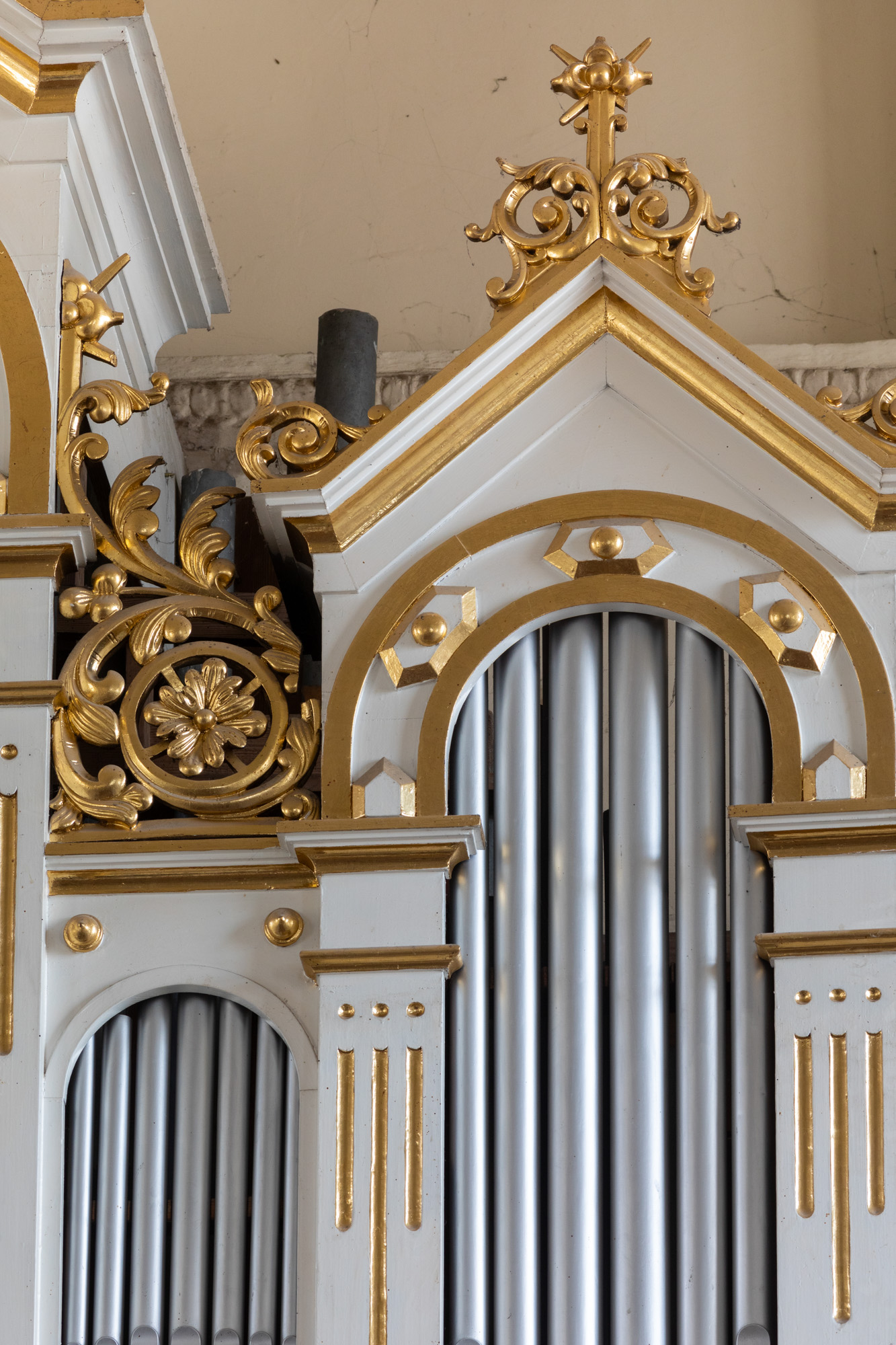 | Opis | Prospekt złożony z dolnej części skrzyniowej, płycinowej i górnej pięcioosiowej nastawy architektonicznej. Wyższa część środkowa i skrajne niższe - w formie półkolistych arkad rozpiętych pomiędzy pilastrami, połączonych ściankami, zamkniętych od góry trójkątnymi szczytami. W arkadach łącznie pięć szeregów piszczałek o zróżnicowanej wysokości. W zwieńczeniach kwiatony i ażurowe zwoje wici akantowej uzupełnione rozetkami. |