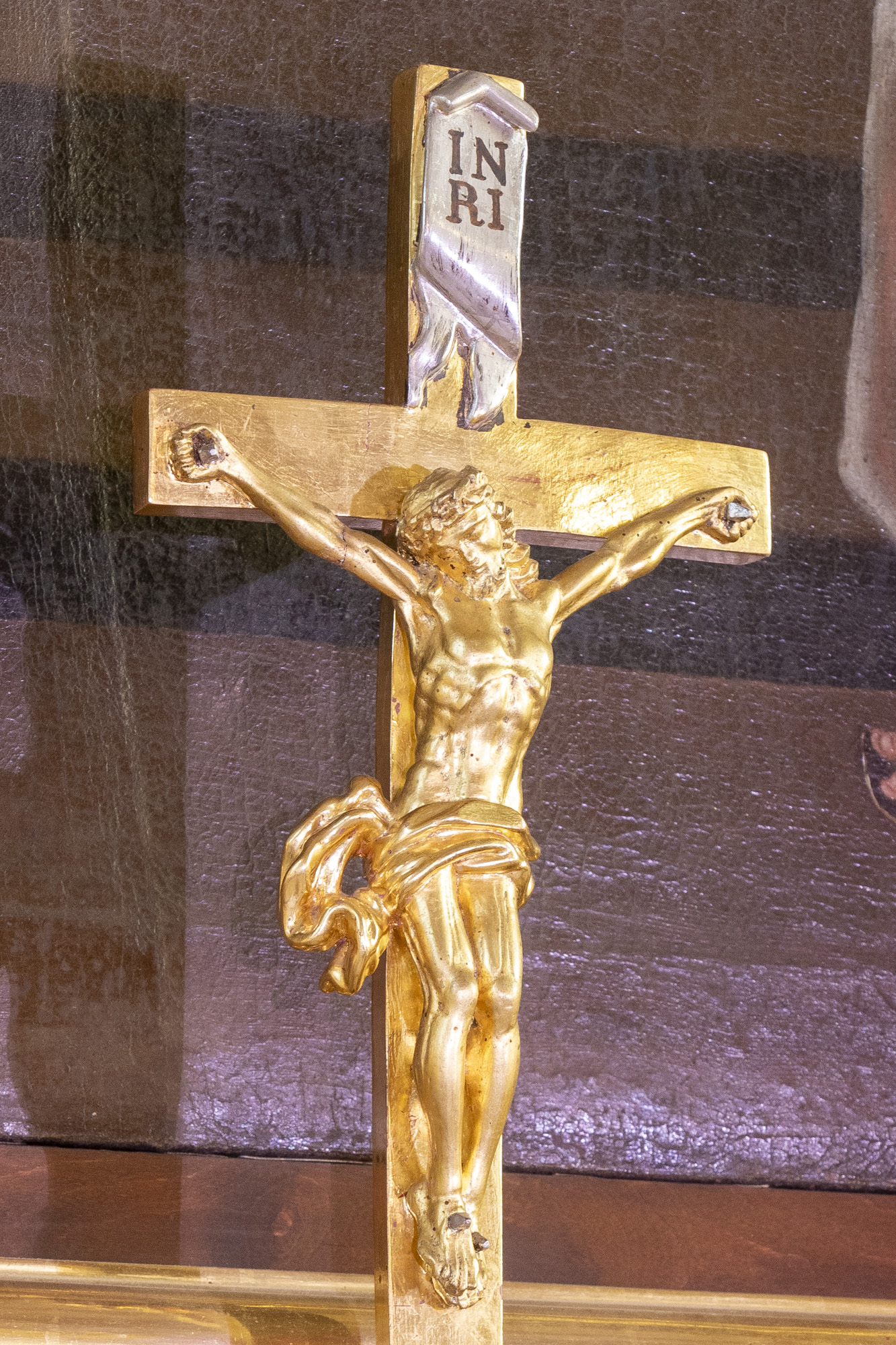 Podstawa w postaci sfalowanego wzgórza z listkami jakby "wsadzonymi". Krzyżyk prosty z tabliczką "INRI" w postaci chorągiewki. Pasyjka w głębokim zwisie, ciało Chrystusa drobne szczupłe, z mocnym modelunkiem mięśni. Perizonium sfałdowany, rozwiane na prawym boku. pasyjka i listki w podstawie-złocone. Krzyż, tabliczka i podstawa – srebrzona. Napis na spodniej stronie podstawy, wpisany atramentem: "Pozłacany ten krzyż w roku 1886, 26 sierpnia. Za staraniem księdza Popiela Oresta. Pozłotnik z Lublina. Józef Nowakowski”.