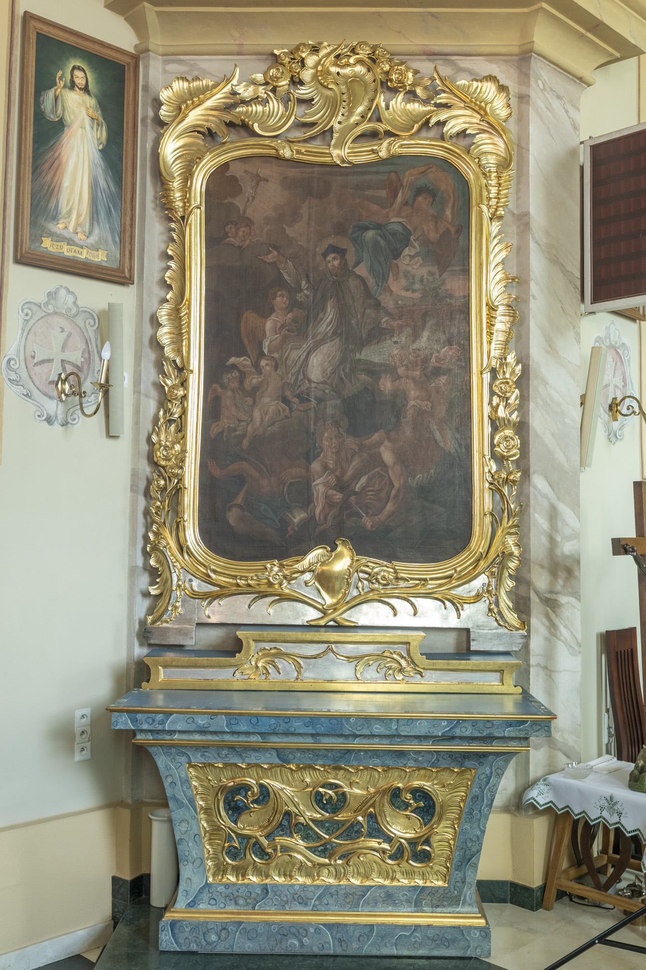 Ołtarz przyścienny, w postaci bogatej ramy z obrazem, ustawiony na mensie. Rama o zarysie zbliżonym do prostokąta, o zaokrąglonych rogach i lekko wygiętych bokach - górnym i dolnym. Rama bogato dekorowana rokejlami, liśćmi, grzebieniami kogucimi, różami, liśćmi wawrzynu, od dołu ujęta dwoma gałązkami z kwiatami. Rama złocona, z wyjątkiem fragmentu ścianki w dolnej części, która malowana na biało. W ołtarzu obraz św. Jana Nepomucena. |