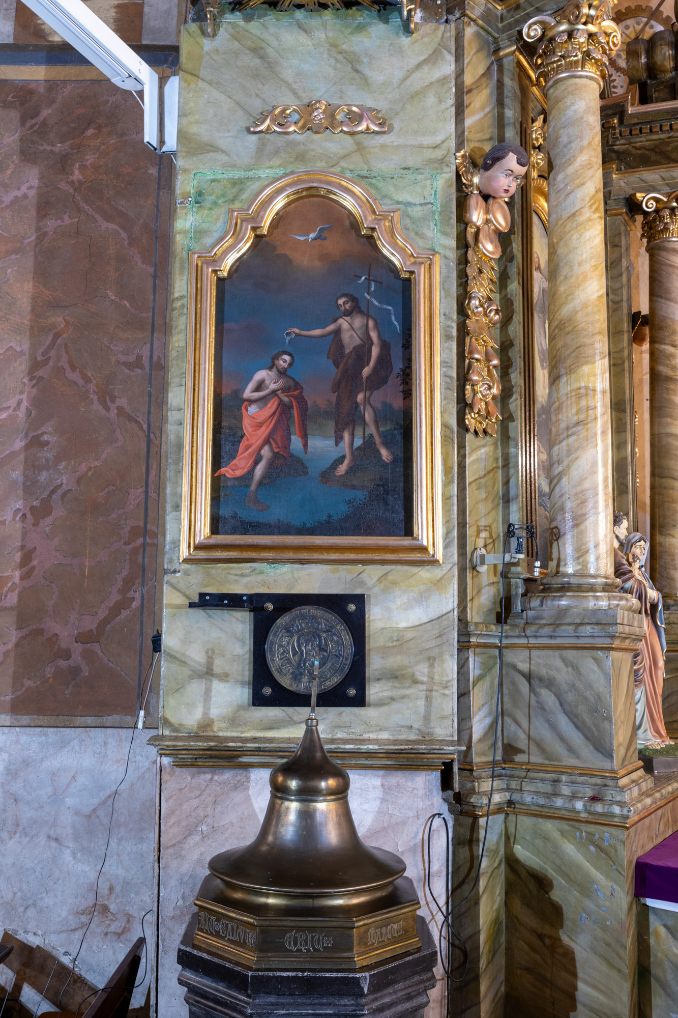 | Opis | W tle glifu tęczy boazeria, w której obraz Chrztu w Jordanie z ramą z XVIII wieku. W zwieńczeniu baldachim, w kształcie wygiętego, podkowiastego belkowania. W podniebieniu - figurka świętego Ducha na aureoli promieni z wieńcem obłoków. Na baldachimie para wazonów z płomieniami i kartusz z sentencją: "Chrzcząc je w imię Ojca i Syna i Ducha świętego". W zwisie baldachimu lambrekin i chwosty. Czasza chrzcielnicy sarkofagowa (98 cm X 117 cm X 72 cm), z pokrywą na wierzchu. Misa miedziana bielona. Marmoryzowanie oliwkowo-szare i złocenia. |