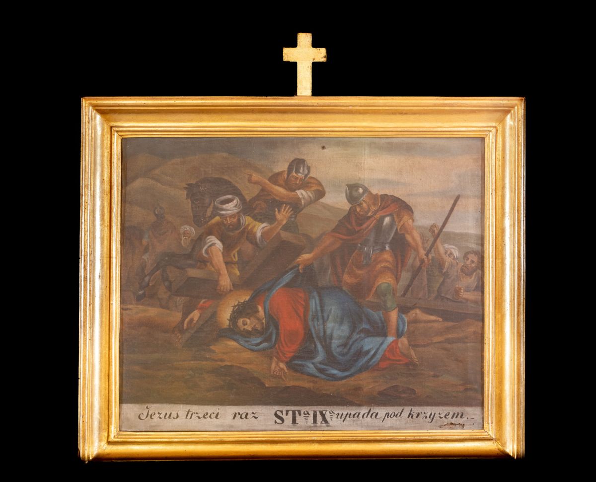 | Opis | Jezus drugi trzeci raz upada pod krzyżem. Na brązowo-oliwkowym tle, wyakcentowana czerwień i błękit szat Jezusa. Stroje trzech rycerzy brązowo-rude. Na odwrocie płótna napis czarną farbą : "Wojciech Wrona z Krzczonowa 1879". |