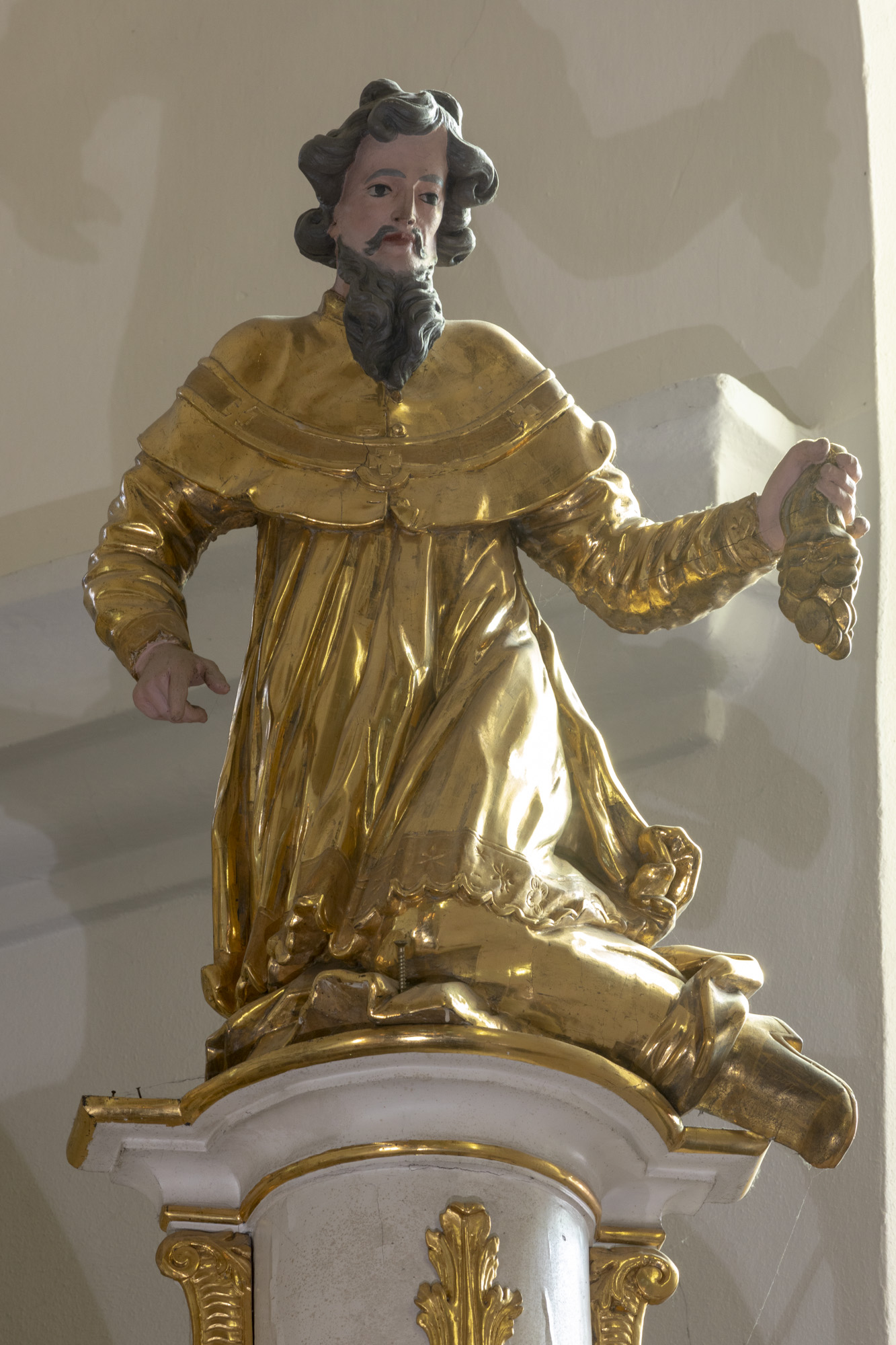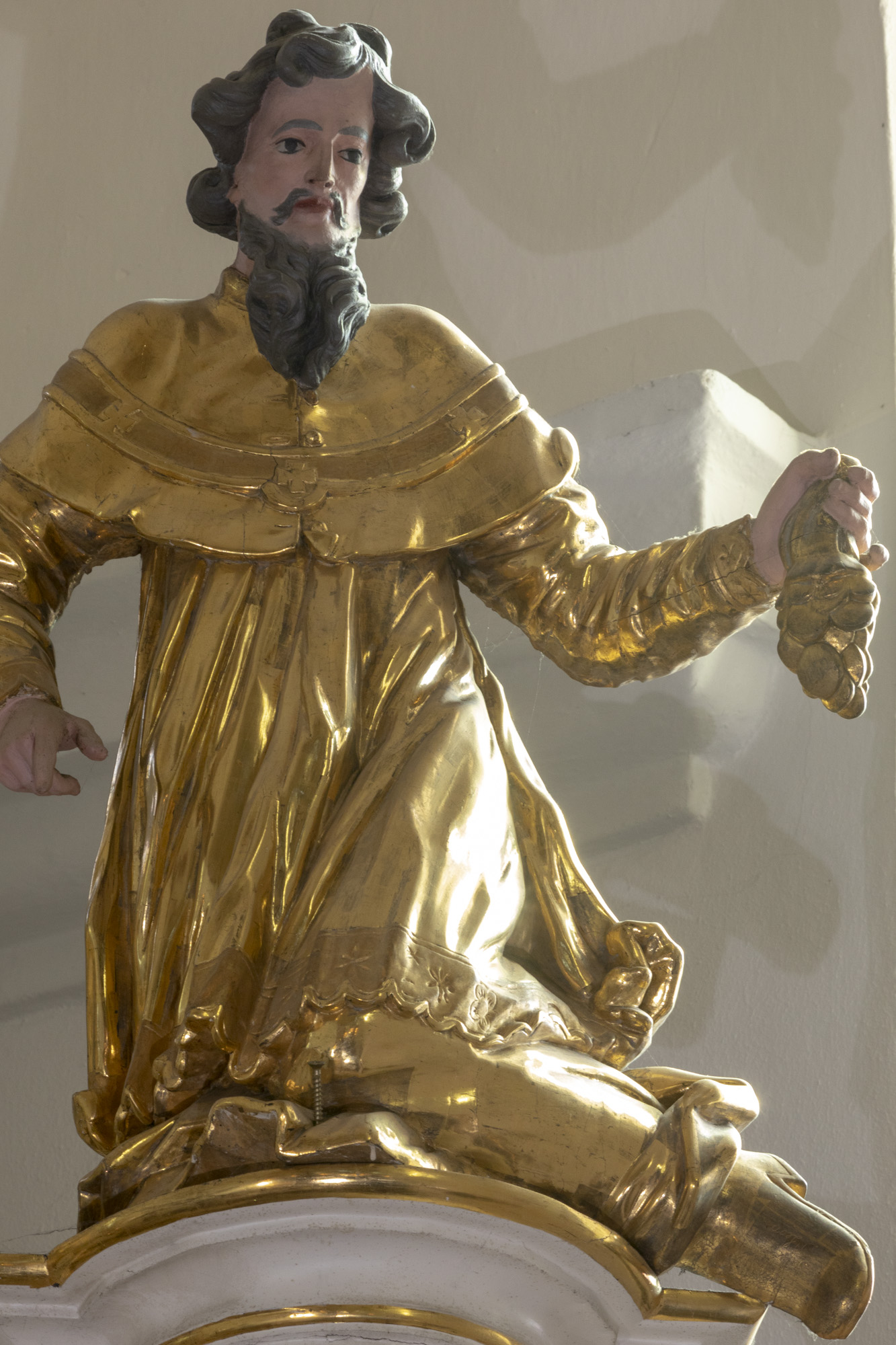 Postać w długiej szacie, komży i pelerynce, ręce rozłożone w lewej kadzielniczka (?)- postać klęcząca. Szaty drobno, obficie sfałdowane, dołem nieco rozwichrzone. Twarz z brodą włosy faliste. Rzeźba polichromowana karnacja ciemna, prawie brązowa; szaty złocone. Rzeźba umieszczona z boku zwieńczenia, ponad retabulum.