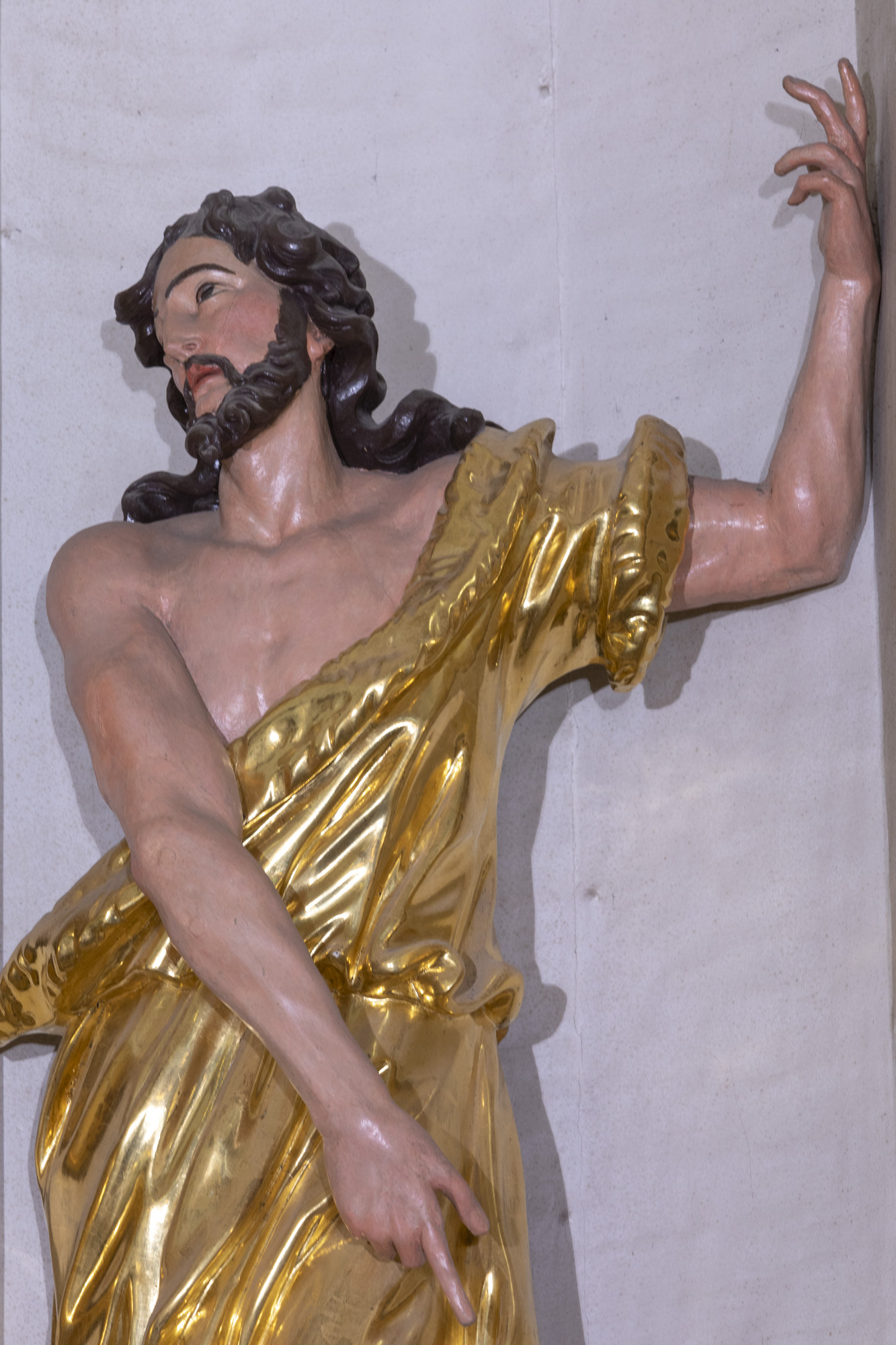 Postać świętego stojąca w lekkim kontrapoście. Ręka lewa uniesiona ku górze, prawa skierowana w dół, wskazuje baranka leżącego u stóp świętego z lewej prawej strony. Tors i nogi do kolan obnażone. Głowa lekko uniesiona. Twarz z małą brodą, włosy opadają faliście na ramiona. Szata obficie, drobno sfałdowana. Karnacja cielista, szata złocona. Rzeźba znajduje się w retabulum. |