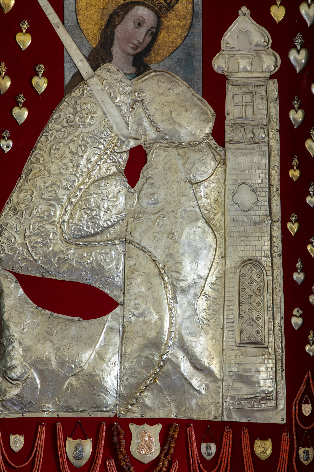 | Opis | Pierwotnie obraz o wymiarach 100 cm x 75 cm, obecnie zachowany fragment autentyczny o wymiarach 36 cm X 25 cm, przeniesiony w czasie konserwacji z podobrazia deskowego na płótno. Obraz z przedstawieniem głowy świętej Barbary, lekko pochylonej w lewą stronę, w ujęciu 3/4 na tle kolistego złocistego nimbu, w koronie królewskiej z kwiatonami i kameryzacją. Włosy brązowe długie, karnacja blado różowa. Dolną część postaci przykrywa sukienka zdobiona ornamentem o motywach geometrycznych roślinnych w swobodnym fantazyjnym układzie. W górnej części wysunięty ukośnie miecz, z lewej strony wzdłuż postaci – wysmukła wieża zwieńczona zdwojoną kopułą. Korona królewska, złotego koloru wysadzona różnokolorowymi kamieniami. |