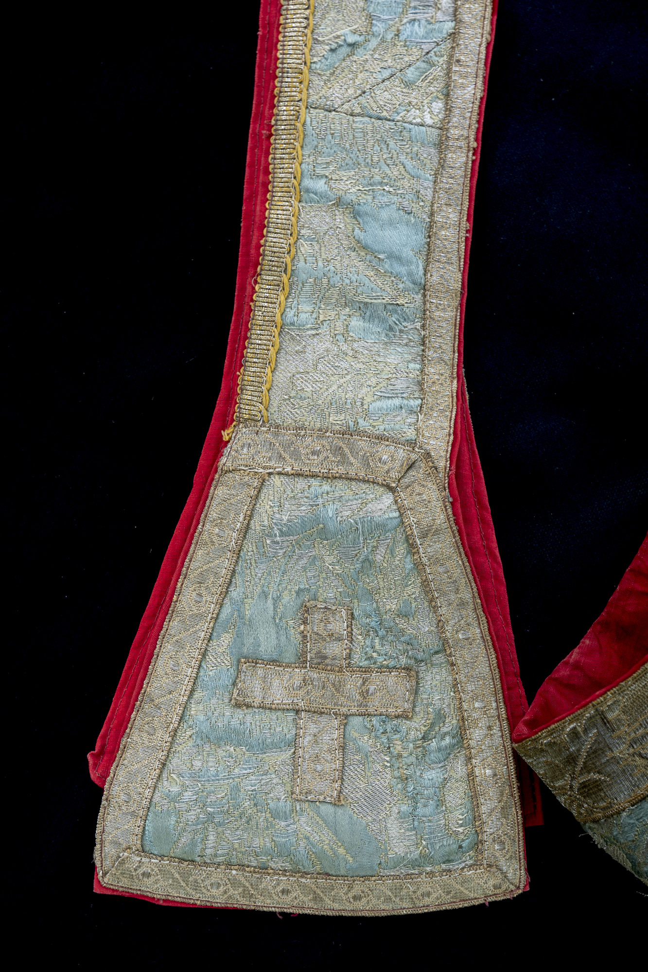 Boki frontu i pleców – Pierwsza połowa XVIII wieku. Motyw liści paproci i rozet w brokattelli srebrnej tworzy tak zwany wzór koronkowy tło błękitne, atłasowe, wzorzyste. Welum i stuła z tkaniny boków. Kolumna pleców – druga połowa XVIII wieku na tle złotej brokatelli rytmiczny motyw palmet liściastych o tle jasnobrązowym, atłasowym. W środkach palmet motyw rozet, pieprzu tureckiego i gałązki kwietnej w nici stalowo-niebieskiej, oliwkowej i srebrnej. Kolumna frontu – druga połowa XVIII wieku z fragmentów pasa kontuszowego (wciąż i głowy). We wciążu paski złote na przemian z ceglastymi. W ceglastych – pełzająca wić z goździkiem i różą. W złotych- rozeta. |