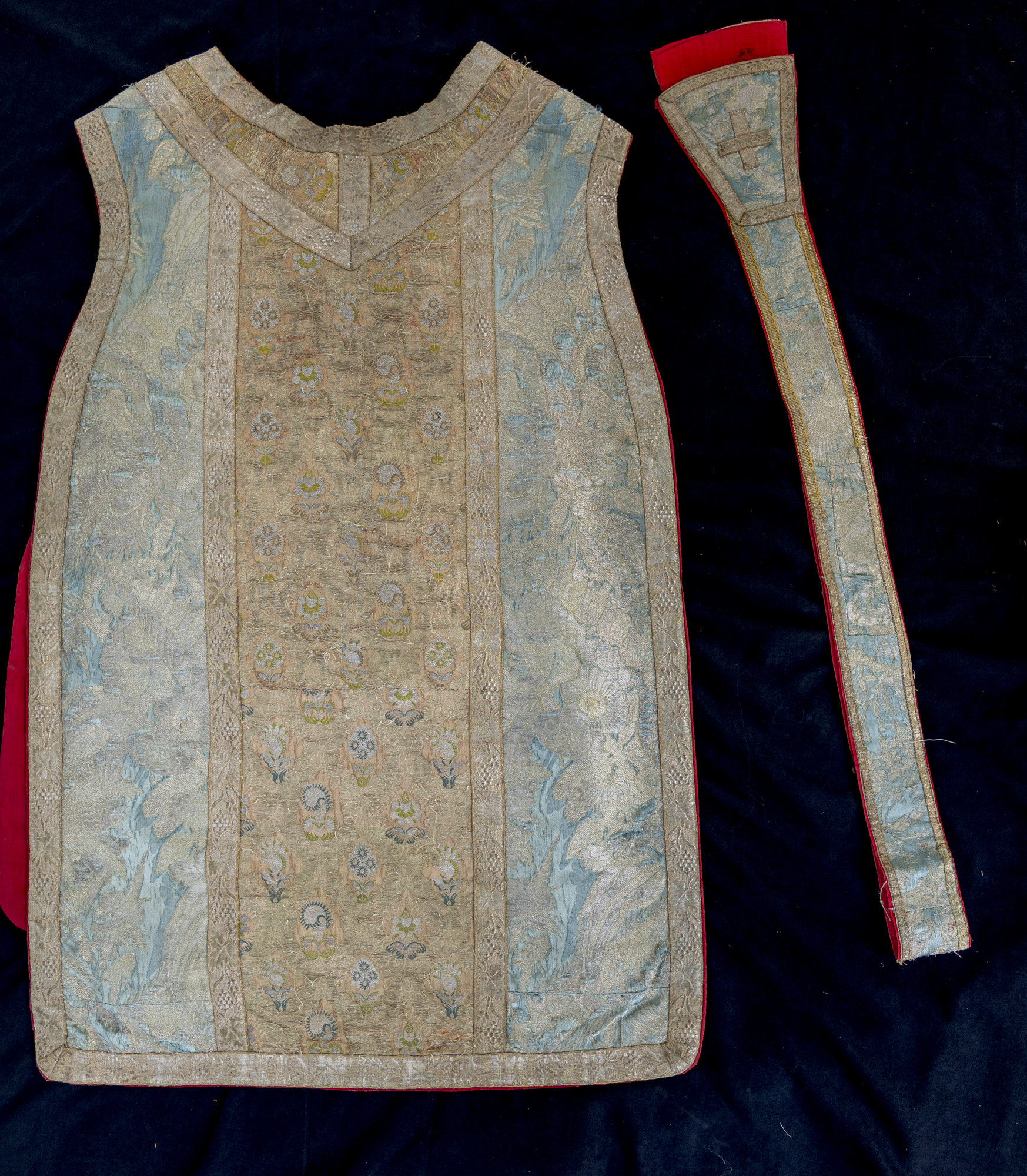 Boki frontu i pleców – Pierwsza połowa XVIII wieku. Motyw liści paproci i rozet w brokattelli srebrnej tworzy tak zwany wzór koronkowy tło błękitne, atłasowe, wzorzyste. Welum i stuła z tkaniny boków. Kolumna pleców – druga połowa XVIII wieku na tle złotej brokatelli rytmiczny motyw palmet liściastych o tle jasnobrązowym, atłasowym. W środkach palmet motyw rozet, pieprzu tureckiego i gałązki kwietnej w nici stalowo-niebieskiej, oliwkowej i srebrnej. Kolumna frontu – druga połowa XVIII wieku z fragmentów pasa kontuszowego (wciąż i głowy). We wciążu paski złote na przemian z ceglastymi. W ceglastych – pełzająca wić z goździkiem i różą. W złotych- rozeta.