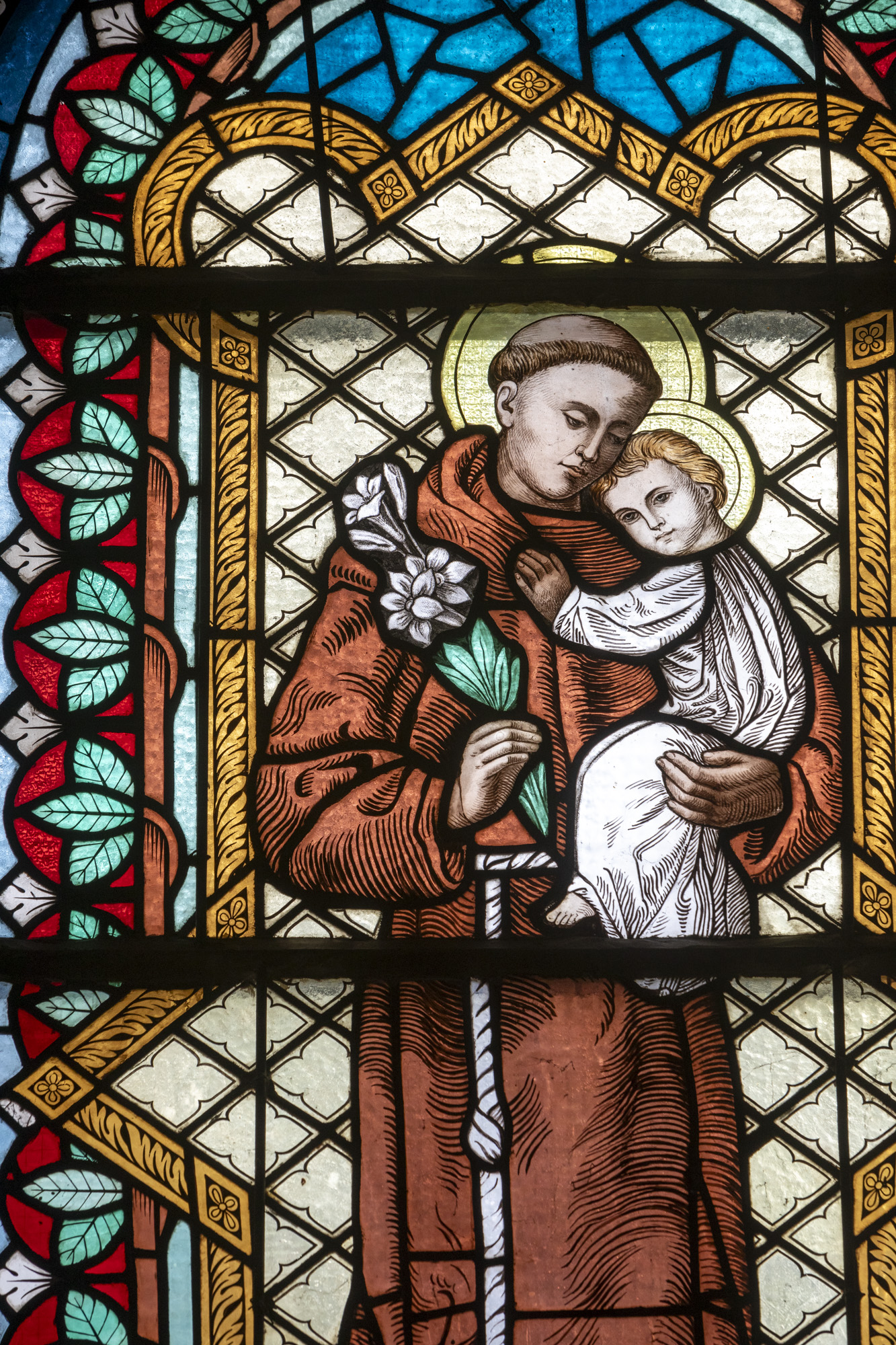 Witraż jest osadzony w podłużnym, półkoliście zamkniętym oknie. Kompozycja dwupostaciowa przedstawia św Antoniego z dzieciątkiem, ujętych w kilkustrefowej bordiurze. Świętym pokazany jest w pełnej postaci, w pozycji stojącej, z dzieciątkiem na lewej ręce i kwiatem lilii w prawej dłoni. Ubrany jest w brązowy habit, przepasany sznurem z głową pochyloną w kierunku dzieciątka. Twarz pozbawiona zarostu, z tonsurą, pokazana jest na tle złocistego nimbu. Ubrane w białą szatęDdzieciątko, lewą dłoń wspiera na klatce piersiowej Świętego Antoniego. Pod stopami świętego napis “S.Antoni ofiara Małżonków Rybińskich”. |
