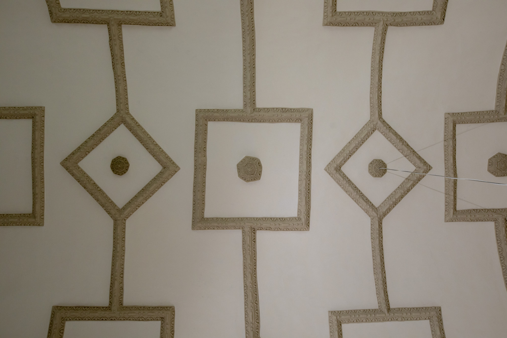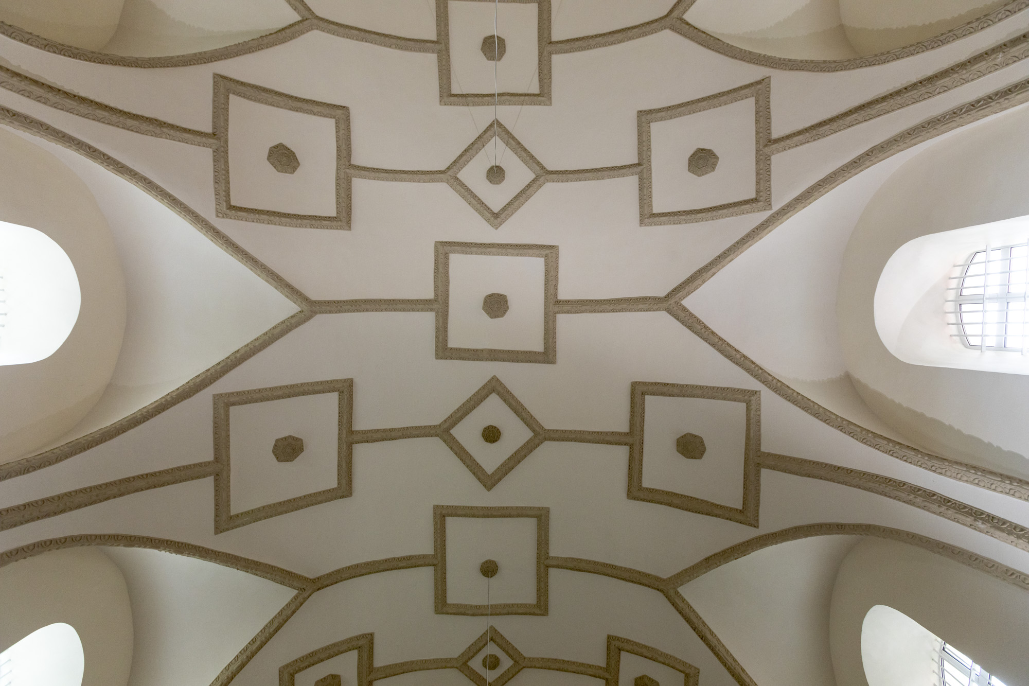 Beczkowe z lunetami sklepienie nawy ozdabia siatka żeber stiukowych w typie kalisko-lubelskim. Żebra biegną w poprzek beczki sklepienia, wiążą z sobą trzy pary lunet oraz dzielą pola między lunetami. Ciągi żeber przerywane są polami kwadratowymi ujętymi odcinkami żeber. W polach występują sześcioboczne guzy zdobione na wierzchu rozetą. Żebra trójboczne w przekroju (12x14 cm) zdobi po wierzchu astragal, po bokach kimation wolich oczu. Guzy z rozetą wzbogaca również astragal i wole oczy. |