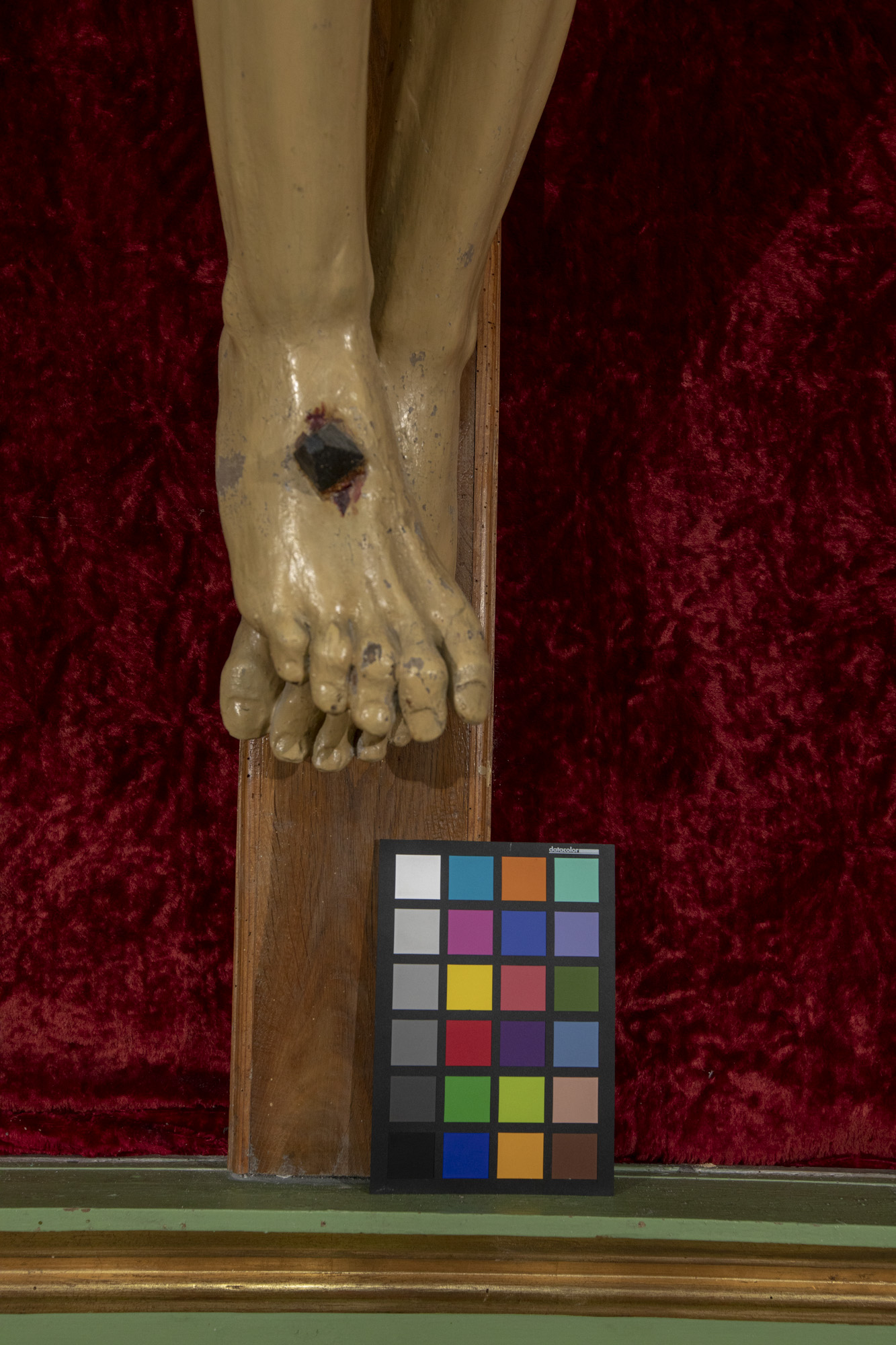 Rozpięty na rękach podniesionych pod kątem rozwartym. Głowa przechylona na prawy bark. Klatka piersiowa ułożona lekko w prawo. Nogi zgięte w kolanach skierowane W prawo, stopy prawa na lewej przybite wspólnym gwoździem. Perizonium, zebrane w węzeł przy prawym boku, opada fragmentem draperii; obrzeże tkaniny zdobione perełkowaniem. Pod napiętą skórą klatki piersiowej żebra zaznaczone są puklami. Twarz z długimi wąsami i brodą. Prawy splot włosów opada głęboko na piersi. Karnacja beżowo-kremowa, białe perizonium. Broda, wąsy, włosy brunatne. |