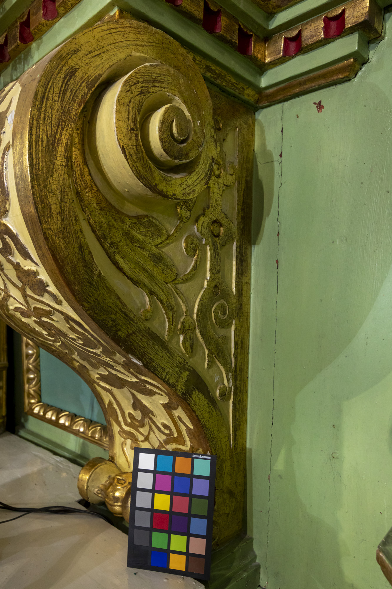 Fundacja Stanisława Tulkiewicza, proboszcza z Rybitw, Kompozycja dwustrefowa; w strefie górnej, na tle obłoków z koncertującymi aniołami i głowami aniołów Trójca św. oraz Matka Boska. W strefie dolnej, na tle krajobrazu widzianego w części osiowej obrazu - z lewej /od widza/ ss. Piotr, Paweł, Florian z atrybutami. Głębiej, pośród głów, wyróżnia się święty w mitrze, tonsura św. Franciszka oraz popiersie papieża. W narożu dolnym obramiona tabliczka z sygnaturą malarza: JOANNES DRUZE/SKI PINXIT 1634", cyfry rozdzielone są gmerkiem malarza z rybitwą w tarczy. Z prawej strony od widza wyróżnione są portretowo cztery święte ze św. Katarzyną Aleksandryjską, św. Klarą i św. Barbarą. W narożu dolnym obramiona tabliczka z nazwiskiem fundatora: "STANISLAUS/TULKIE- WICZ PLE/BANUS RIBITWE/SUA PECCNA EFFECIT"". Na globie przy boku Boga Ojca odbicie krajobrazowe z architekturą w mono- chromatycznej tonacji szarości. Obłoki, płaszcz Boga Ojca i glob oraz płaszcz św. Katarzyny, suknia Marii i horyzont w tonacjach srebrnych szarości. Wokół postaci Ducha św. rozjaśnienie rdzawo-różowe. Brązowy płaszcz św. Piotra i św. Klary. |