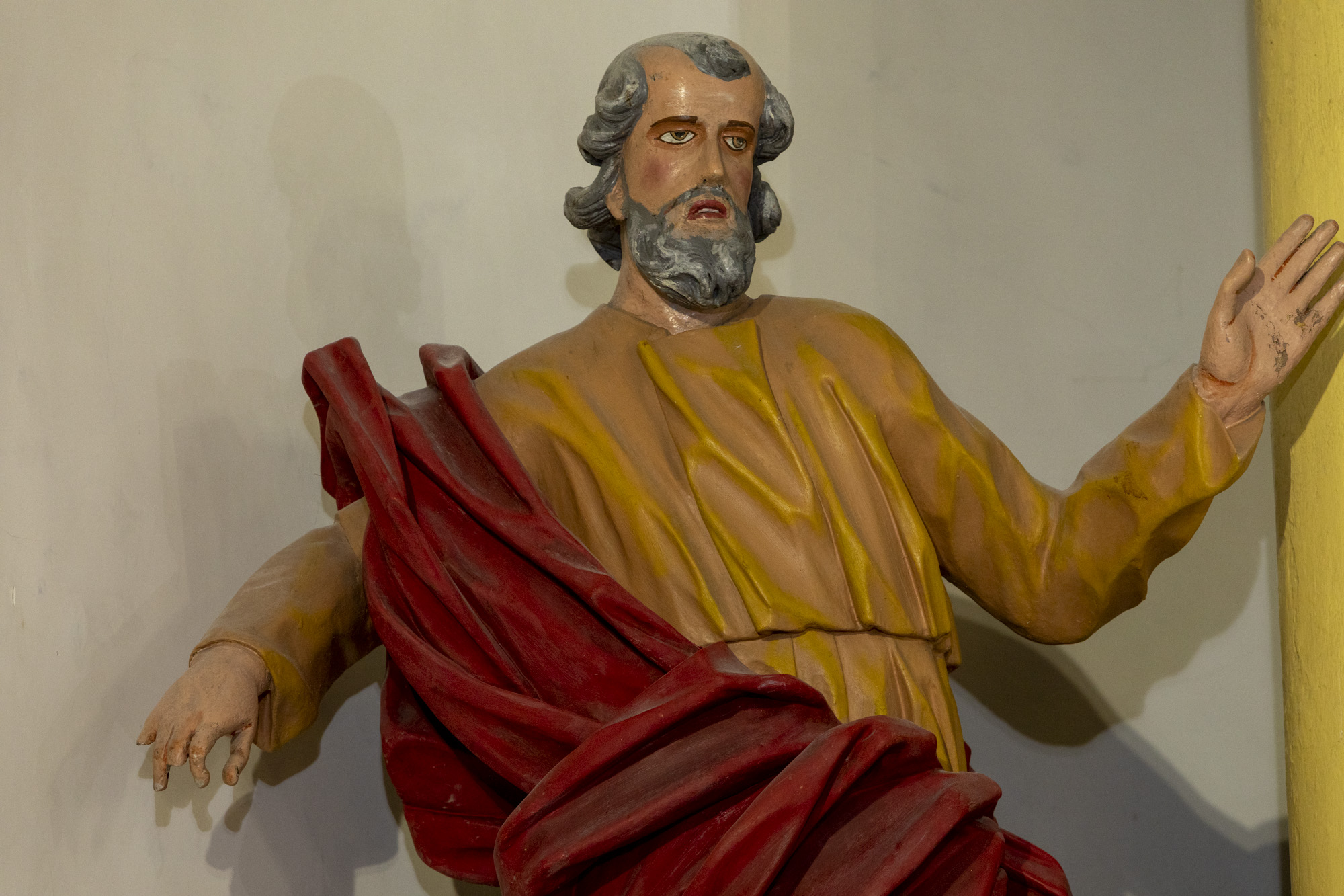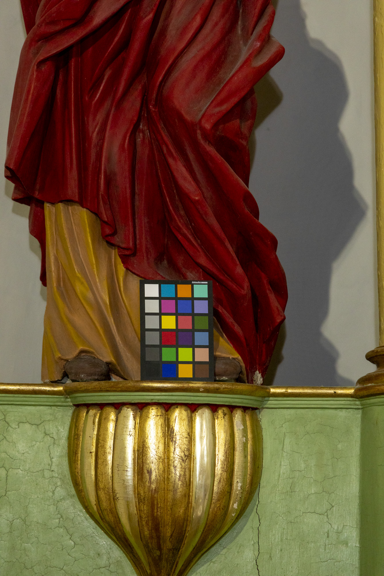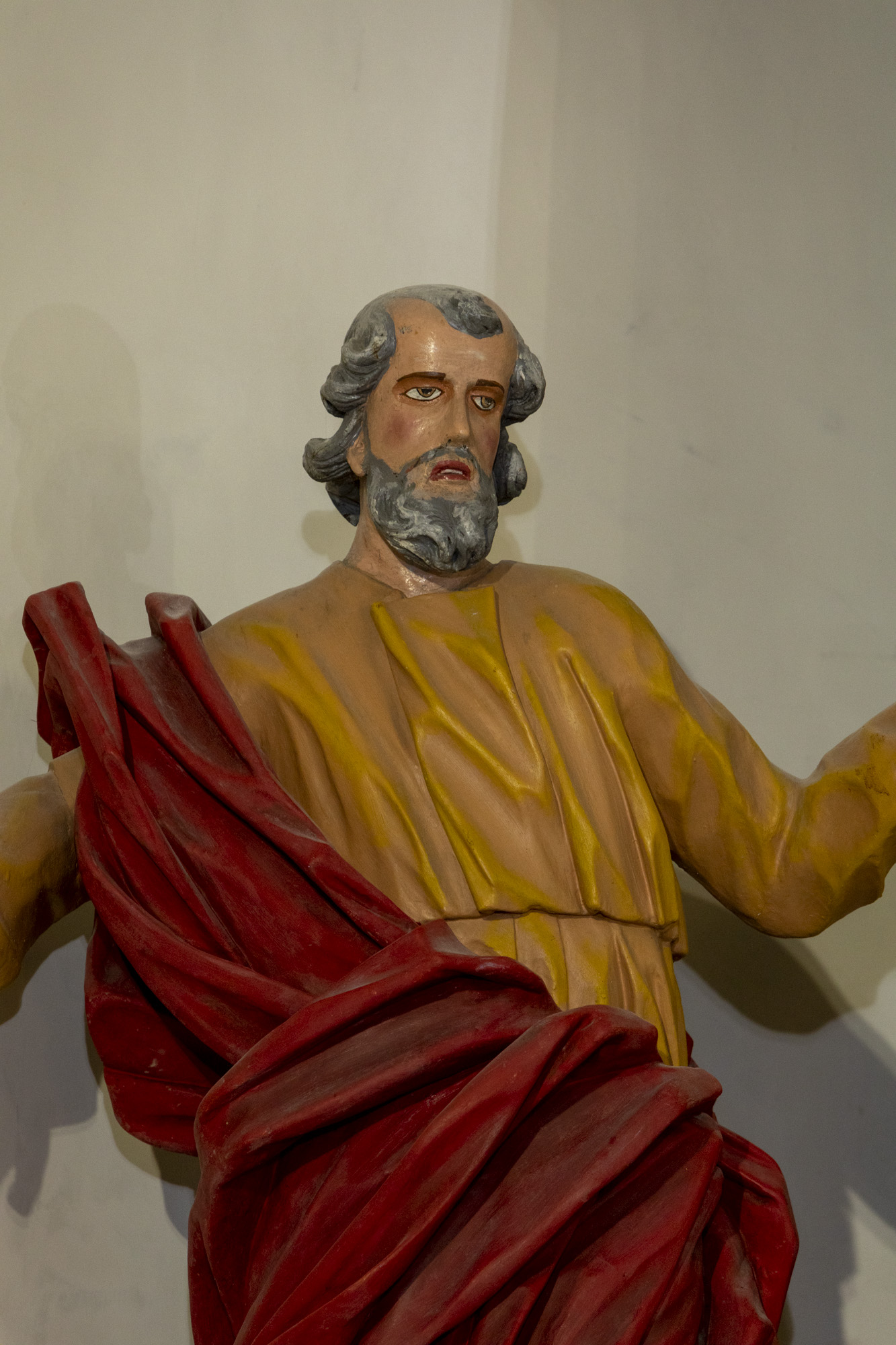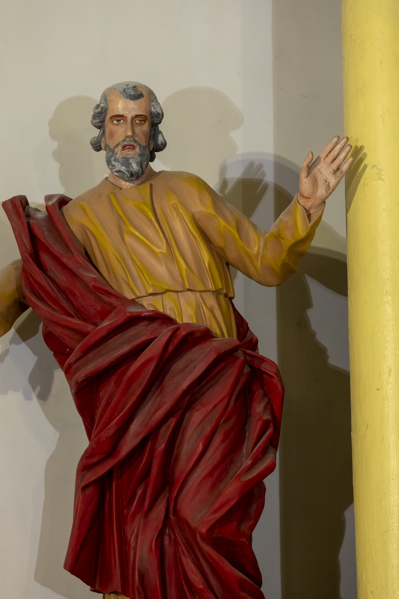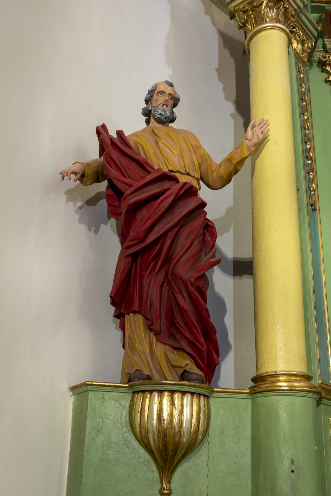 Postać en pied. Figura w esowo skręconej linii barokowego kontrapostu. Lewa noga ugięta, ręce odchylone od torsu, w prawej dłoni klucze, lewa uniesiona. Na żółto beżowej szacie czerwony płaszcz opadający łamaną linią od prawego ramienia. Pod posągiem cebulasta, puklowana konsola zakończona zwisem żołędziowym, złocona, zapewne XVII wiek. Odwrocie posągu dłubane nieckowo. |