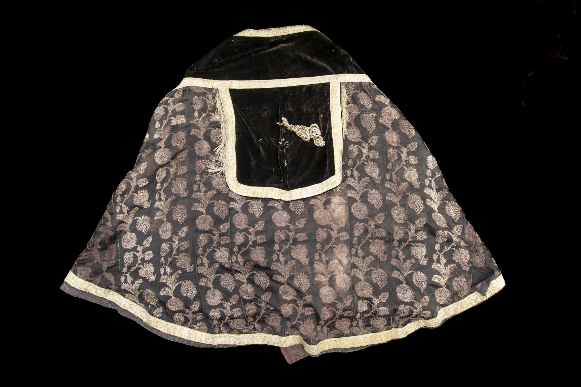 Kapa dołem wycięta półkoliście, wykonana z tkaniny w kolorze fioletowym, na której haftowane srebrną nitką motywy roślinno-kwiatowe. Boki wykonane z czarnego aksamitu. Na kapturze, aplikacja z motywem krzyża równoramiennego, z małą glorią. Ramiona krzyża w kształcie serc z wpisanym weń motywem kratki. Krzyż przetykany grubą, srebrną, metalową nitką. kaptur obiegają srebrne frędzle. Podszewka w kolorze fioletowym. zapinka wykonana z szeregu szeregu kółeczek, zakończonych po obu stronach mosiężnymi, ażurowymi kuleczkami. |