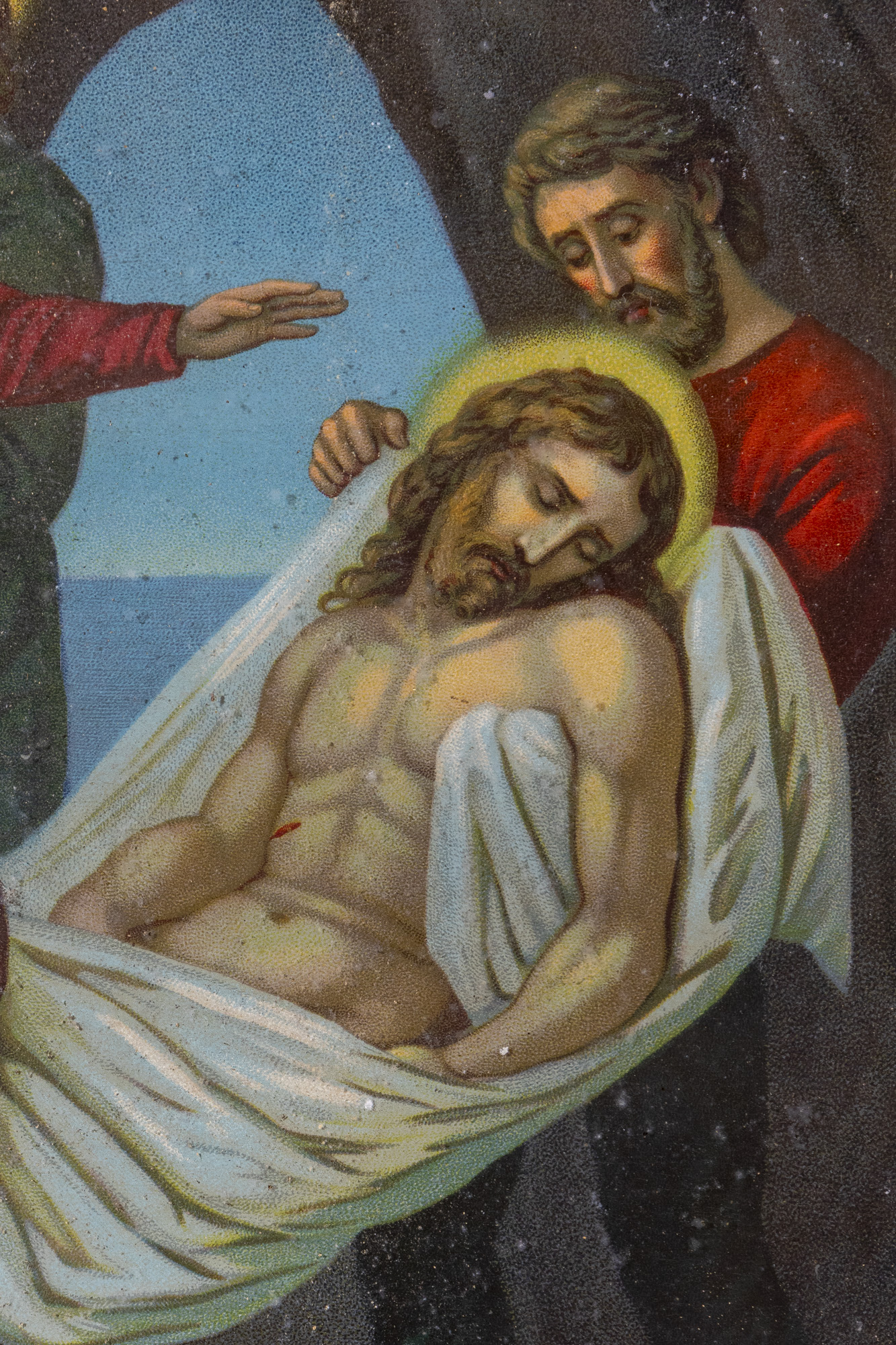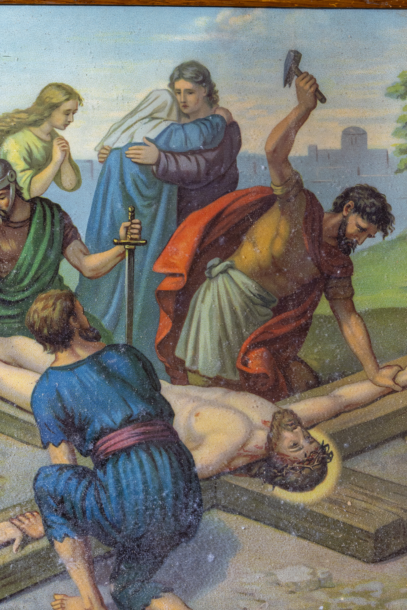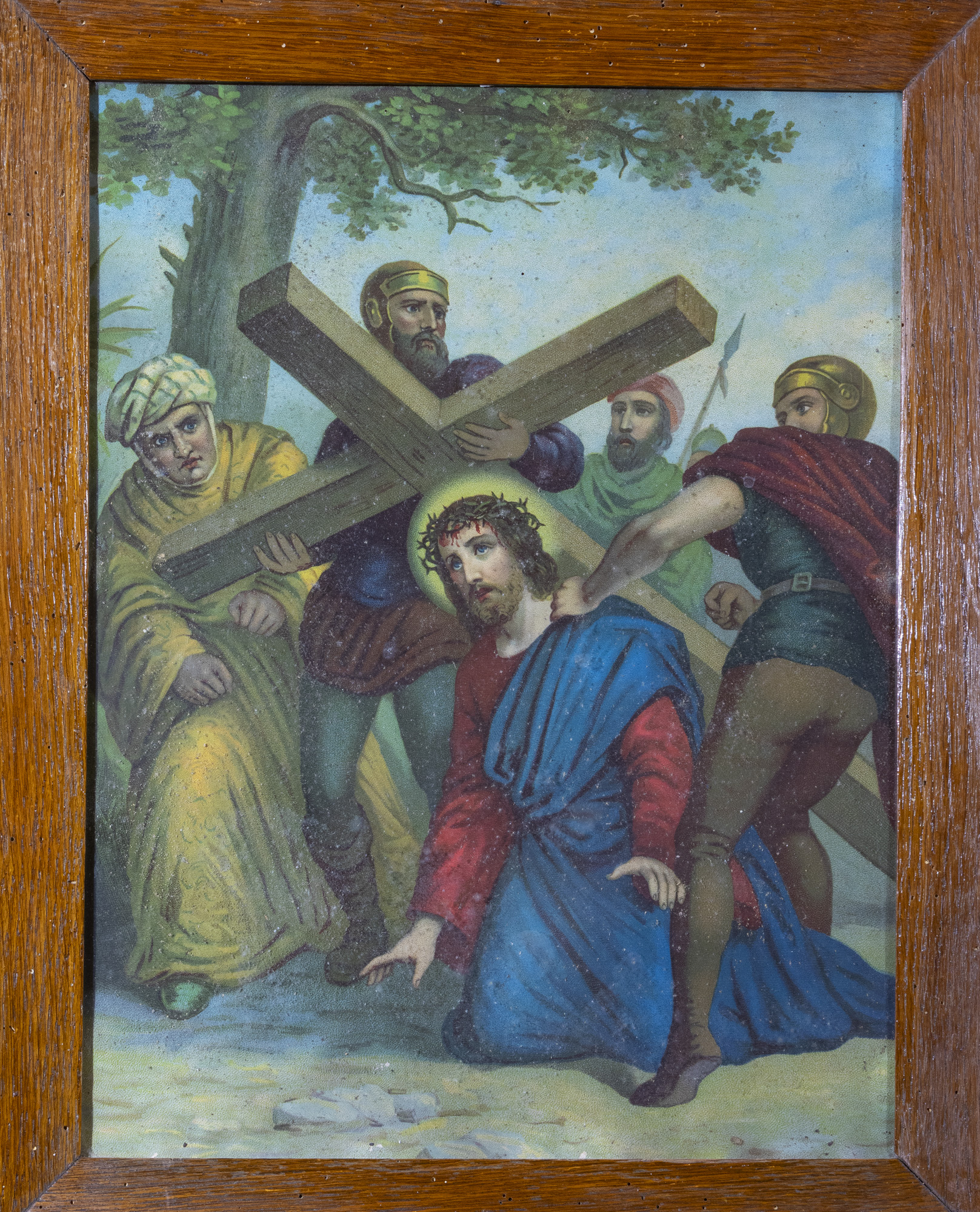Stacje wykonane w technice oleodruku ujęte w prostokątne dębowe ramki z szybką. Rozwieszone w górnej części ścian nawy. Droga krzyżowa przedstawiona w formie 14 stacji obrazuje najważniejsze wydarzenia z historii męki Chrystusa od wydania wyroku skazującego Go na śmierć, na Golgotę, męczeńską śmierć na krzyżu do złożenia do grobu. Chrystusa otaczają w drodze na golgotę najbliżsi a wśród nich Matka Boża, Maria Magdalena, święta Weronika, święty Józef z Arymatei a później także żołnierze i setnicy oraz grupa przyjaciół. Chrystus w scenach początkowych w powłóczystej czerwonej sukni i niebieskim płaszczu. W scenach końcowych i ukrzyżowaniu nagi z przepaską na biodrach. Postacie towarzyszące Chrystusowi w jaskrawych szatach o barwach czerwieni, zieleni i niebieskiej. Postacie drugiego planu w Ubiorach brązowych, szary. W tle poszczególnych scen schematyczny pejzaż. |