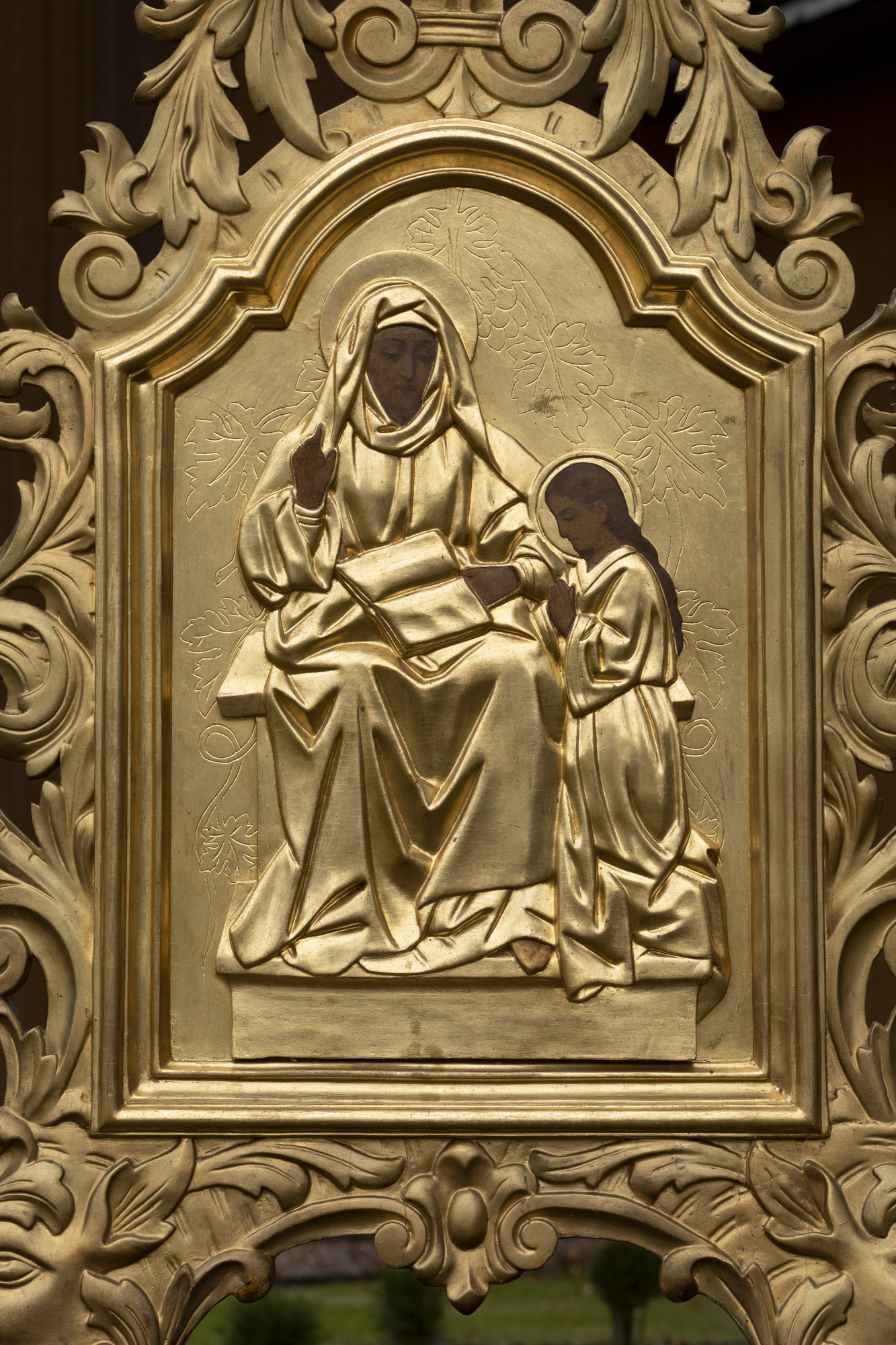 Feretron z płaskorzeźbami Maria NMP – Nauczająca i Chrystus z Gorejącym Sercem