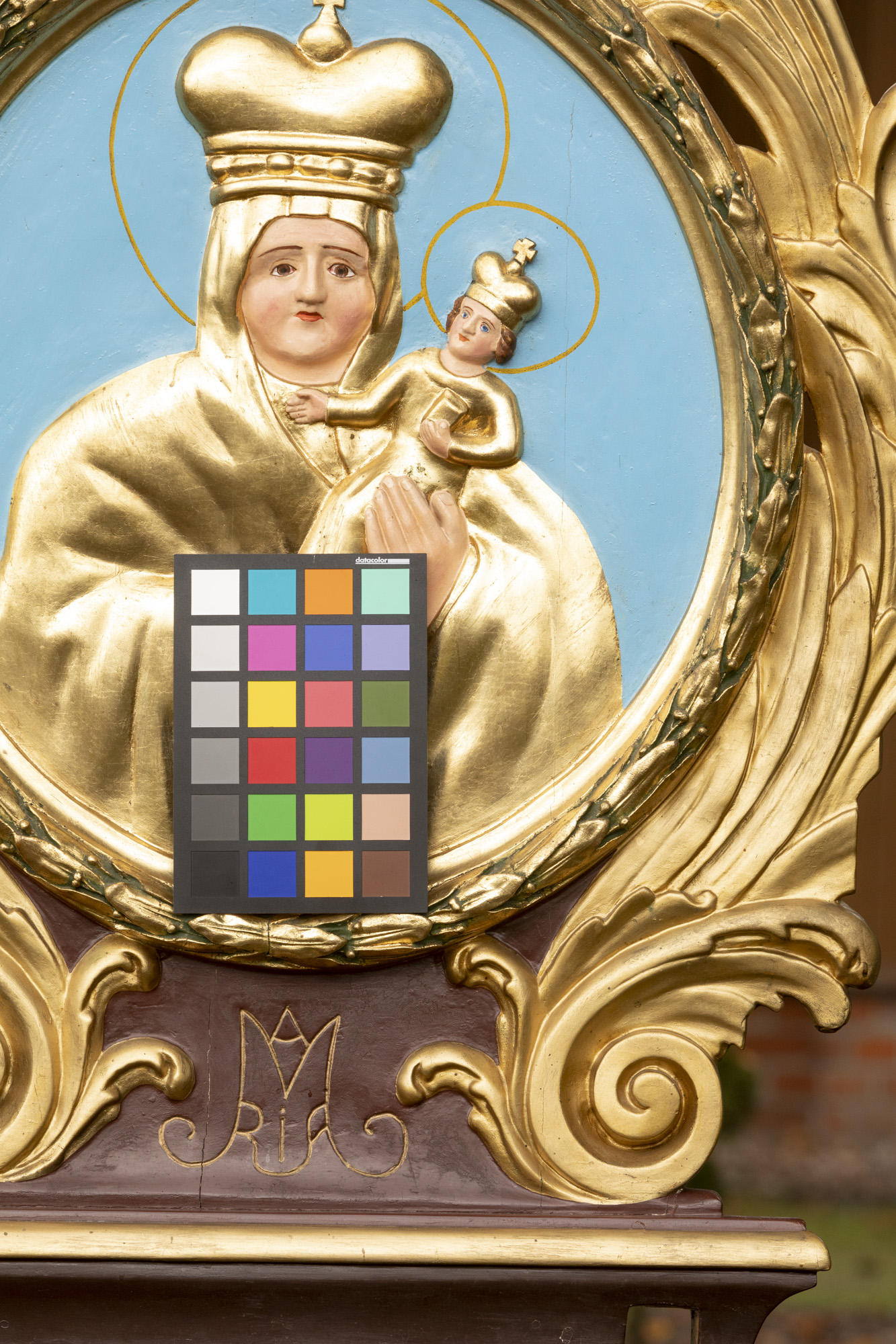 Płaskorzeźby w owalnych tondach obramionych wieńcem laurowym. Oprawa całości w formie rozłożystej wici akantowej rozłożonej symetrycznie, u dołu załamującej się spiralnie, u góry zwieńczonej pełną koroną z czterema kabłąkami, jabłkiem i krzyżem kotwicowym. Poniżej oko opatrzności boskiej. Z jednej strony Matka Boska z Dzieciątkiem na lewym ręku, przedstawiona w półpostaci, w obszernych szatach i pełnej koronie na głowie. Tło neutralne błękitne. Z drugiej strony Św. Franciszek z Dzieciątkiem Jezus na ręku, przedstawiony w pełnej postaci, frontalnie. W prawym ręku z gałązką liliową, ubrany w habit zakonny. Tło neutralne. Modelunek obu postaci schematyczny o cechach naiwnego realizmu. |