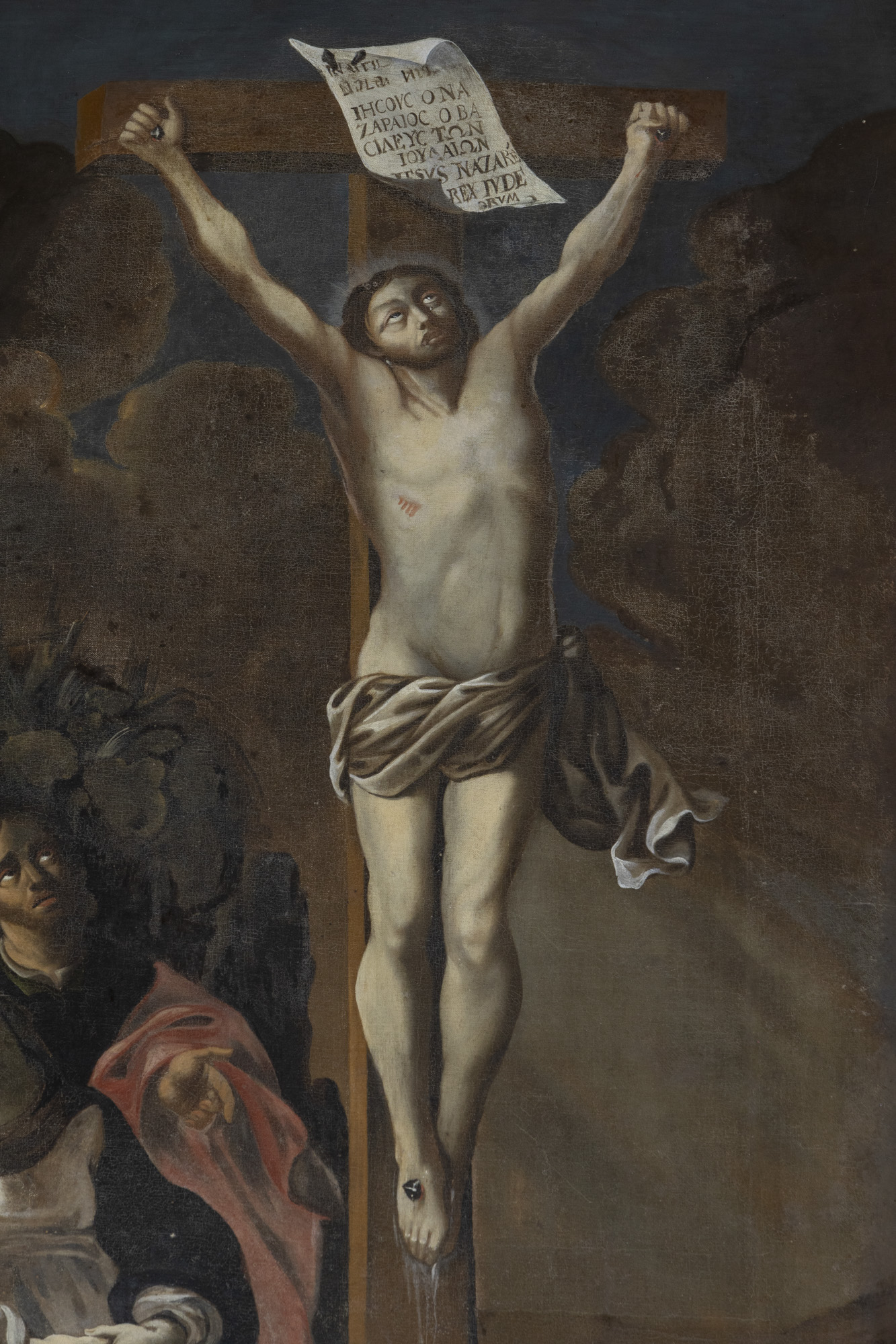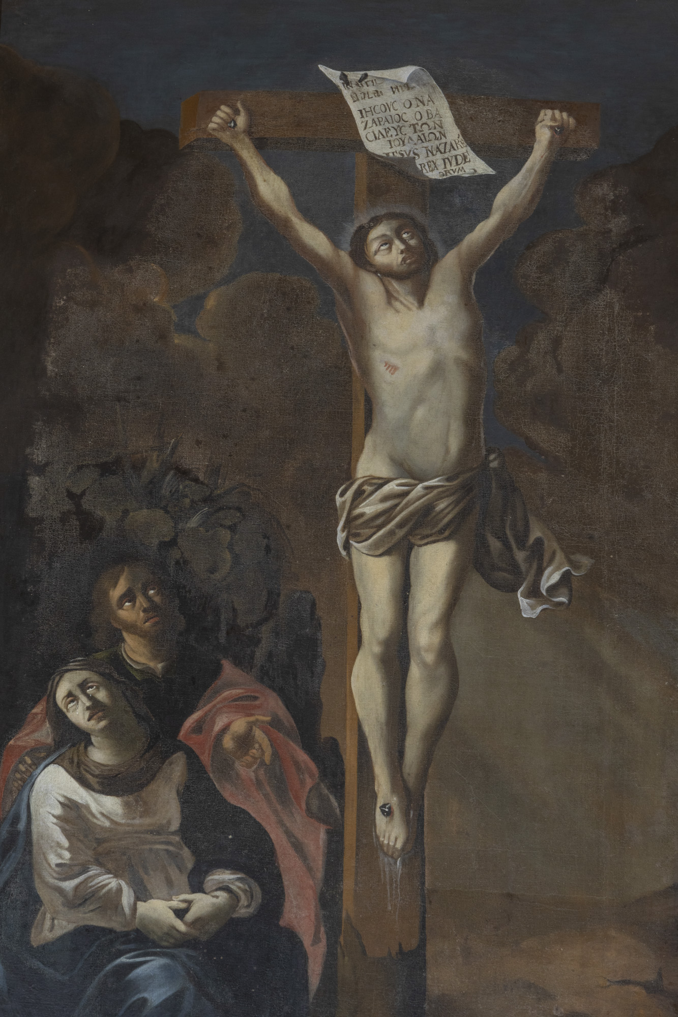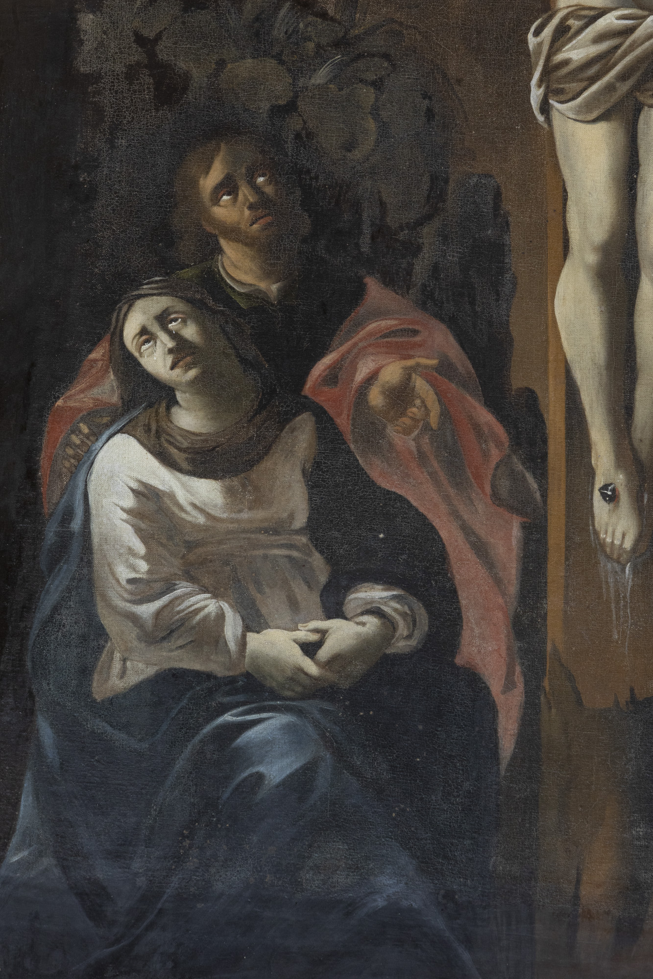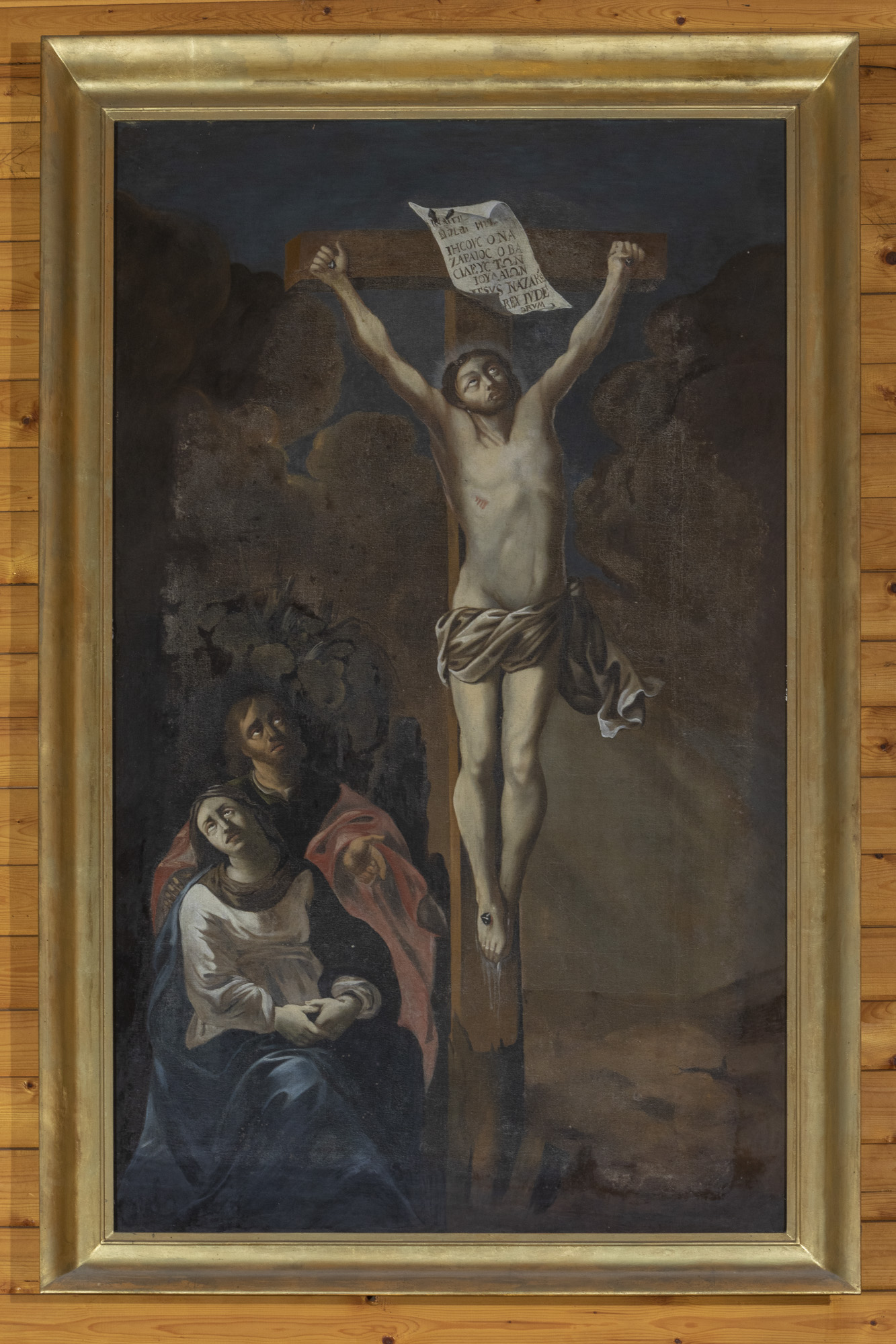 Na tle ciemno-stalowych obłoków i krajobrazu w części dolnej, postać Ukrzyżowanego w kolorze karnacji, perizonium białe, modelowane brązem. Z lewej, w przyklęku postać M. Boskiej Bolesnej w płaszczu niebieskim na białej sukni. Za Marią św. Jan w różowym płaszczu na czarnej sukni. Postać Ukrzyżowanego, głowy św. Jana i Marii oraz jej dłonie oświetlone światłem z lewej strony. |