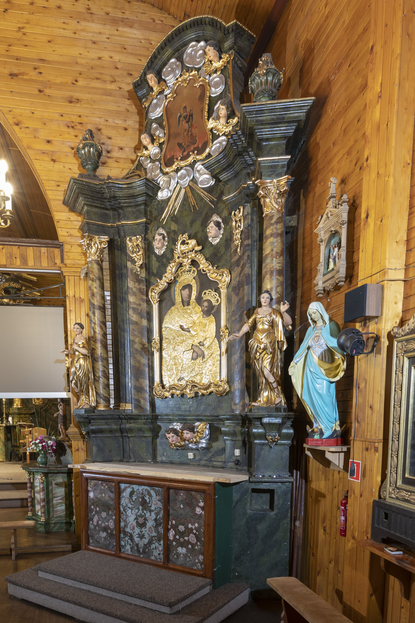 Architektoniczny, w narożu ścian nawy i tęczy. Na murowanej mensie skrzyniowej retabulum ujęte para kolumn z prześwitem Parafia rzym.-kat. i parą pilatsrów po stronie wewnętrznej pola środkowego Kolumny i pilastry dźwigają odcinki belkowania uproszczonego do impostów. Na impostach kolumn rokokowe wazony. Nasada ujęta parą spływów, zakończona gzymsem o łuku nad wieszonym. W polu środkowym ołtarza obraz M. Boskiej z Dzieciąt kiem. W polu nasady obraz św.Michala Archanioła. Na konsolach części cokołowej retabulum figury dwóch świętych kobiet. Antependium z kurdybanu. Polichromia olejna imitująca marmoryzowanie ciemno-zielone i zielone. Trzony kolumn i pilastrów marmoryzowane w tonacjach beżu i brązu. Partie snycerskie złocone. Obłoki nasady malowanie srebrne. |