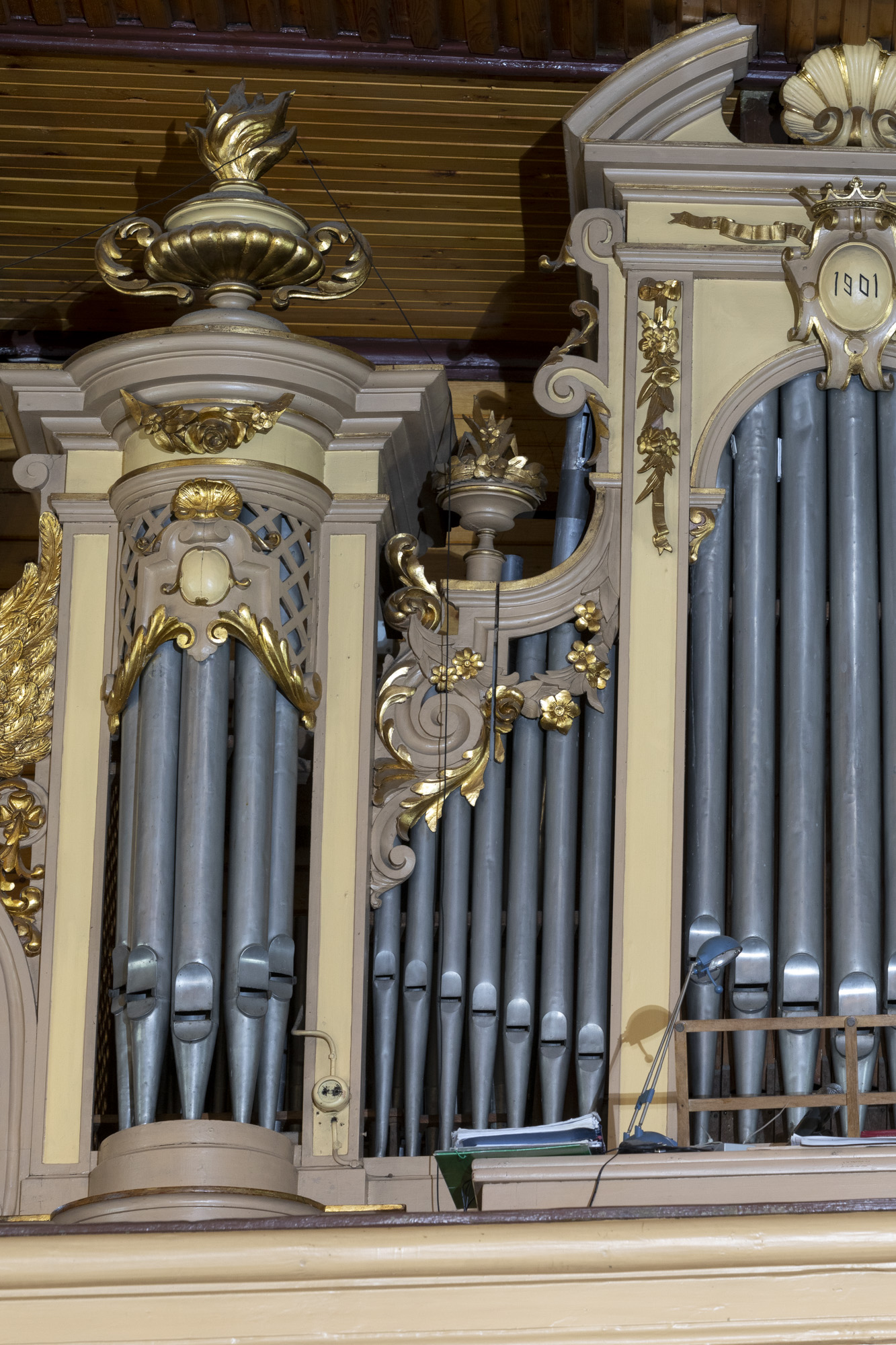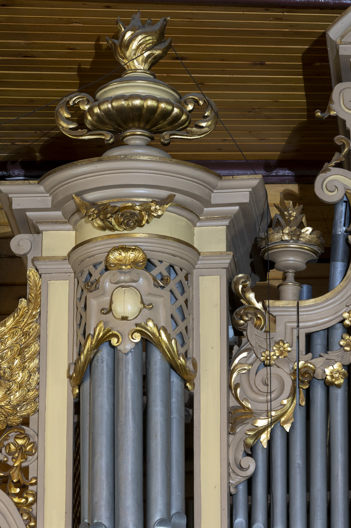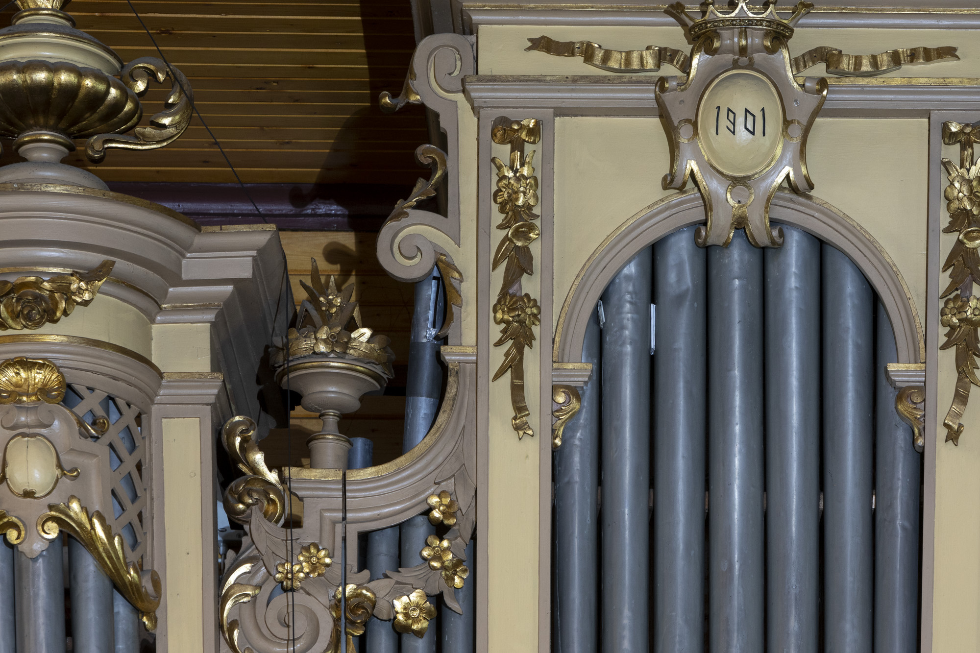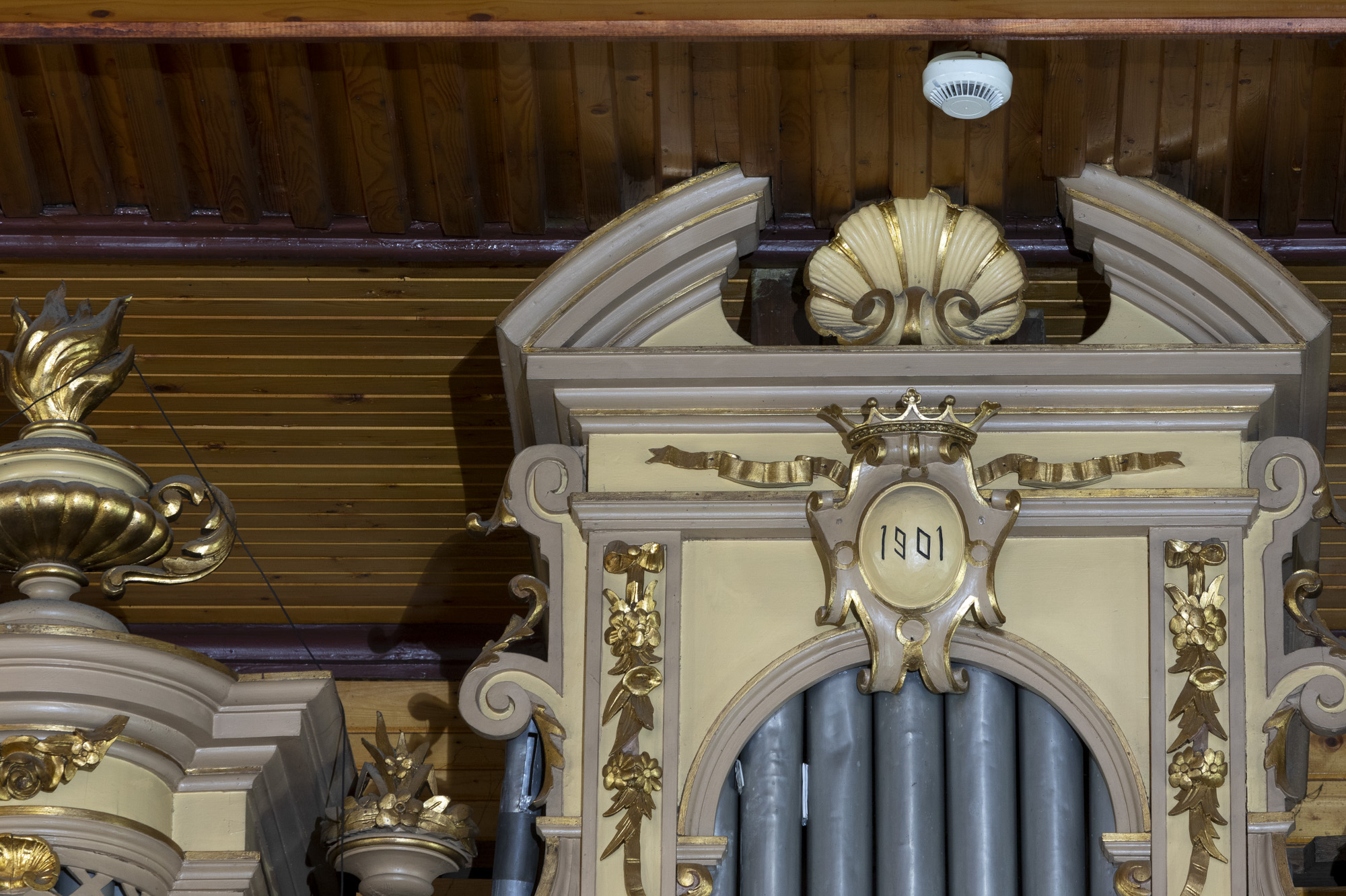 Instrument dęty, klawiszowy. Złożony z 31 piszczałek organowych i stroikowych wykonanych z metalu, w formie cylindrycznej. Piszczałki o różnej wielkości, zgrupowane w pięć zespołów ujętych w oddzielne obudowy. Napędzany mechanizmem powietrznym złożonym z miechów, zbiorników i wiatrownic - umieszczonych z tyłu i z boków instrumentu. Mechanizm klawiszowy o dwóch rejestrach. Prospekt organowy w trójdzielnej, osiowo skomponowanej obudowie architektonicznej. Dolna część dzielona płycinami, zwieńczona wydatnym załamanym gzymsem, występującym półkoliście na wysokości skrajnych przęseł. Nastawa złożona z ustawionej na osi - wyższej i szerszej części środkowej oraz dwóch niższych części skrajnych połączonych elementami o wykroju cęgowym. Część środkowa nastawy w którym na osi stylizowana muszla. Nad arkada w nadłuczu kartusz z koroną, z wypukłym tondem i datą 1901. Po bokach na płaszczyźnie lizen pionowe festony z ornamentem kwiatowym. Elementy skrajne prospektu analogiczne, z częścią środkową wysuniętą półkoliście do przodu, z gzymsowaniem dolnym i wieńczącym oraz gładkimi lizenami po bokach. W górnej, czołowej partii ażurowa kratka romboidalna, wić akantowa, motyw muszli i uskrzydlone główki anielskie. Nad całością znicz w formie wazonu, z puklowaniem na płaszczu dolnym i stylizowanymi płomieniami u góry. Po bokach części skrajnych ukazane z profila uskrzydlone głowy anielskie na żłobionych wspornikach o wykroju esowym. Łączniki z częścią środkową w formie ram o wykroju cęgowym, z wicią akantową i wazonami u góry. Elementy drewniane malowane olejno na kolor beżowy, detal i inne dekoracje złocone. |